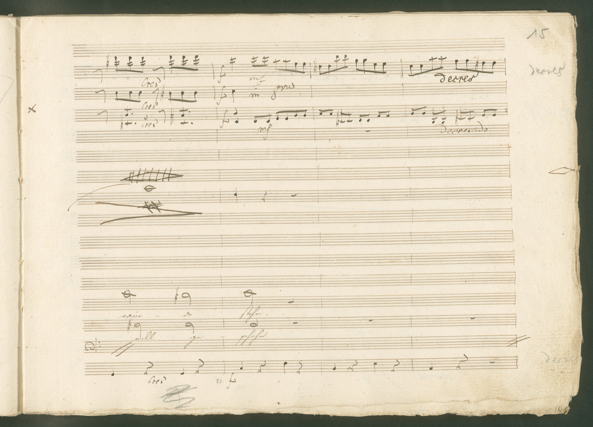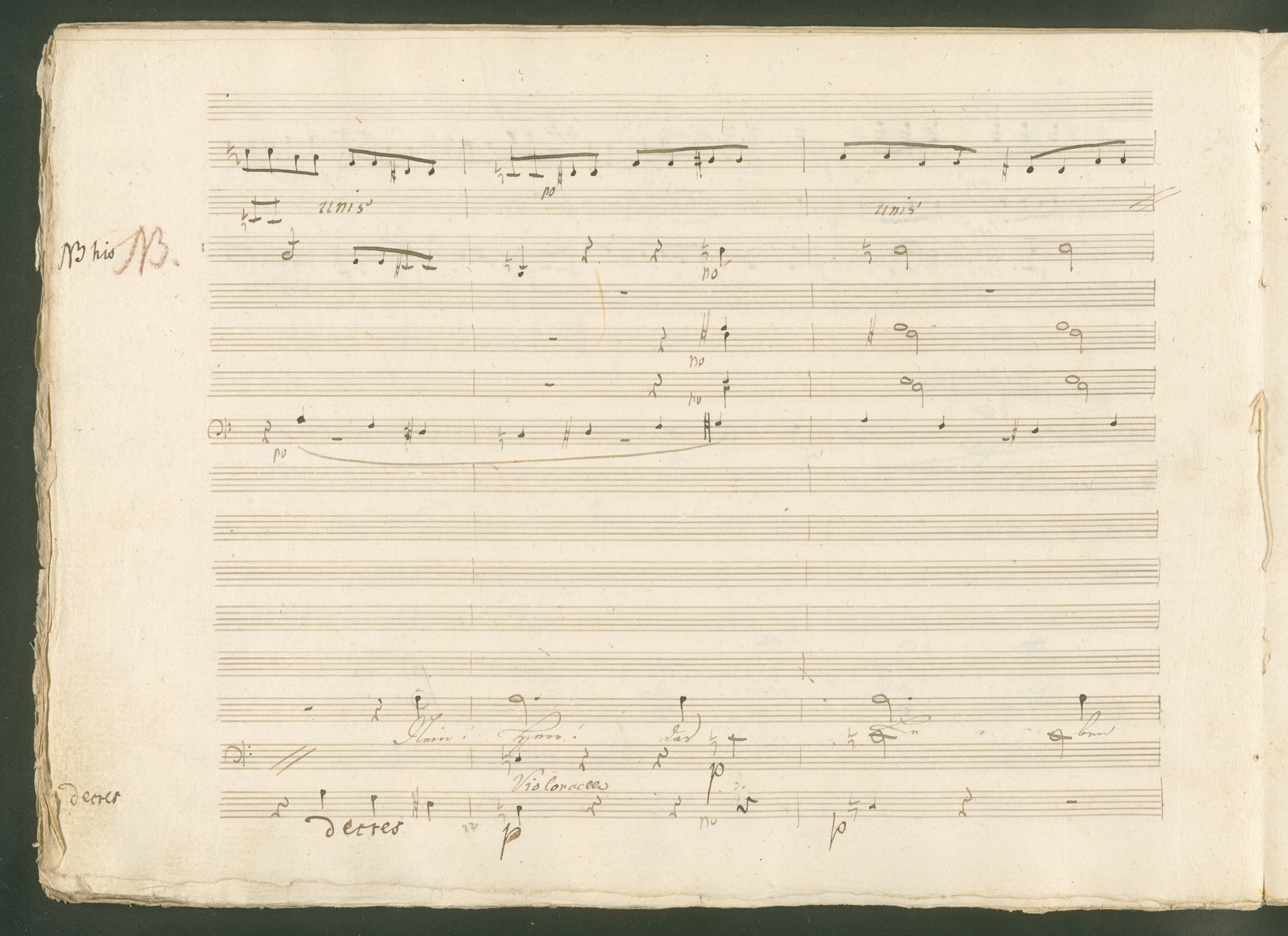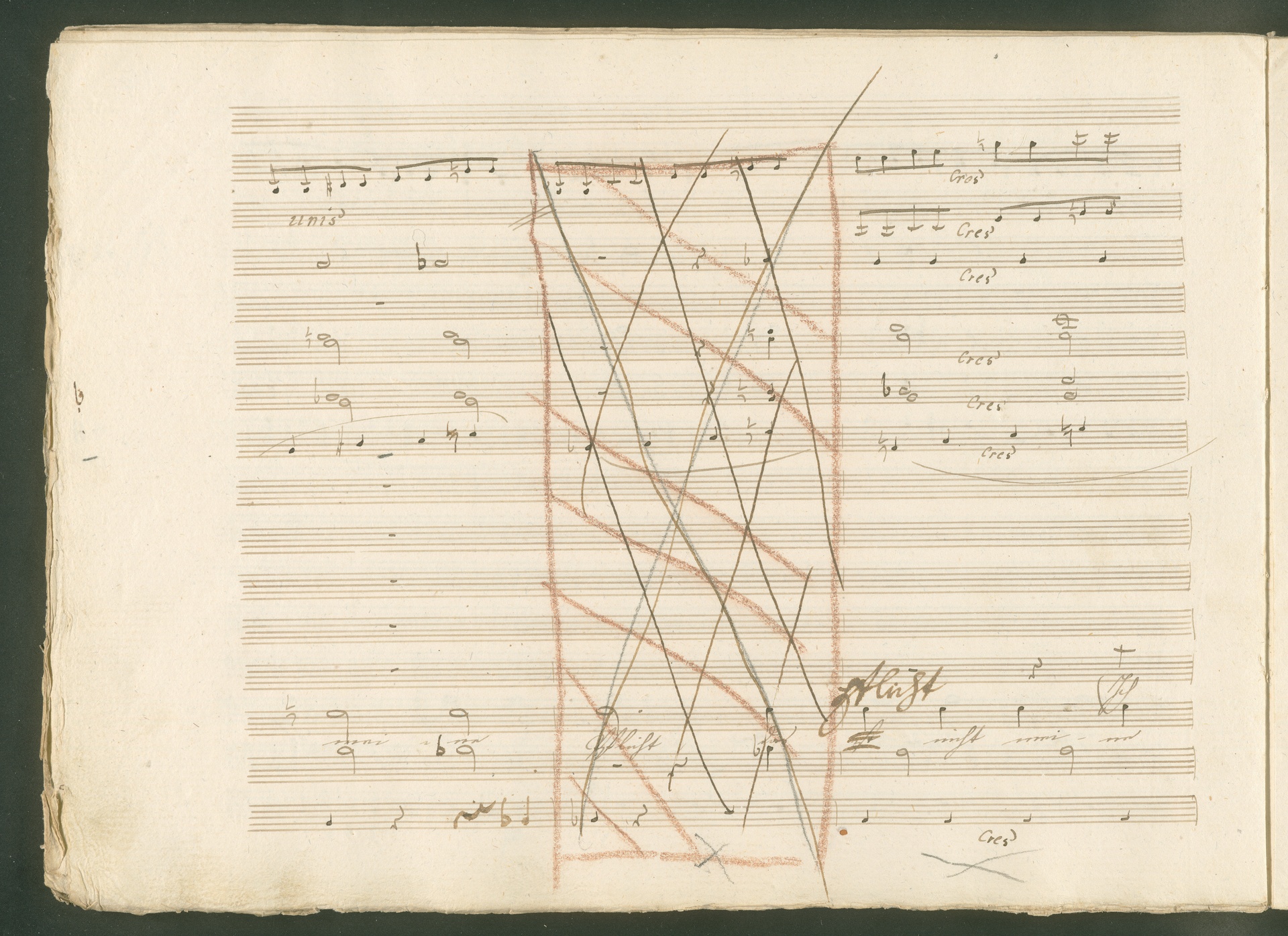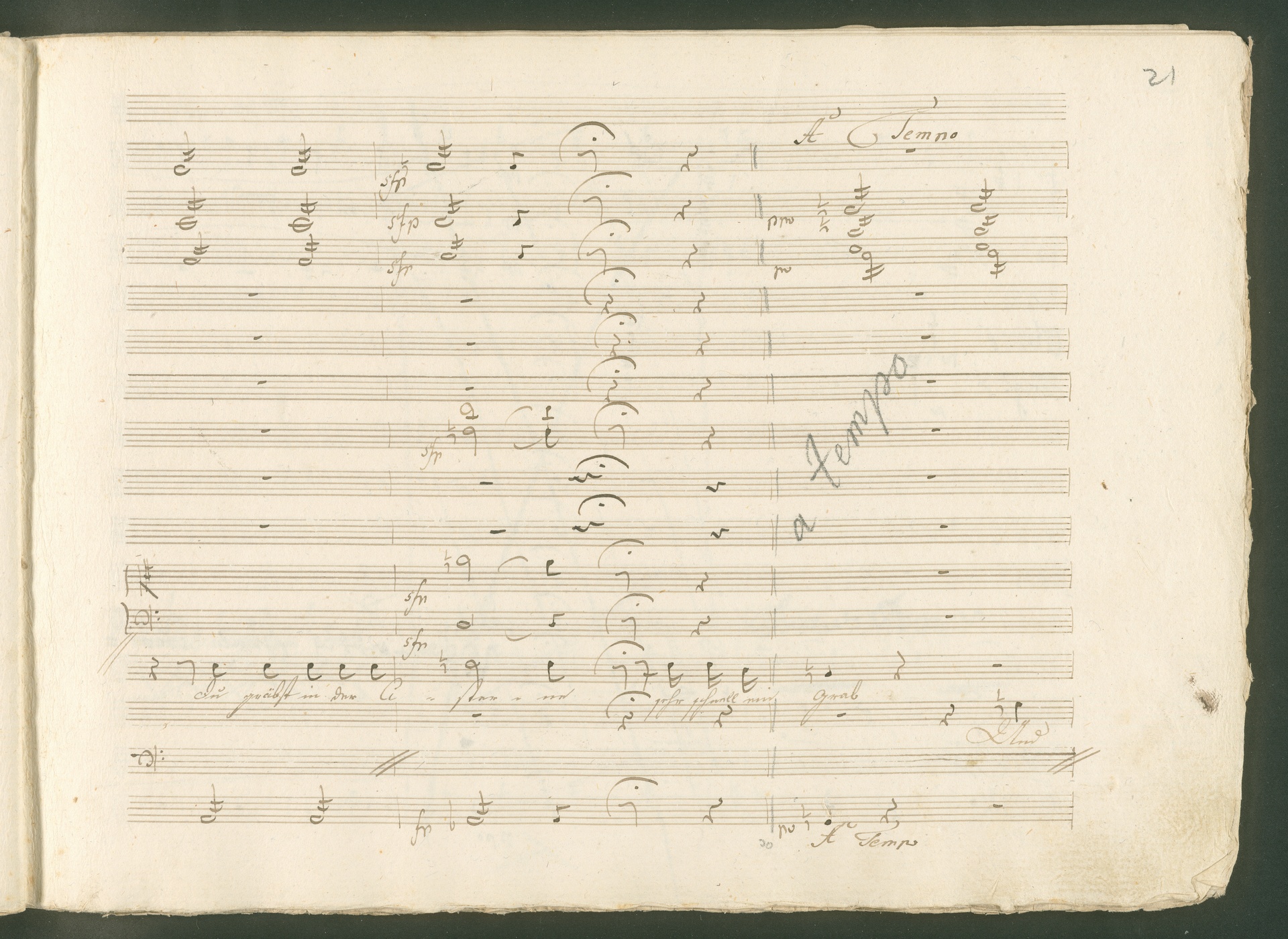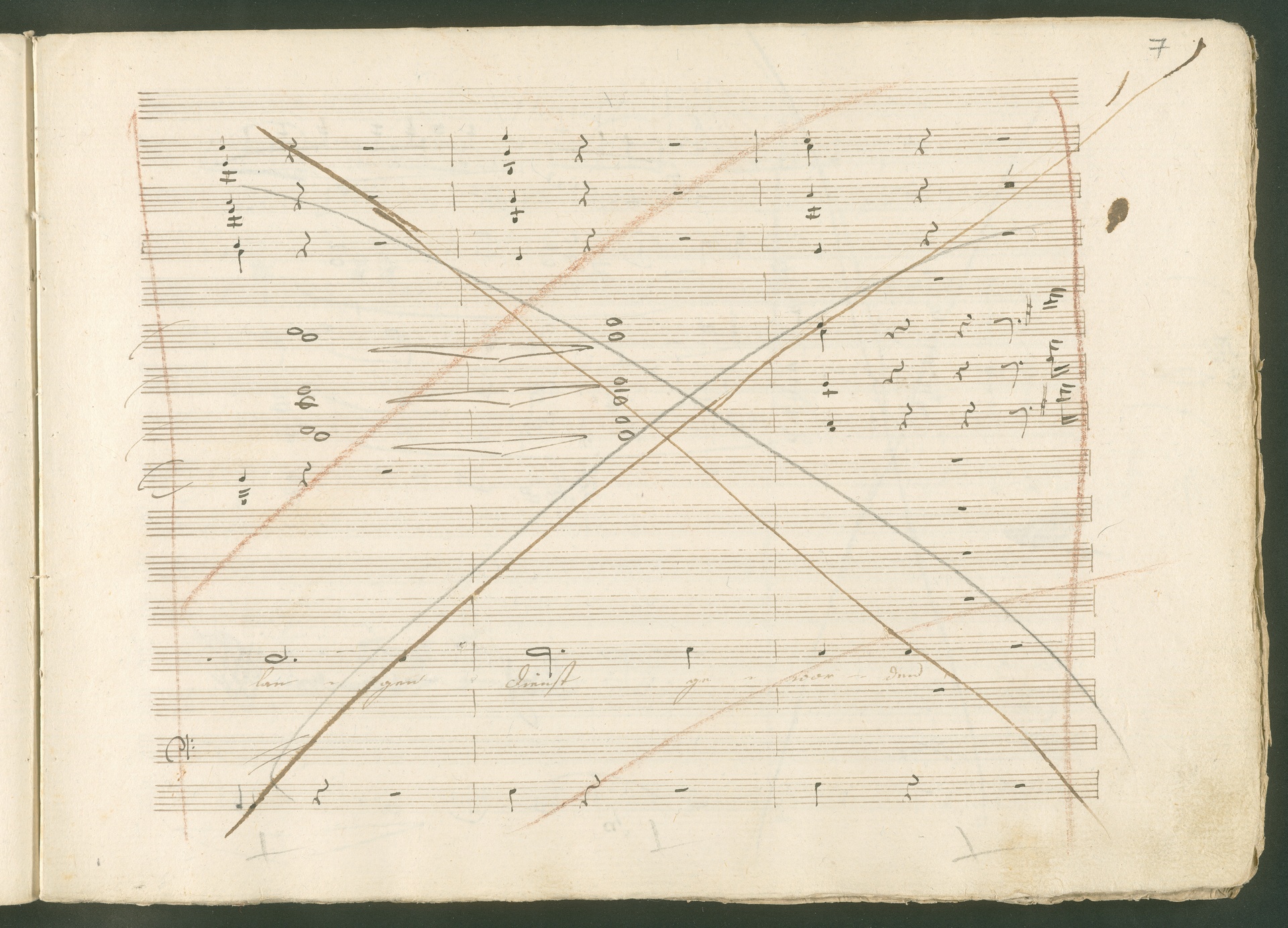 Abgebildet ist eine Kopistenabschrift des Duetts Pizarro/Rocco "Jetzt, Alter, jetzt hat es Eile" aus Beethovens einziger Oper Leonore bzw. Fidelio. Der Kopist schrieb das Duett in der Fassung von 1806, Beethoven korrigierte diese im Zuge der Umarbeitung der Oper 1814. Bei dieser letzten Revision straffte Beethoven den Ablauf durch gezielte Streichungen, die die Wirkung verstärkten und das Tempo der Handlung beschleunigten. Auch die vorliegende Abschrift trägt solche Eingriffe: auf etlichen Blättern kürzte Beethoven Takte oder ganze Phrasen. So gleich zu Beginn auf den beiden ersten Notentextseiten: Pizarro beginnt in der Fassung von 1806, wie sie der Kopist schrieb, mit dem Wortlaut: "Jetzt, Alter, Alter, jetzt hat es Eile!". Er singt quasi atemlos - es hat ja Eile - mit Pausen versetzt auf fünf Takte verteilt. Beethoven korrigiert dies, in dem er die zwei Takte "Alter, Alter" streicht bzw. ausradiert und die Phrase auf drei Takte zusammenzieht. Erst jetzt entsteht tatsächlich der Eindruck, Pizarro sei gehetzt - "Jetzt, Alter, jetzt hat es Eile." Nur ein kleines Detail und im Manuskript keine große Korrektur - aber welche dramaturgische Wirkung erzielt Beethoven damit! (J.R.)