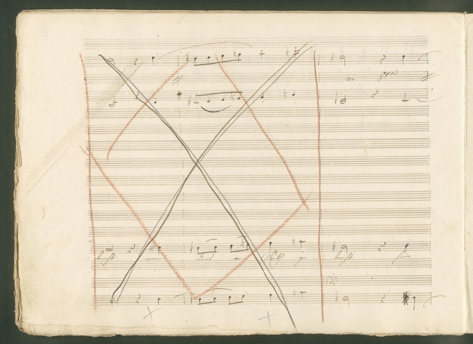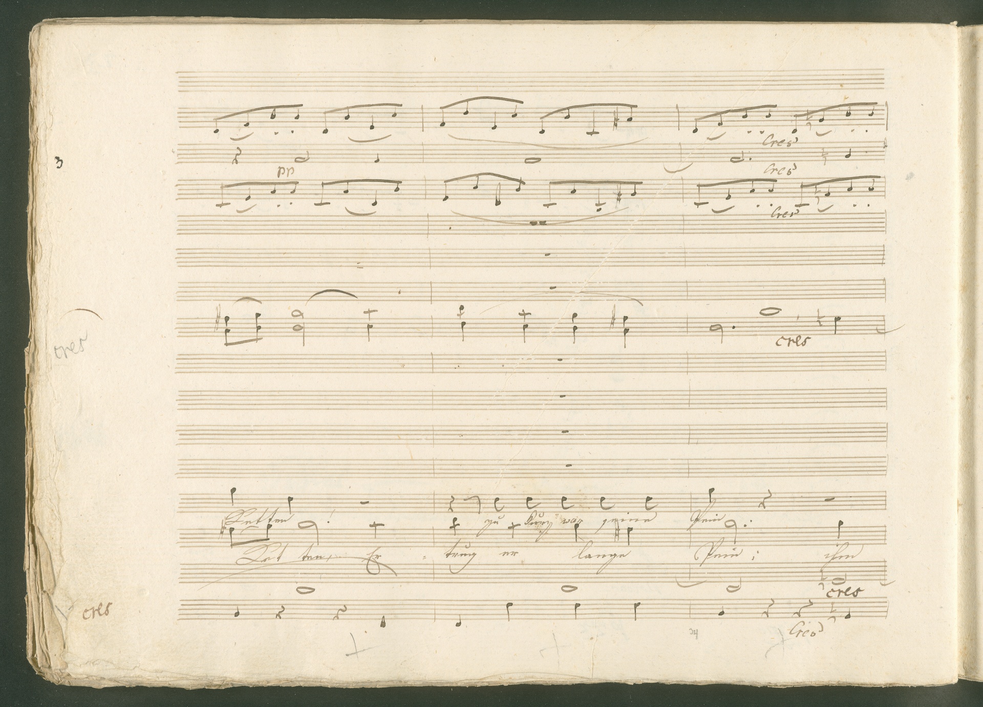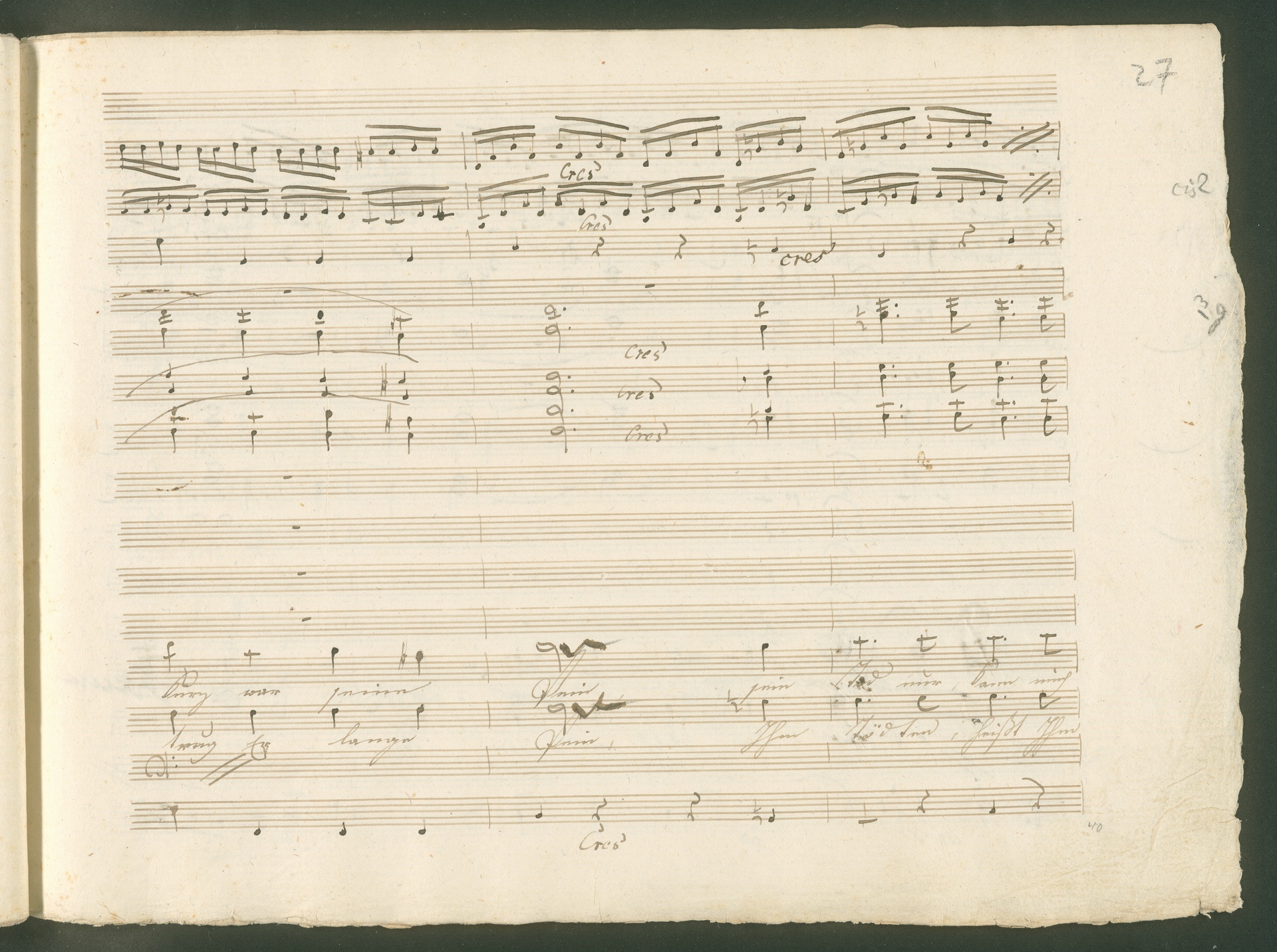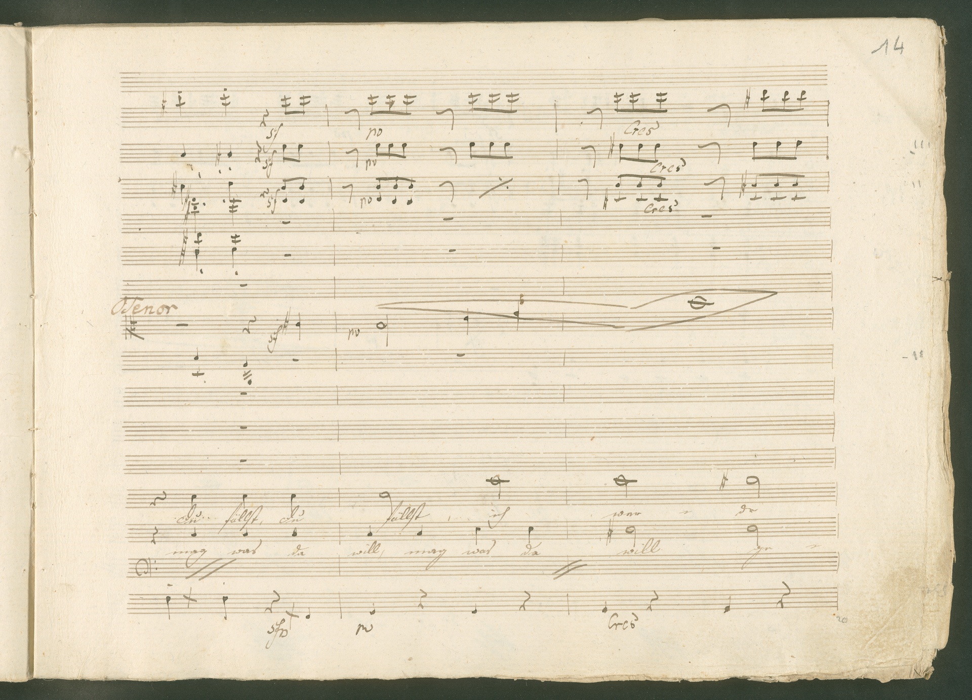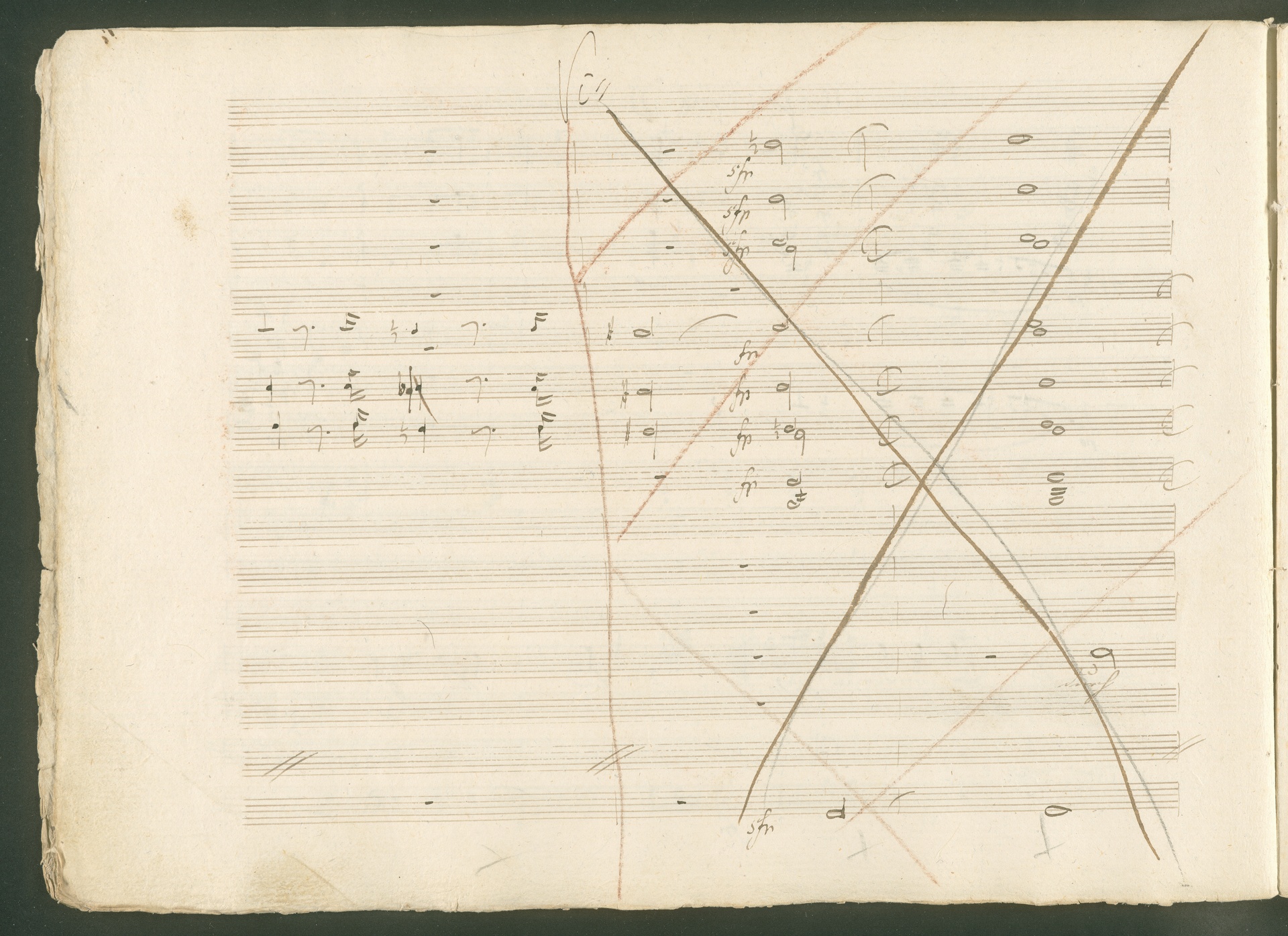 Abgebildet ist eine Kopistenabschrift des Duetts Pizarro/Rocco "Jetzt, Alter, jetzt hat es Eile" aus Beethovens einziger Oper Leonore bzw. Fidelio. Der Kopist schrieb das Duett in der Fassung von 1806, Beethoven korrigierte diese im Zuge der Umarbeitung der Oper 1814. Bei dieser letzten Revision straffte Beethoven den Ablauf durch gezielte Streichungen, die die Wirkung verstärkten und das Tempo der Handlung beschleunigten. Auch die vorliegende Abschrift trägt solche Eingriffe: auf etlichen Blättern kürzte Beethoven Takte oder ganze Phrasen. So gleich zu Beginn auf den beiden ersten Notentextseiten: Pizarro beginnt in der Fassung von 1806, wie sie der Kopist schrieb, mit dem Wortlaut: "Jetzt, Alter, Alter, jetzt hat es Eile!". Er singt quasi atemlos - es hat ja Eile - mit Pausen versetzt auf fünf Takte verteilt. Beethoven korrigiert dies, in dem er die zwei Takte "Alter, Alter" streicht bzw. ausradiert und die Phrase auf drei Takte zusammenzieht. Erst jetzt entsteht tatsächlich der Eindruck, Pizarro sei gehetzt - "Jetzt, Alter, jetzt hat es Eile." Nur ein kleines Detail und im Manuskript keine große Korrektur - aber welche dramaturgische Wirkung erzielt Beethoven damit! (J.R.)