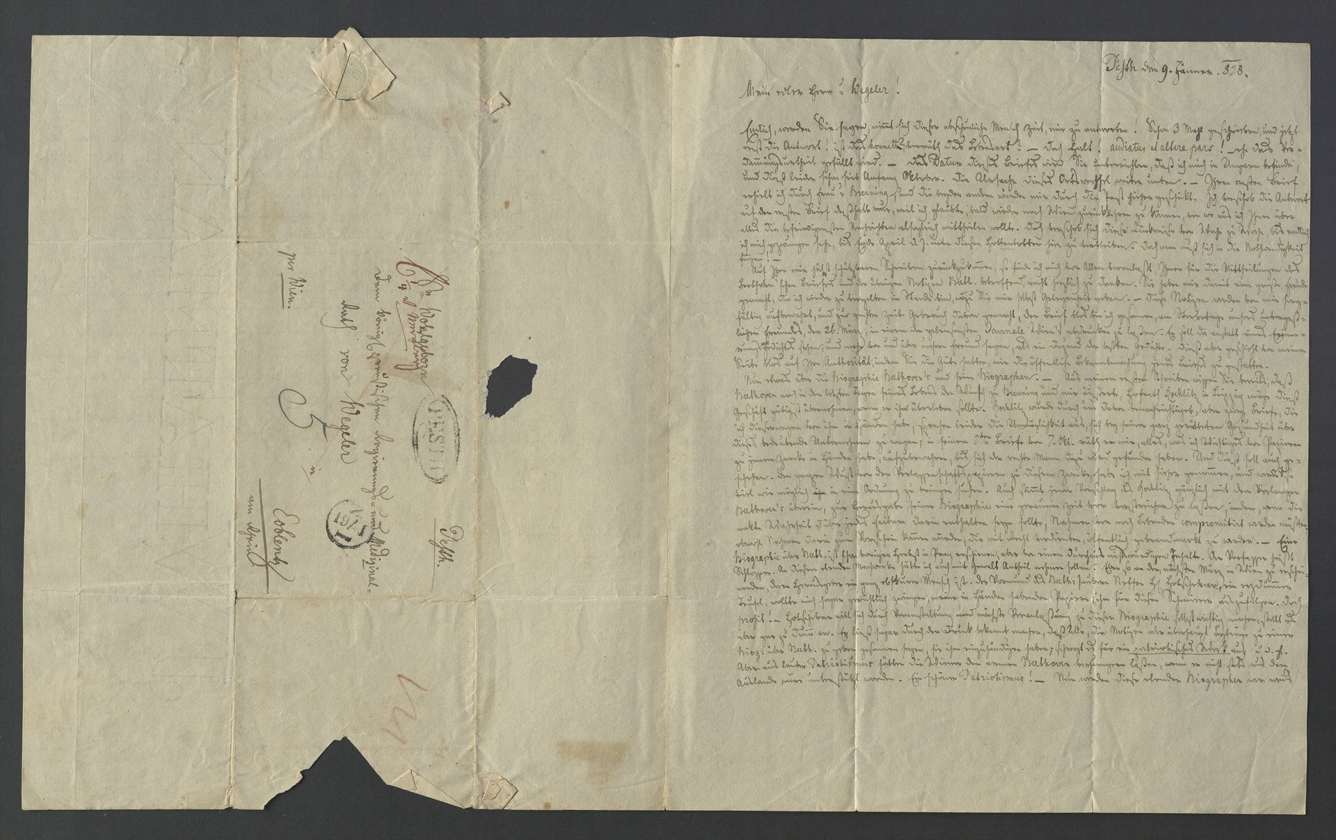 Anton Schindler, Brief an Franz Gerhard Wegeler in Koblenz, Pest, 9. Januar 1828, Autograph