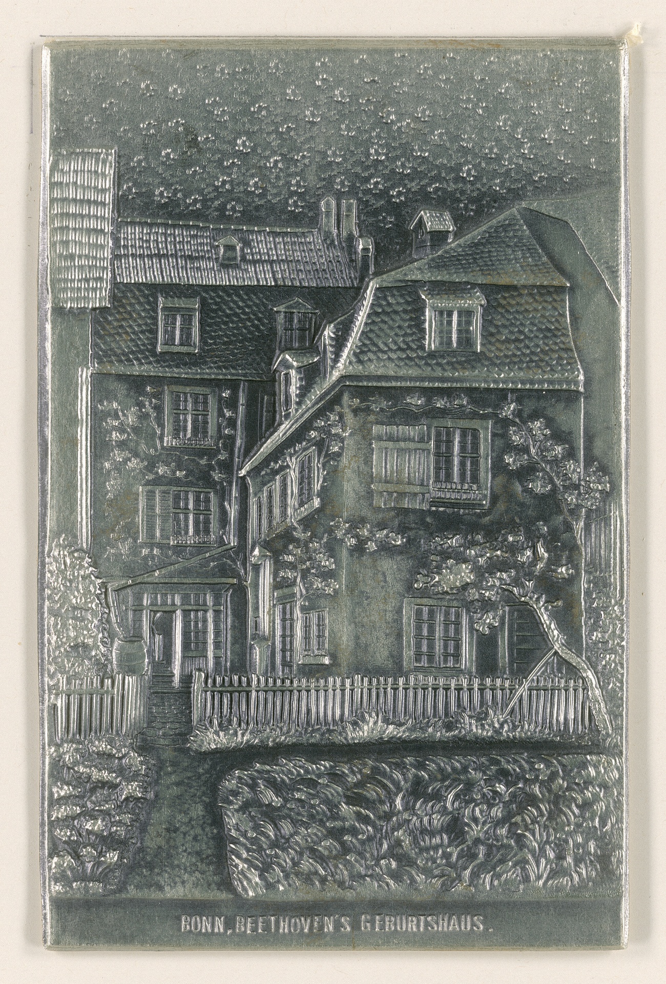 Beethoven-Haus, Bonn, Bonngasse, Gartenansicht, um 1900 - Prägedruck nach einer anonymen Zeichnung, erschienen bei Hermann A. Peters, Bonn, um 1910?