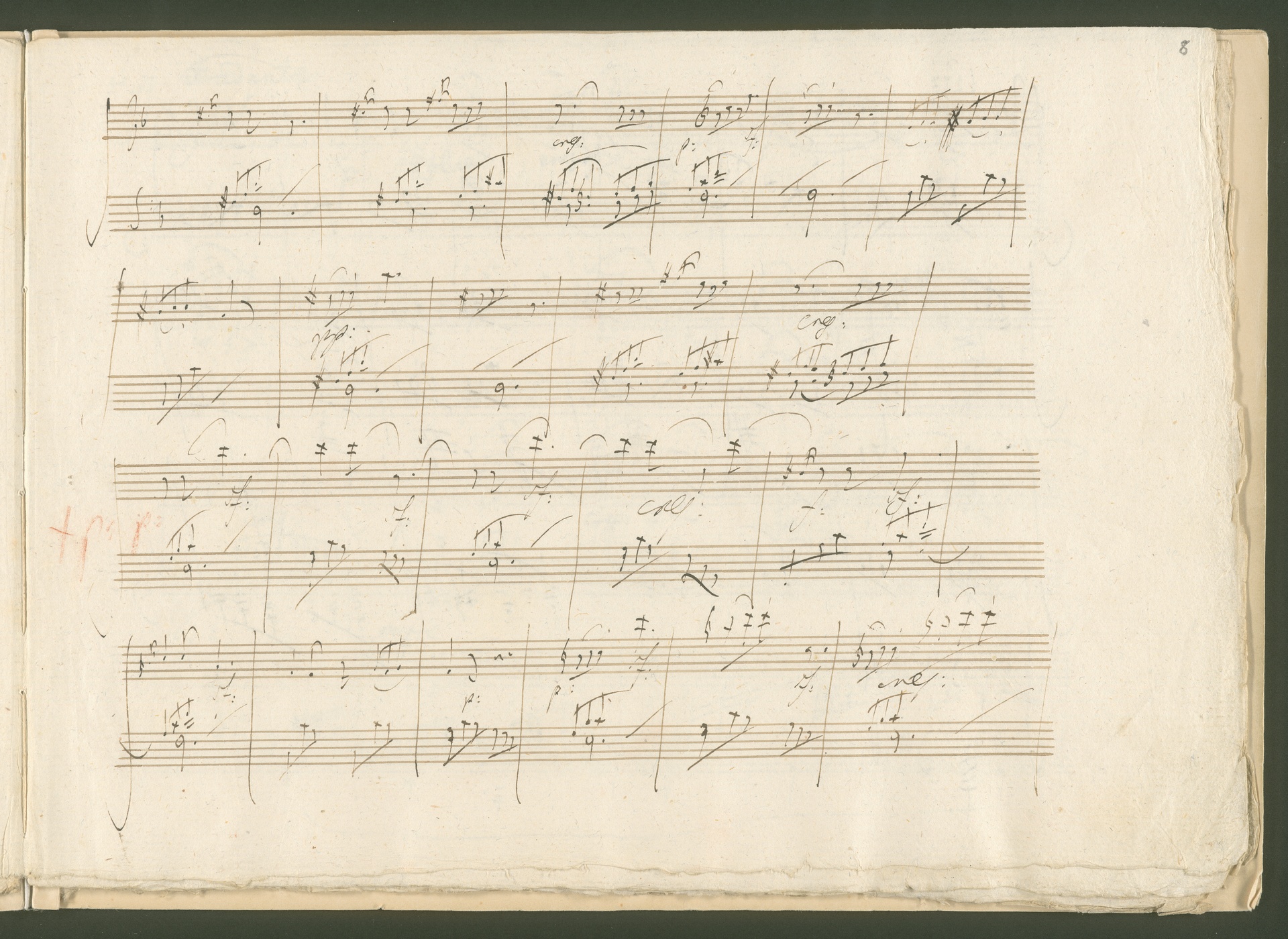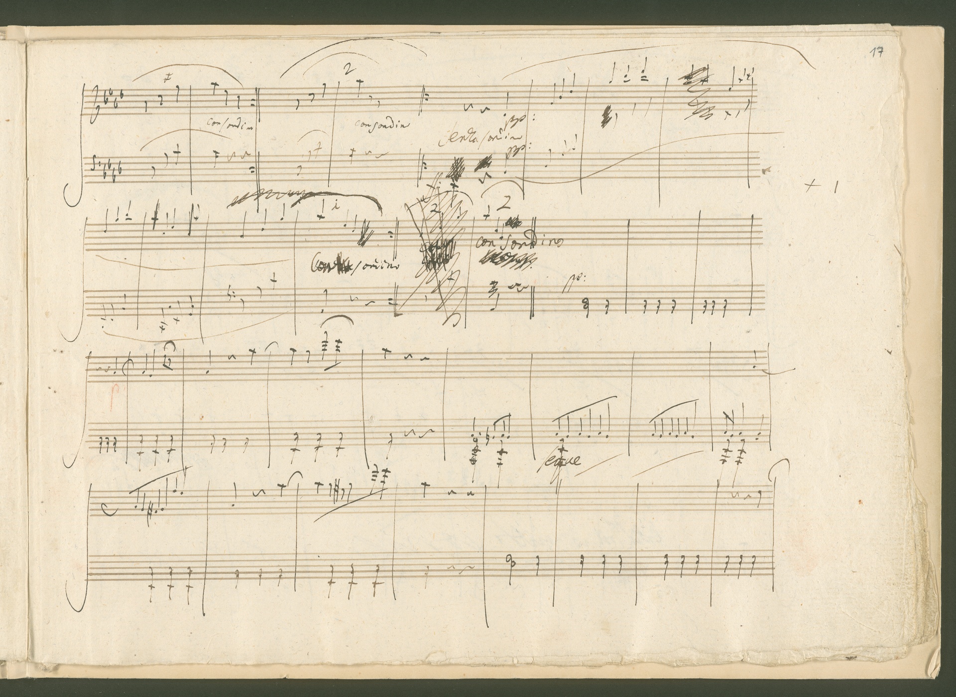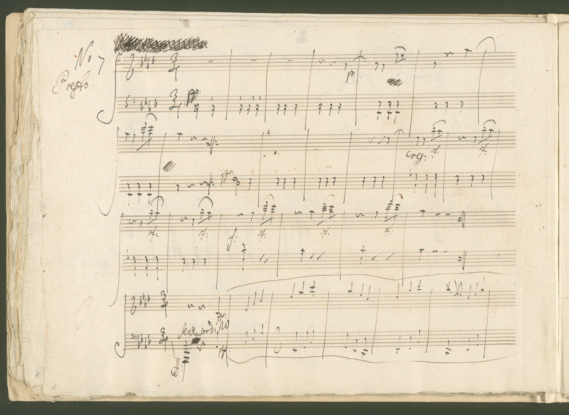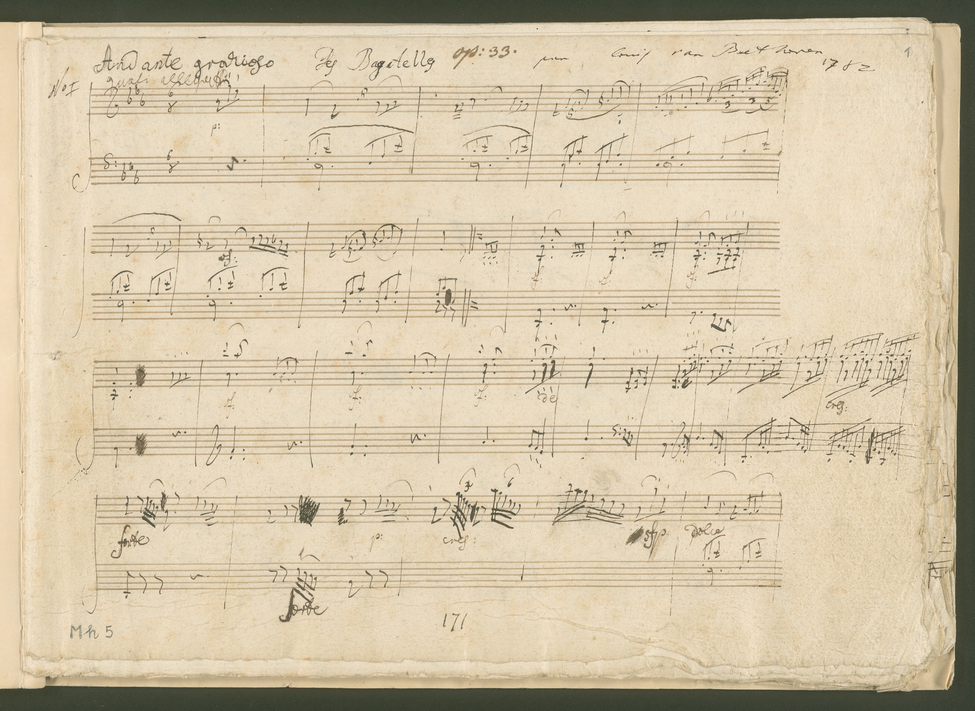 Beethovens sieben Bagatellen für Klavier op. 33 erschienen 1803 beim Kunst- und Industrie-Comptoir. Das Autograph - Beethoven fertigte es als Stichvorlage für die Wiener Verleger an - trägt allerdings die eigenhändige Jahreszahl "1782". In diesem Jahr war Beethoven 11 Jahre alt (er ist Mitte Dezember 1770 geboren)! Max Unger, ein Beethoven-Forscher Mitte des 20. Jahrhunderts, glaubte noch an die Autorität dieser Zahl. Unger vermutete, Beethoven habe musikalische Ideen aus seiner Kindheit verarbeitet und dies in der Jahreszahl dokumentiert. Die jüngere Beethoven-Forschung wiederlegt diese These. In vier Skizzenbüchern Beethoven finden sich Entwürfe zu den Bagatellen: "Landsberg 7", "Keßler", "Sauer" und "Wielhorsky". Alle vier Skizzenbücher verwendete Beethoven zweifelsfrei frühestens zwischen Sommer 1800 und spätestens Mai 1803. Die Zahl "1782" hat also nichts mit der Entstehung der Bagatellen zu tun. Die Lösung des Rätsels ist viel prosaischer: Beethoven hatte sich verschrieben. Falsche Zahlen und Zahlendreher sind bei ihm keine Seltenheit. Etliche Briefe und Musikhandschriften tragen unglaubwürdige Daten, die lange Zeit die Forscher verwirrten. Bei genauem Hinsehen erkennt man, daß im vorliegenden Autograph unter der Sieben bereits etwas anderes stand. Sicherlich wollte Beethoven die richtige Zahl "1802" notieren und irrte sich, ohne es zu bemerken. Den gleichen Fehler machte er übrigens auch bei einem Brief, den er am 23. Januar 1802 an die Gräfin Susanna Guicciardi schrieb (BGA 77). Auch hier notierte er "1782", das Jahr ist jedoch aus dem Zusammenhang sicher auf 1802 bestimmbar. (J.R.)