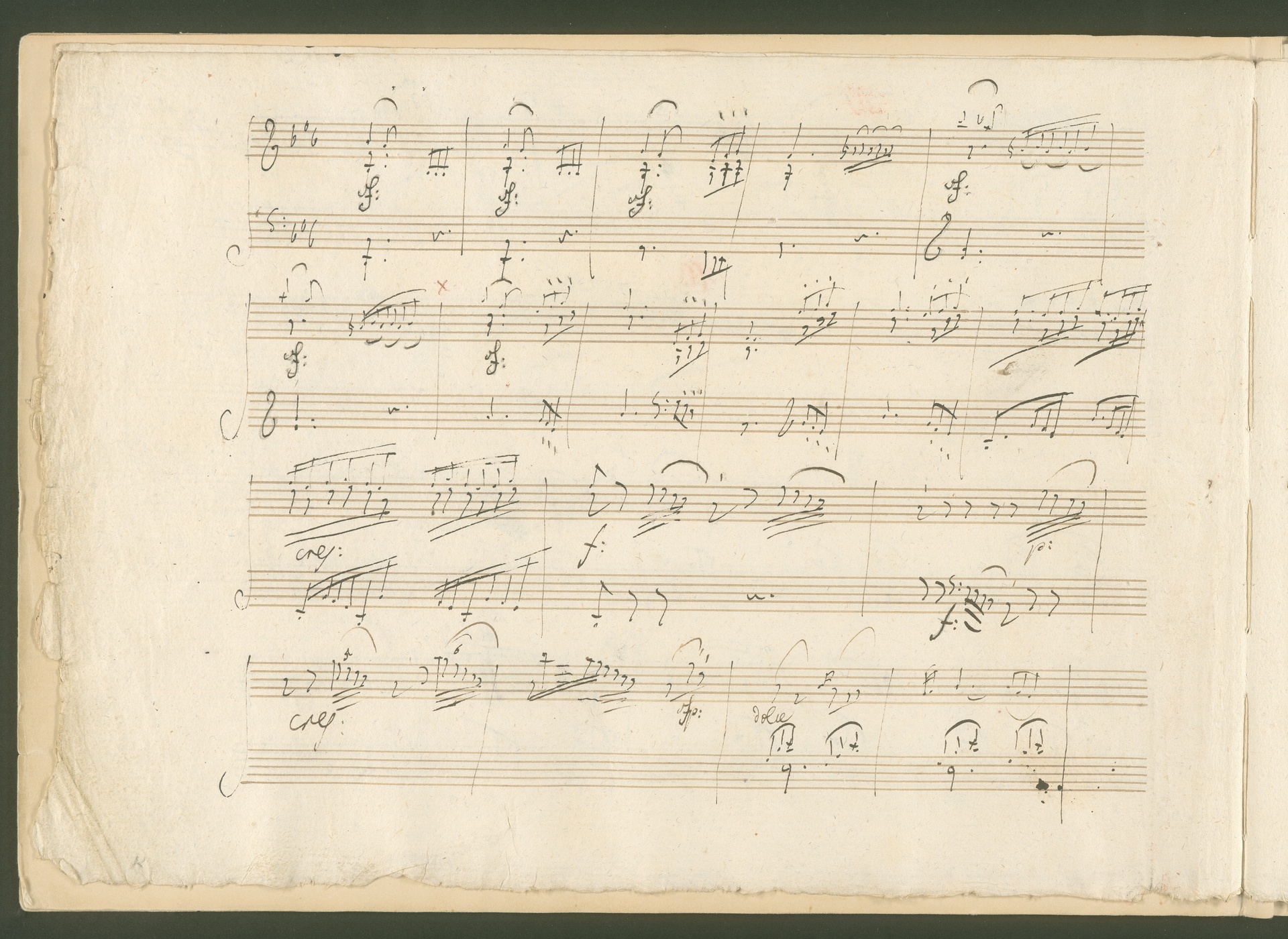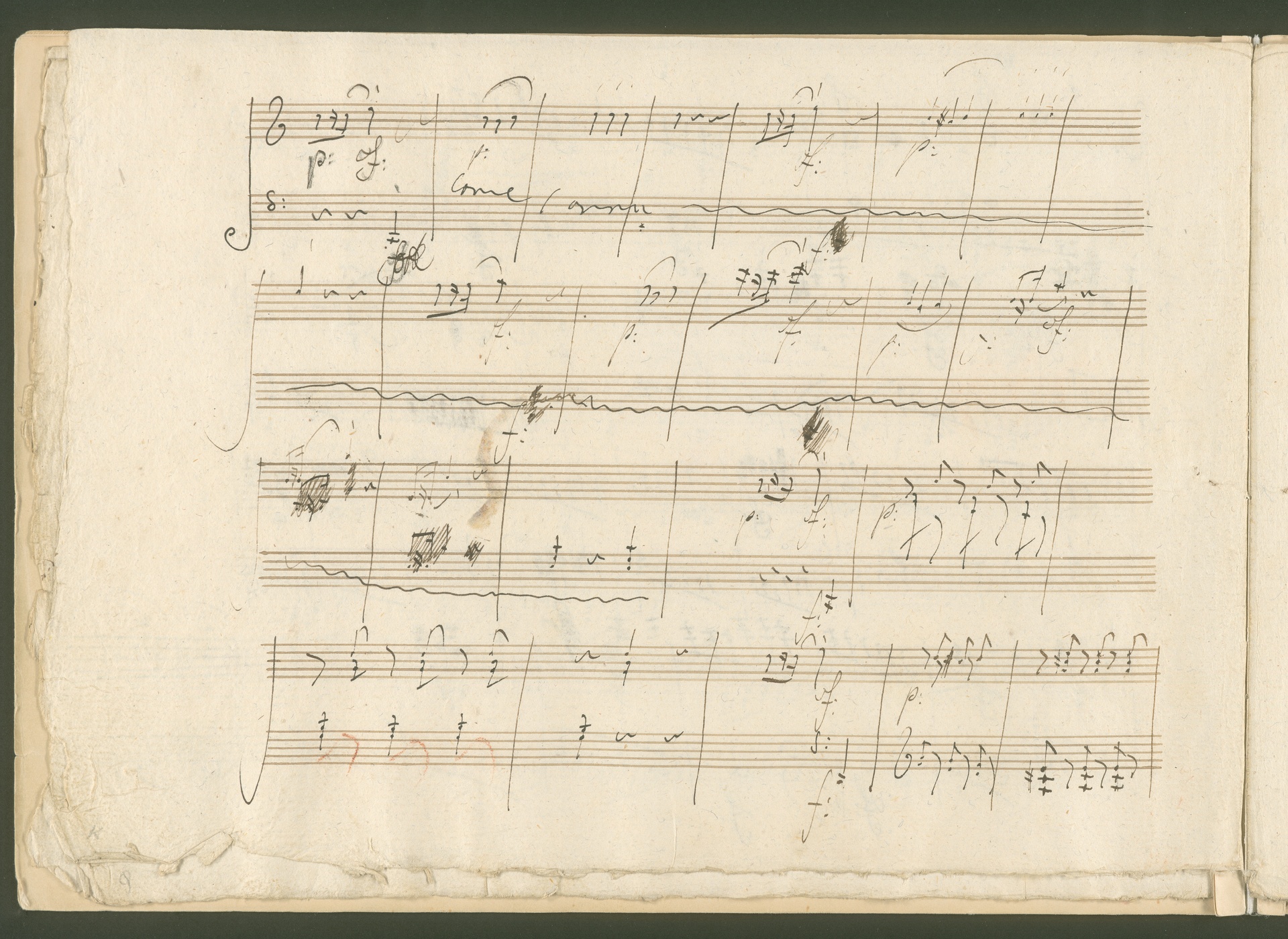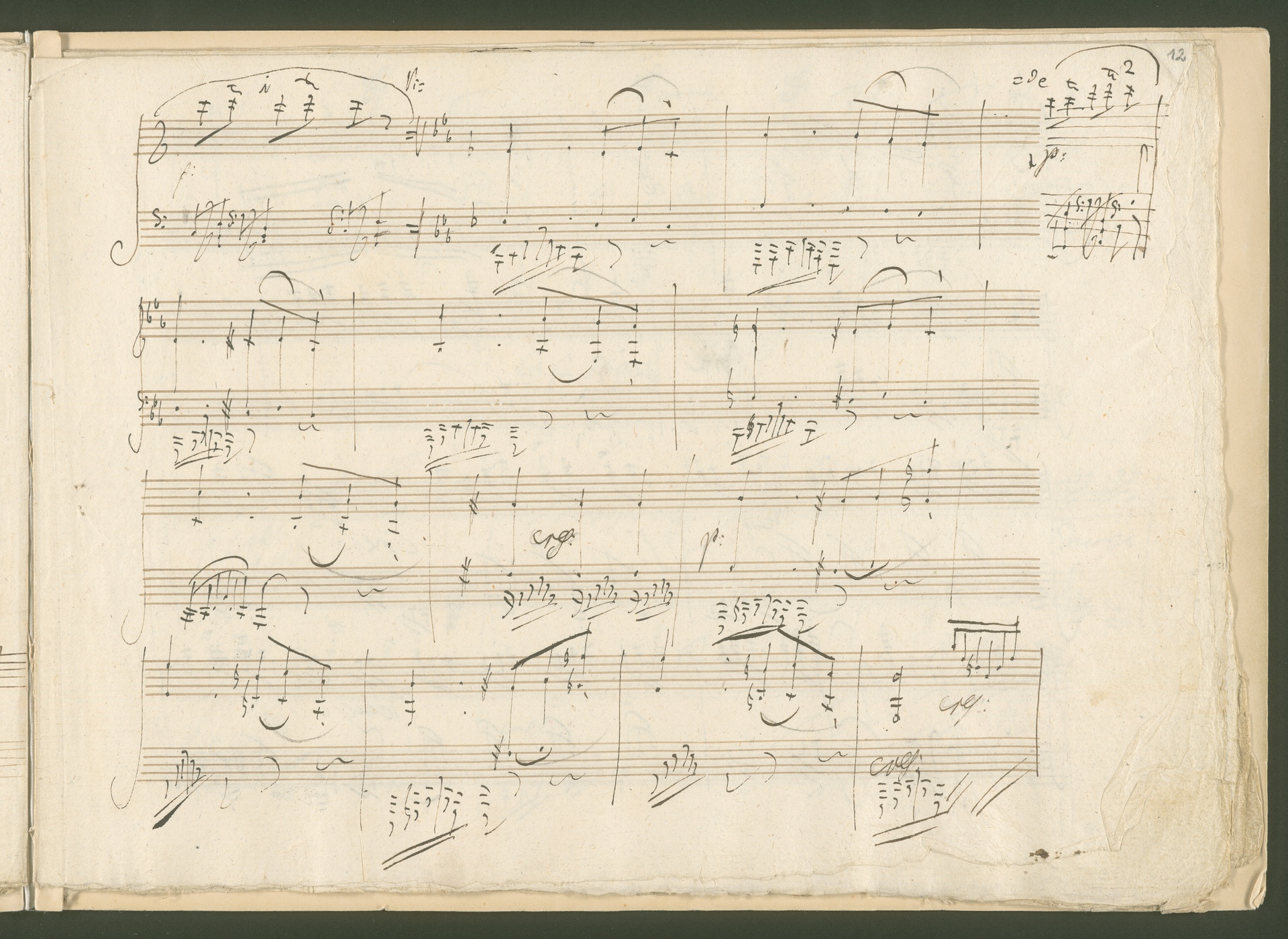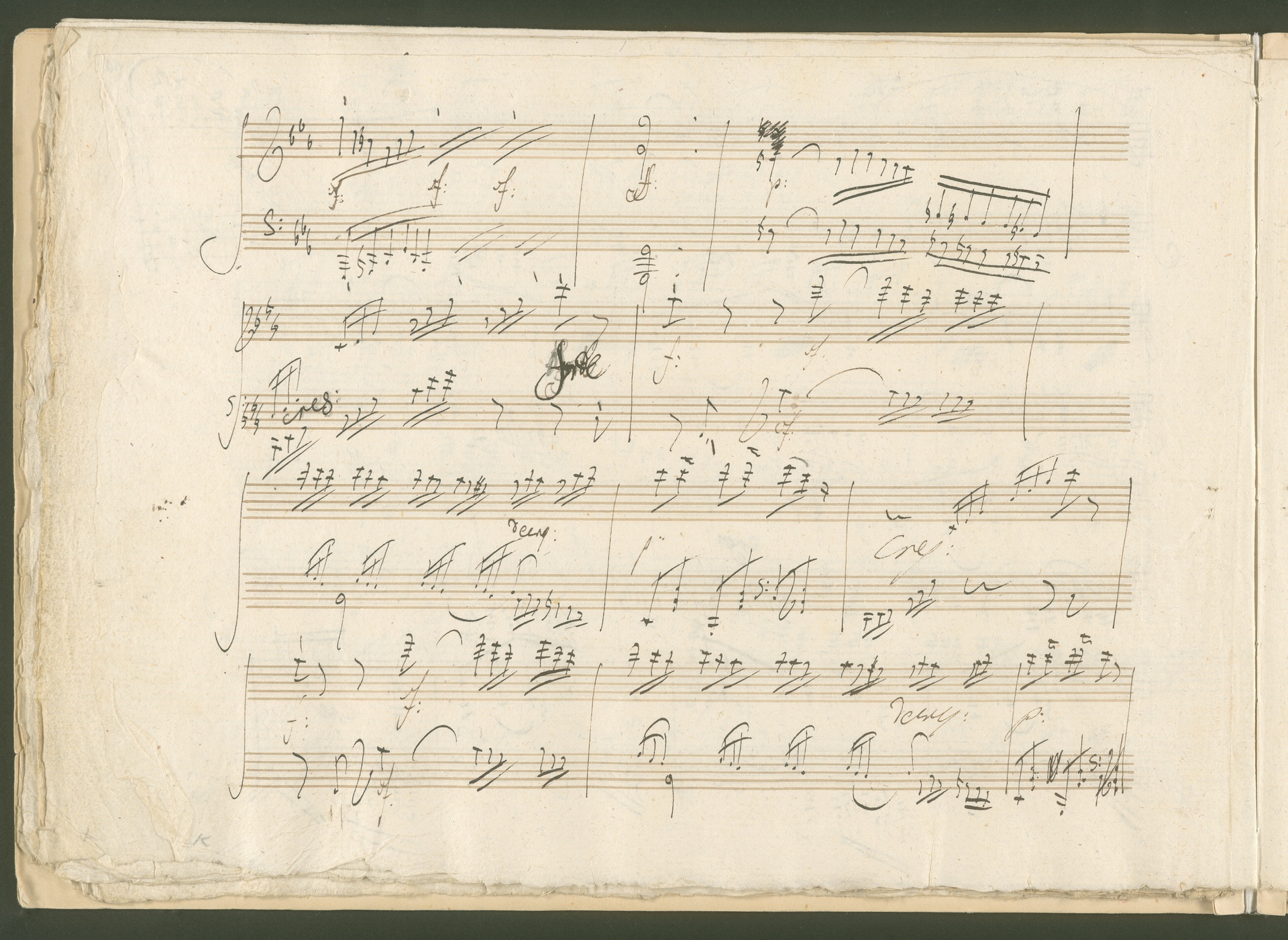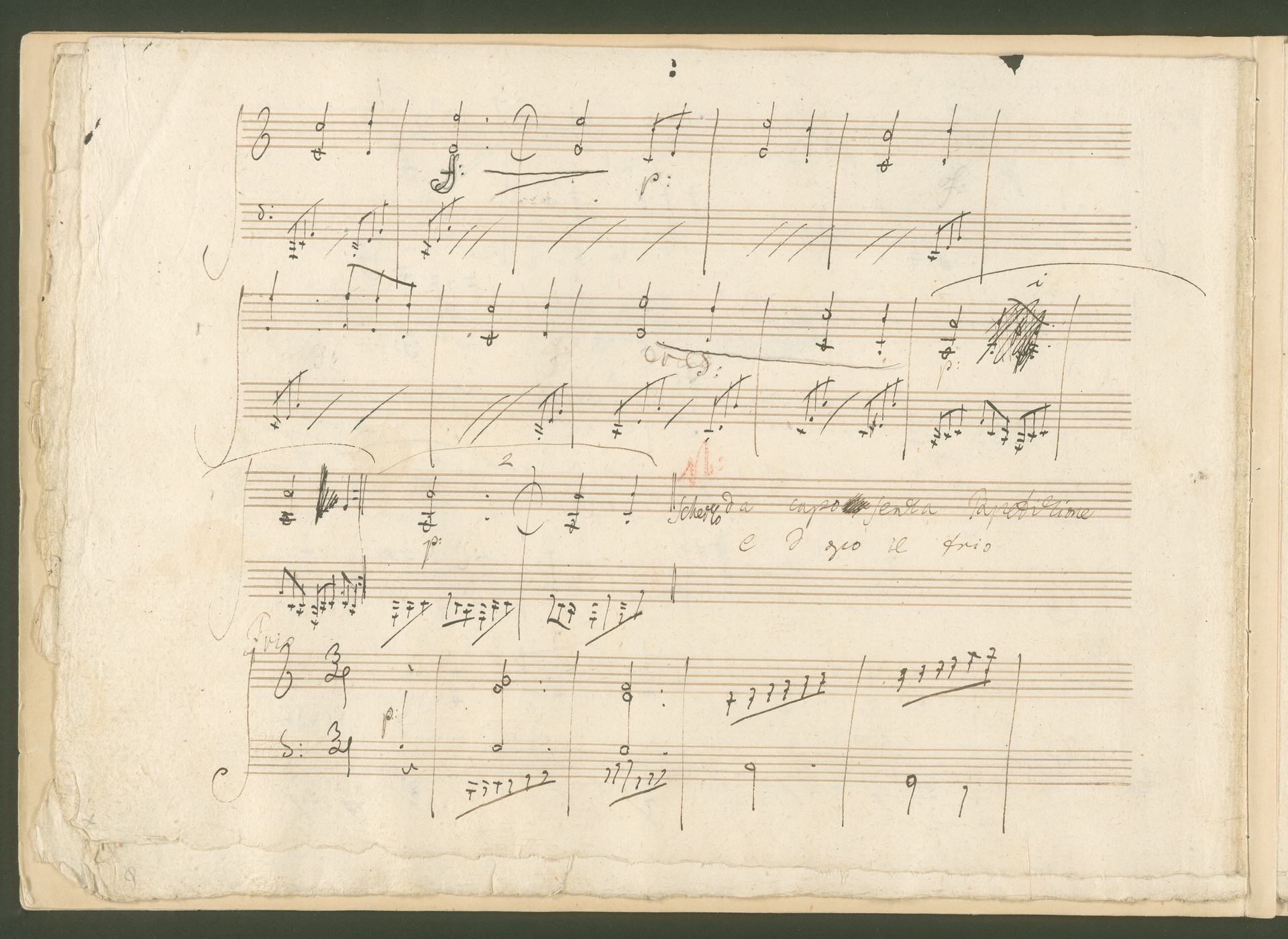 Beethovens sieben Bagatellen für Klavier op. 33 erschienen 1803 beim Kunst- und Industrie-Comptoir. Das Autograph - Beethoven fertigte es als Stichvorlage für die Wiener Verleger an - trägt allerdings die eigenhändige Jahreszahl "1782". In diesem Jahr war Beethoven 11 Jahre alt (er ist Mitte Dezember 1770 geboren)! Max Unger, ein Beethoven-Forscher Mitte des 20. Jahrhunderts, glaubte noch an die Autorität dieser Zahl. Unger vermutete, Beethoven habe musikalische Ideen aus seiner Kindheit verarbeitet und dies in der Jahreszahl dokumentiert. Die jüngere Beethoven-Forschung wiederlegt diese These. In vier Skizzenbüchern Beethoven finden sich Entwürfe zu den Bagatellen: "Landsberg 7", "Keßler", "Sauer" und "Wielhorsky". Alle vier Skizzenbücher verwendete Beethoven zweifelsfrei frühestens zwischen Sommer 1800 und spätestens Mai 1803. Die Zahl "1782" hat also nichts mit der Entstehung der Bagatellen zu tun. Die Lösung des Rätsels ist viel prosaischer: Beethoven hatte sich verschrieben. Falsche Zahlen und Zahlendreher sind bei ihm keine Seltenheit. Etliche Briefe und Musikhandschriften tragen unglaubwürdige Daten, die lange Zeit die Forscher verwirrten. Bei genauem Hinsehen erkennt man, daß im vorliegenden Autograph unter der Sieben bereits etwas anderes stand. Sicherlich wollte Beethoven die richtige Zahl "1802" notieren und irrte sich, ohne es zu bemerken. Den gleichen Fehler machte er übrigens auch bei einem Brief, den er am 23. Januar 1802 an die Gräfin Susanna Guicciardi schrieb (BGA 77). Auch hier notierte er "1782", das Jahr ist jedoch aus dem Zusammenhang sicher auf 1802 bestimmbar. (J.R.)