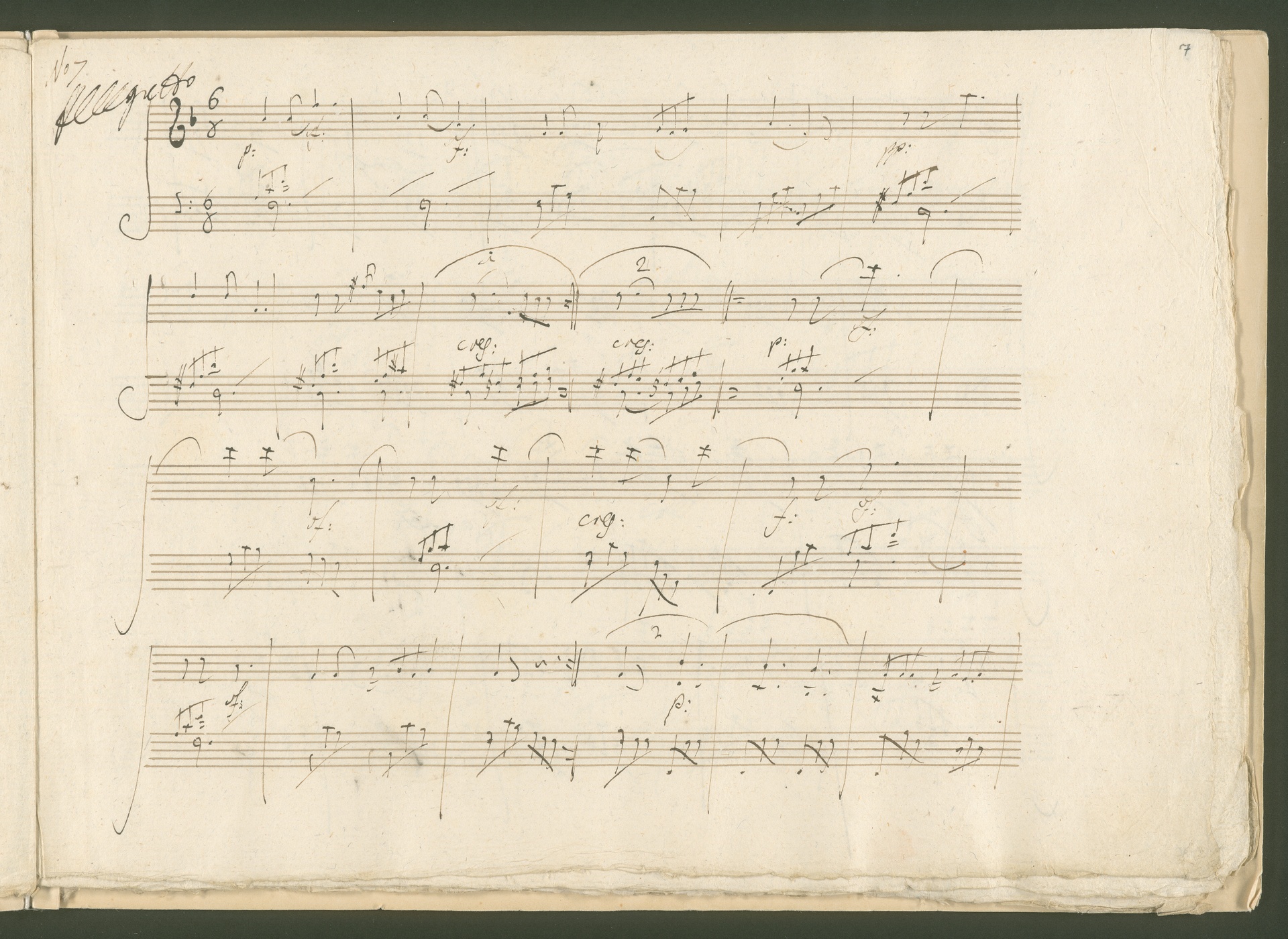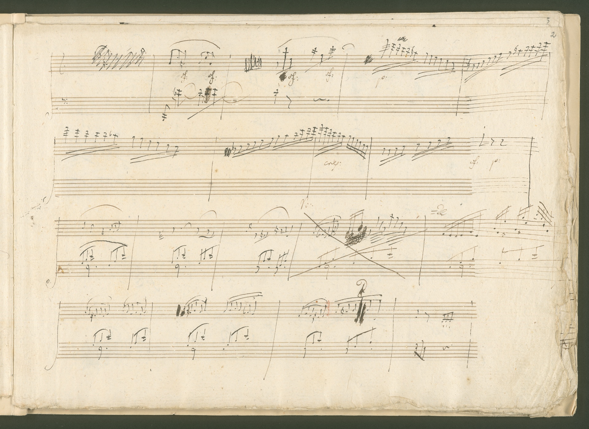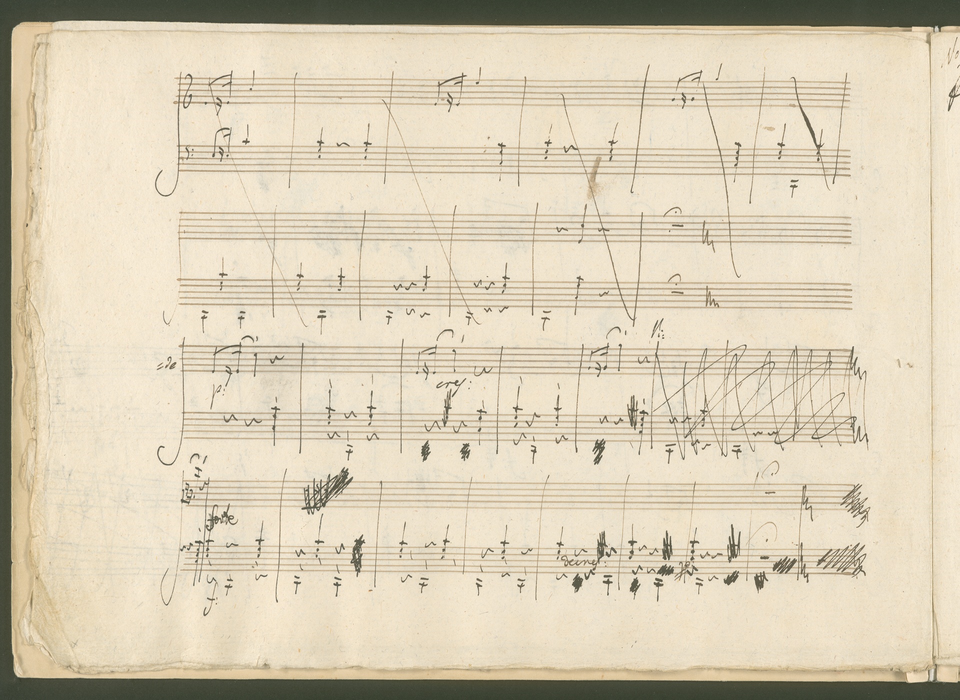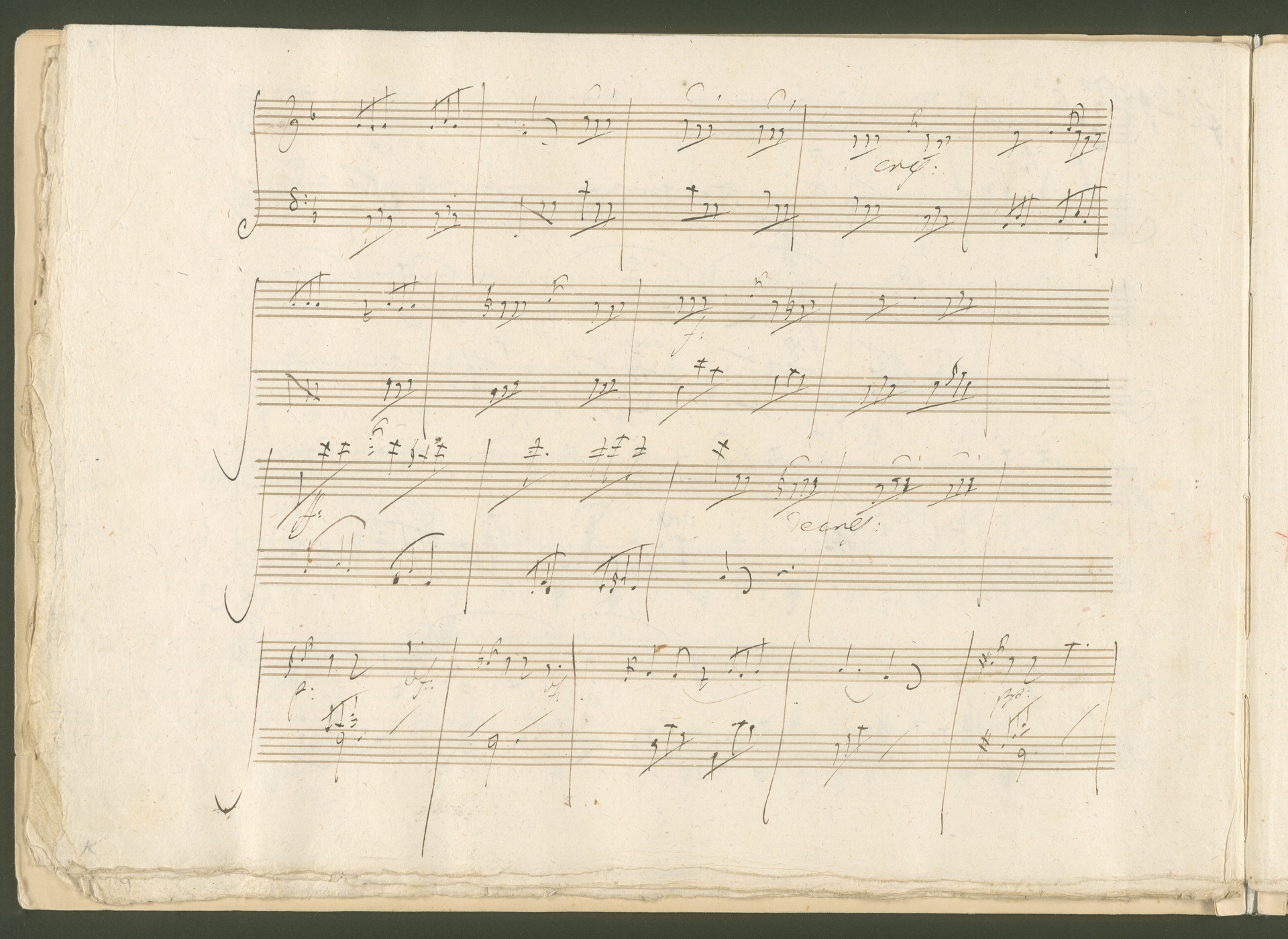 Beethovens sieben Bagatellen für Klavier op. 33 erschienen 1803 beim Kunst- und Industrie-Comptoir. Das Autograph - Beethoven fertigte es als Stichvorlage für die Wiener Verleger an - trägt allerdings die eigenhändige Jahreszahl "1782". In diesem Jahr war Beethoven 11 Jahre alt (er ist Mitte Dezember 1770 geboren)! Max Unger, ein Beethoven-Forscher Mitte des 20. Jahrhunderts, glaubte noch an die Autorität dieser Zahl. Unger vermutete, Beethoven habe musikalische Ideen aus seiner Kindheit verarbeitet und dies in der Jahreszahl dokumentiert. Die jüngere Beethoven-Forschung wiederlegt diese These. In vier Skizzenbüchern Beethoven finden sich Entwürfe zu den Bagatellen: "Landsberg 7", "Keßler", "Sauer" und "Wielhorsky". Alle vier Skizzenbücher verwendete Beethoven zweifelsfrei frühestens zwischen Sommer 1800 und spätestens Mai 1803. Die Zahl "1782" hat also nichts mit der Entstehung der Bagatellen zu tun. Die Lösung des Rätsels ist viel prosaischer: Beethoven hatte sich verschrieben. Falsche Zahlen und Zahlendreher sind bei ihm keine Seltenheit. Etliche Briefe und Musikhandschriften tragen unglaubwürdige Daten, die lange Zeit die Forscher verwirrten. Bei genauem Hinsehen erkennt man, daß im vorliegenden Autograph unter der Sieben bereits etwas anderes stand. Sicherlich wollte Beethoven die richtige Zahl "1802" notieren und irrte sich, ohne es zu bemerken. Den gleichen Fehler machte er übrigens auch bei einem Brief, den er am 23. Januar 1802 an die Gräfin Susanna Guicciardi schrieb (BGA 77). Auch hier notierte er "1782", das Jahr ist jedoch aus dem Zusammenhang sicher auf 1802 bestimmbar. (J.R.)