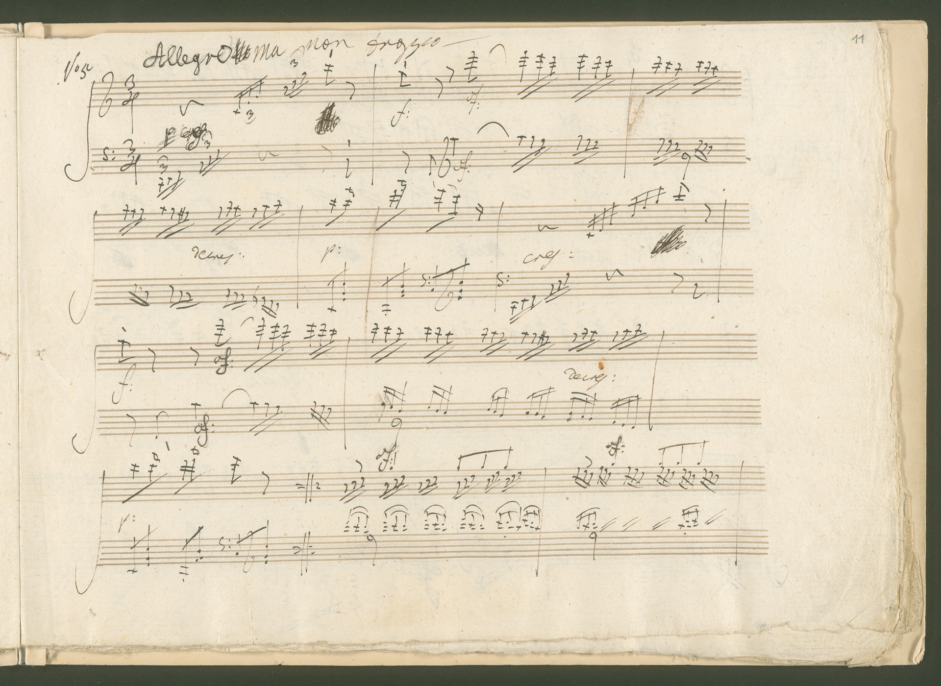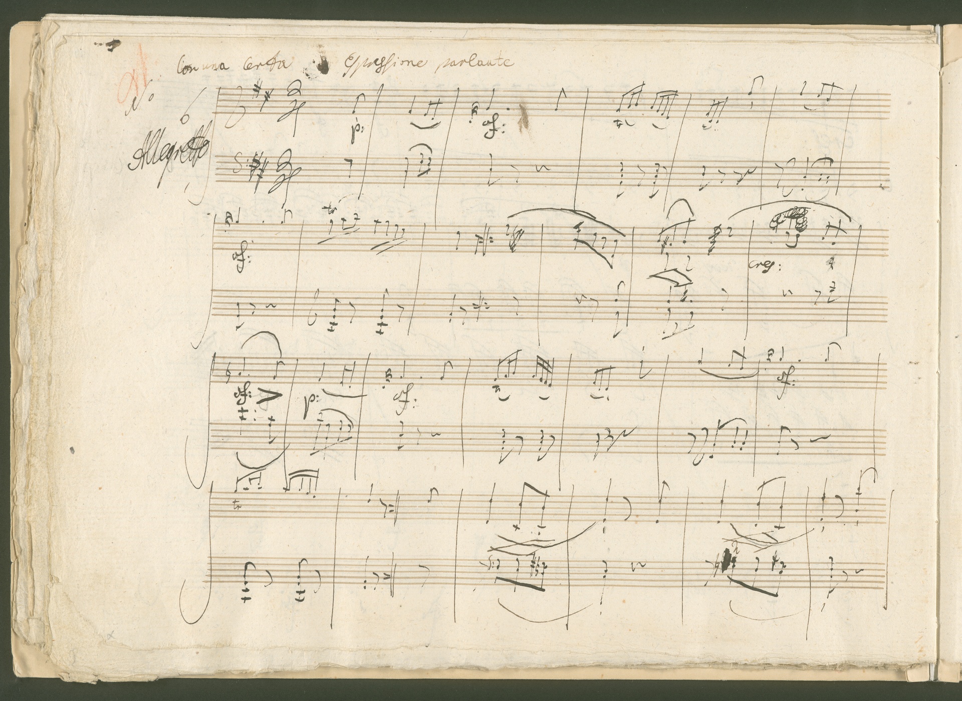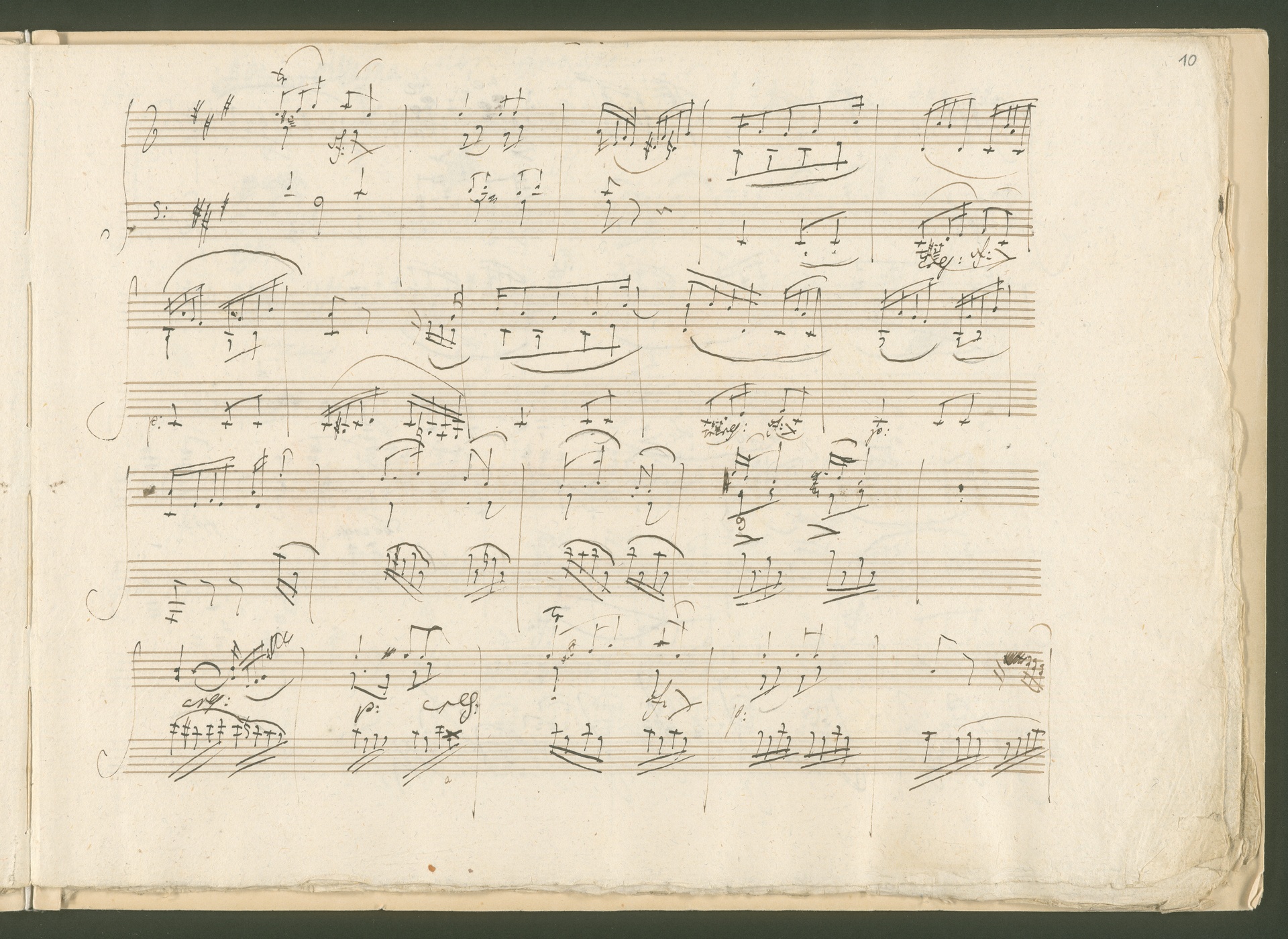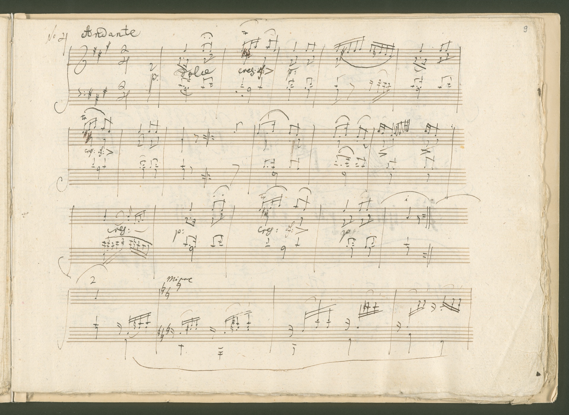Beethovens sieben Bagatellen für Klavier op. 33 erschienen 1803 beim Kunst- und Industrie-Comptoir. Das Autograph - Beethoven fertigte es als Stichvorlage für die Wiener Verleger an - trägt allerdings die eigenhändige Jahreszahl "1782". In diesem Jahr war Beethoven 11 Jahre alt (er ist Mitte Dezember 1770 geboren)! Max Unger, ein Beethoven-Forscher Mitte des 20. Jahrhunderts, glaubte noch an die Autorität dieser Zahl. Unger vermutete, Beethoven habe musikalische Ideen aus seiner Kindheit verarbeitet und dies in der Jahreszahl dokumentiert. Die jüngere Beethoven-Forschung wiederlegt diese These. In vier Skizzenbüchern Beethoven finden sich Entwürfe zu den Bagatellen: "Landsberg 7", "Keßler", "Sauer" und "Wielhorsky". Alle vier Skizzenbücher verwendete Beethoven zweifelsfrei frühestens zwischen Sommer 1800 und spätestens Mai 1803. Die Zahl "1782" hat also nichts mit der Entstehung der Bagatellen zu tun. Die Lösung des Rätsels ist viel prosaischer: Beethoven hatte sich verschrieben. Falsche Zahlen und Zahlendreher sind bei ihm keine Seltenheit. Etliche Briefe und Musikhandschriften tragen unglaubwürdige Daten, die lange Zeit die Forscher verwirrten. Bei genauem Hinsehen erkennt man, daß im vorliegenden Autograph unter der Sieben bereits etwas anderes stand. Sicherlich wollte Beethoven die richtige Zahl "1802" notieren und irrte sich, ohne es zu bemerken. Den gleichen Fehler machte er übrigens auch bei einem Brief, den er am 23. Januar 1802 an die Gräfin Susanna Guicciardi schrieb (BGA 77). Auch hier notierte er "1782", das Jahr ist jedoch aus dem Zusammenhang sicher auf 1802 bestimmbar. (J.R.)