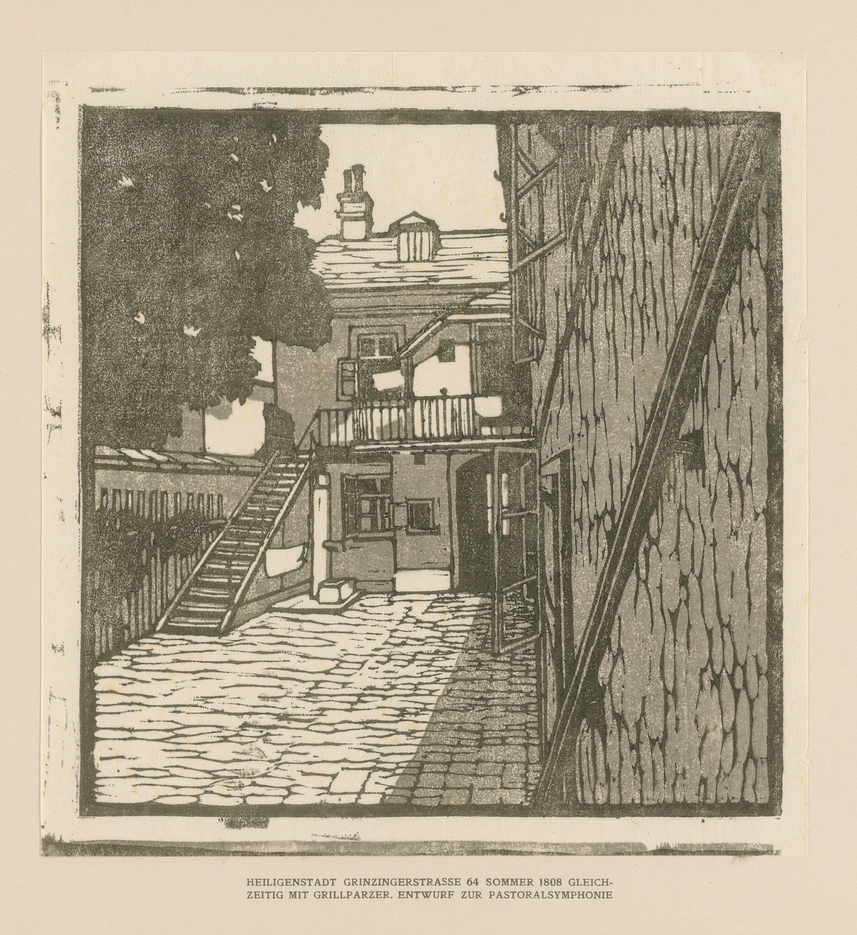 Wien, Heiligenstadt, Grinzingerstraße 64, Wohnung von Ludwig van Beethoven - Holzschnitt von Carl Moll, im Aquarelldruckverfahren farbig gedruckt, von der Wiener Werkstätte, Wien, um 1907