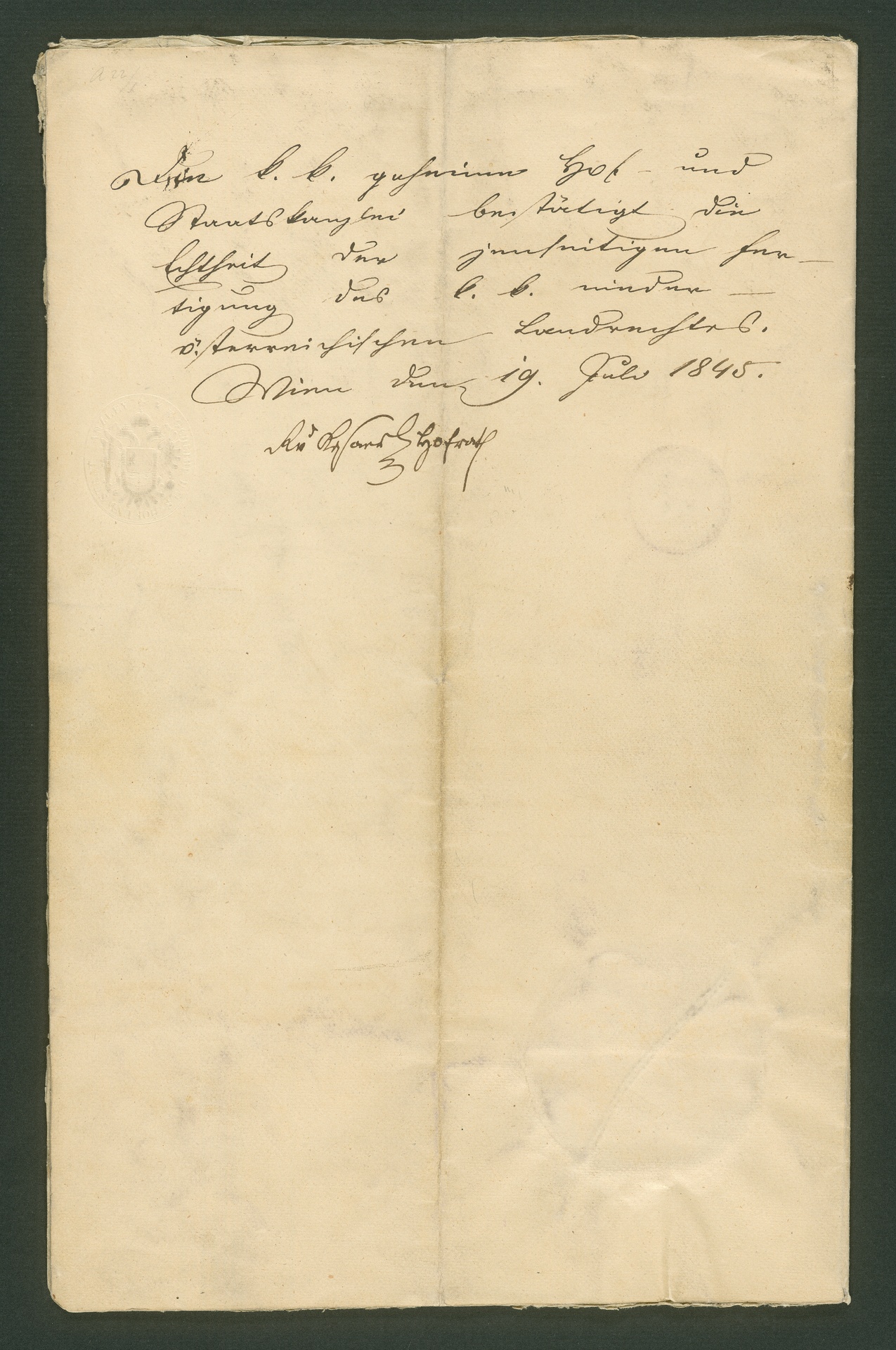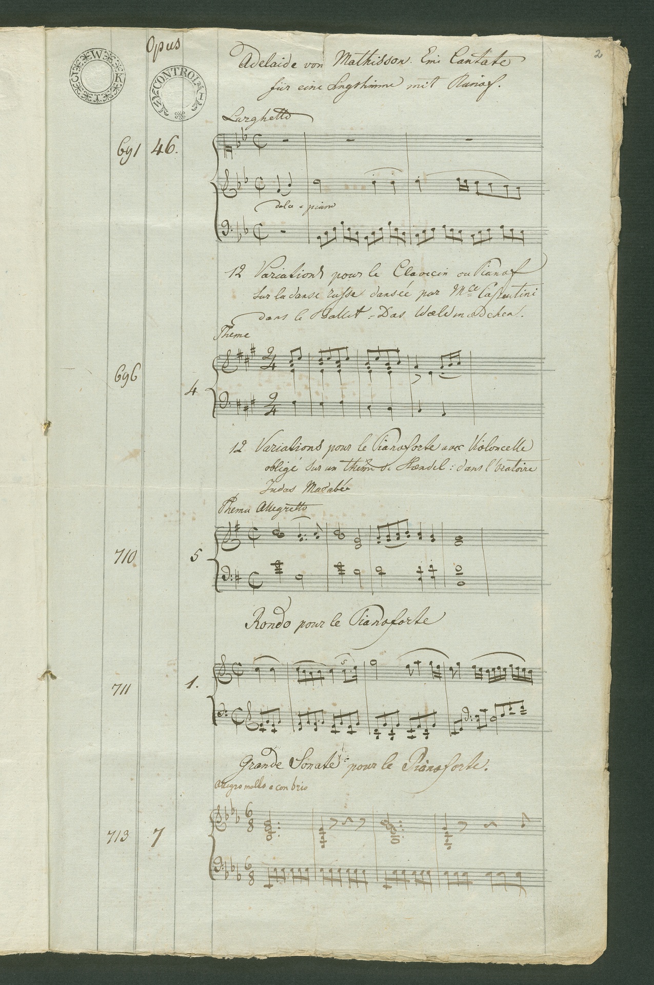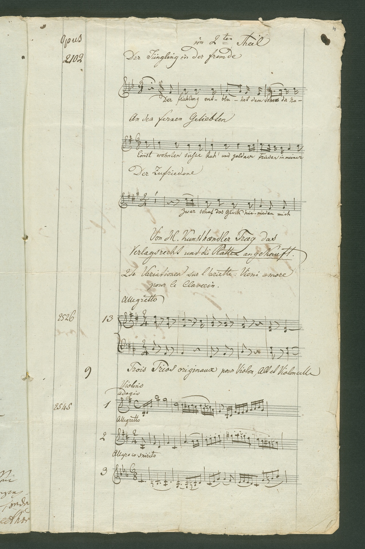 Beethoven bestätigt dem Verleger formell dessen Eigentum an Kompositionen, die bei Artaria als Originalverleger im Laufe der Jahre erschienen sind. Unter den aufgelisteten Werken befinden sich auch drei (op. 9, 66 und WoO 65), die ursprünglich bei Traeg erschienen waren, von dem Artaria das Verlagsrecht und die Platten angekauft hatte.
