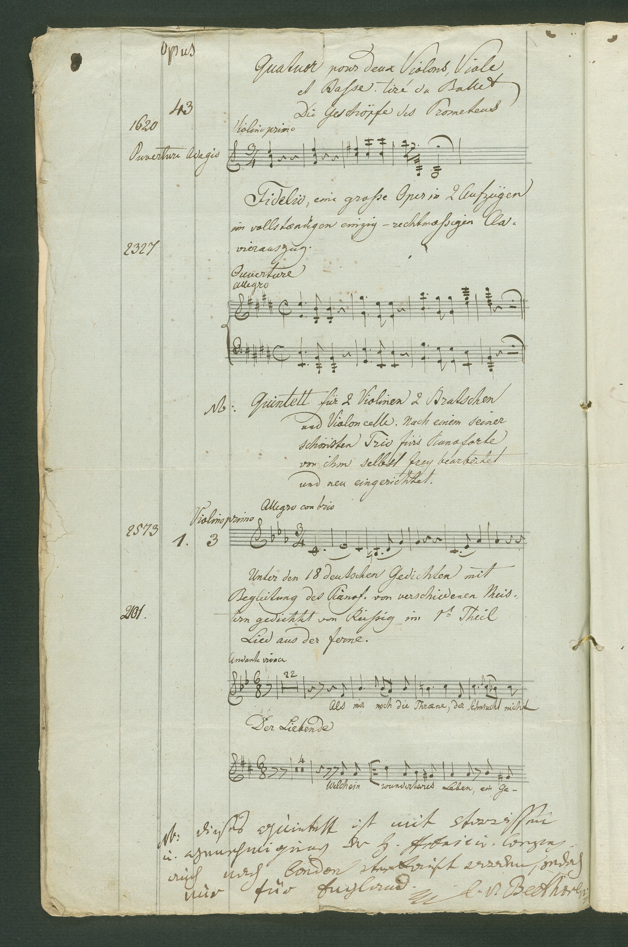 In der Liste sind alle Werke mit ihrer Verlagsnummer, der Werknummer (sofern vorhanden), einem ausführlichen Titel sowie Notenincipits aufgeführt. Bezüglich op. 104 fügt Beethoven handschriftlich die Anmerkung hinzu, dieses Quintett sei mit Artarias Einverständnis auch nach London verkauft worden, "jedoch nur für England". (J.R.)