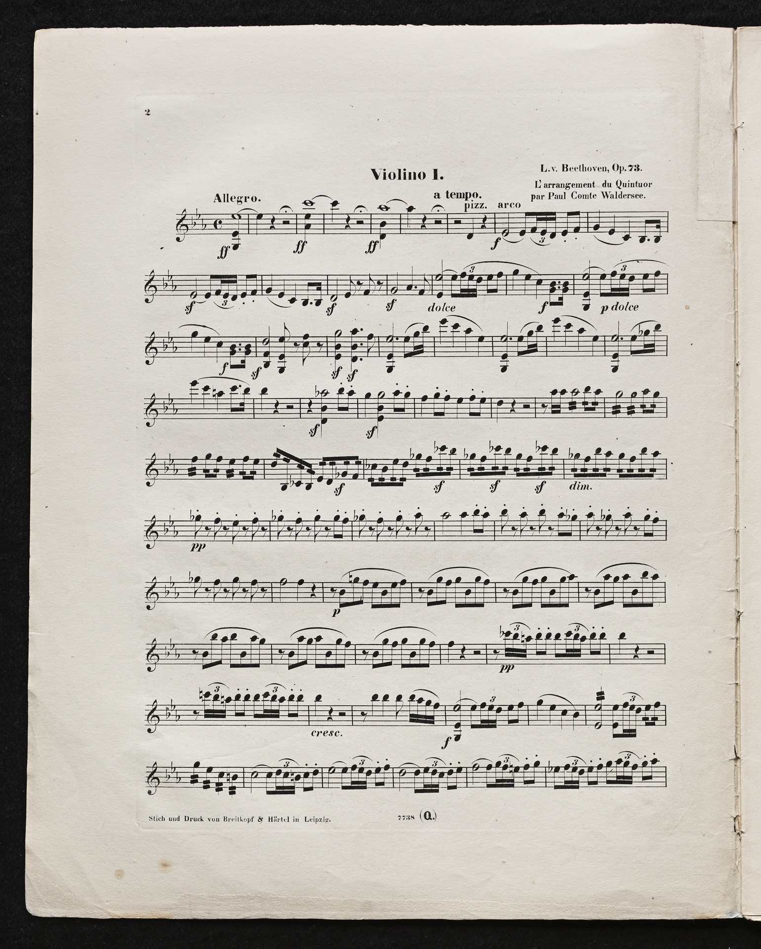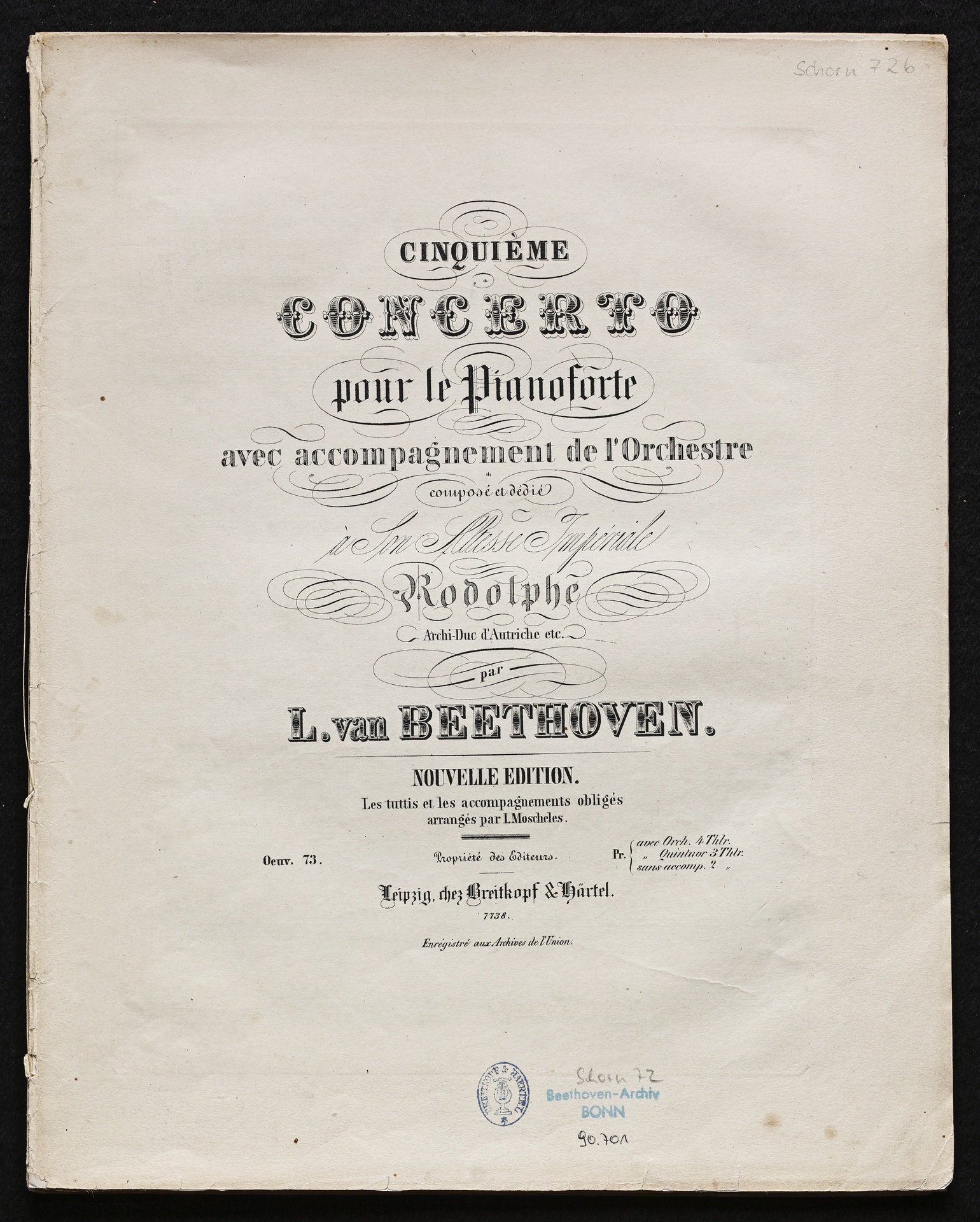Ludwig van Beethoven, Konzert für Klavier und Orchester Nr. 5 (Es-Dur) op. 73, Bearbeitung für Klavier, 2 Violinen, Viola, Violoncello und Kontrabass von Paul Waldersee, Stimmen, Breitkopf und Härtel, 7738