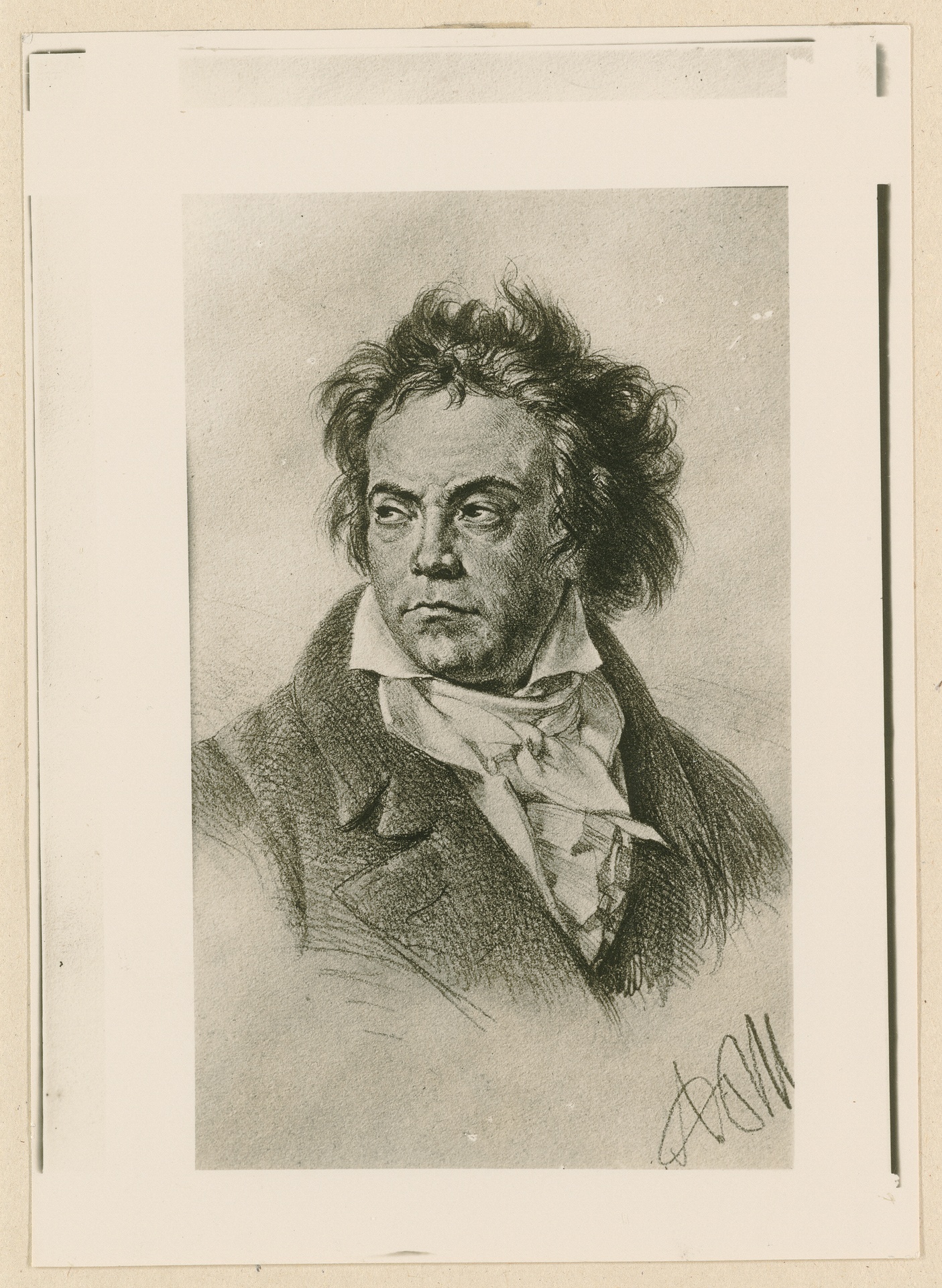 Ludwig van Beethoven - Zeichnung von Adolph von Menzel aus dem Jahr 1904 in Anlehnung an das Porträt von Ferdinand Schimon von 1819, Fotografie der Reproduktion, um 1905