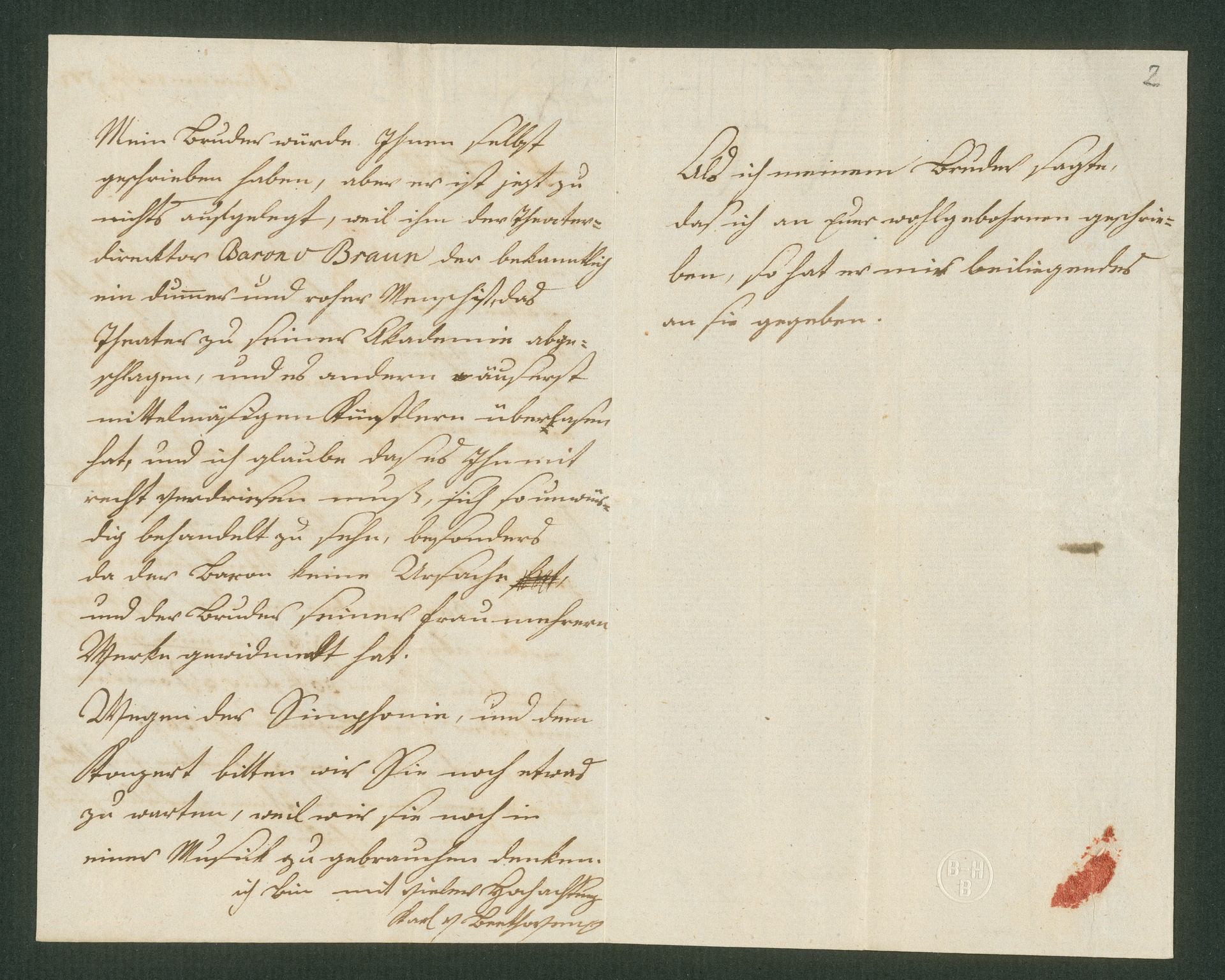 Karl entschuldigt sich für seinen Bruder, der nicht selbst schreibe, weil er sich über Baron von Braun so geärgert habe. Der Baron war Pächter der beiden Hoftheater und hatte Beethoven eine Anfrage für eine Akademie abschlägig beschieden, obwohl Beethoven dessen Frau schon Werke gewidmet habe.