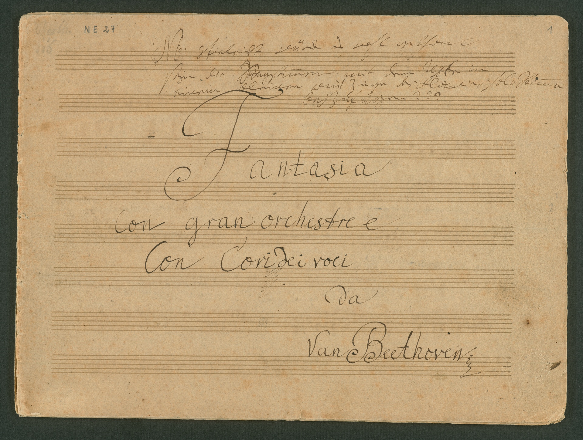 Diese von Beethoven überprüfte Abschrift der Klavierstimme ist die einzig erhaltene Stichvorlage der deutschen Originalausgabe der Chorfantasie, die bei Breitkopf & Härtel in Leipzig verlegt wurde. Sie ist als Direktionsstimme eingerichtet, was dem Pianisten die Kontrolle des gesamten musikalischen Verlaufes gewährleistet: an entscheidenden Stellen stehen kleinere Stichnoten, meist mit der entsprechenden Instrumentangabe, die das Tutti im Orchester oder entscheidende Phrasen einzelner Instrumente andeuten. Auch die Originalausgabe ist eine Direktionsstimme. Der besseren Übersicht wegen erhalten die Singstimmen im Druck von Breitkopf & Härtel ein eigenes System über der Klavierstimme. Beethoven hatte das in einem Brief an den Verleger angeregt: "bey der Fantasie mit Chören könnten sie vieleich[t] auch die singstimmen in die Klawierstimme hinein stechen lassen" (Beethoven an Breitkopf & Härtel, 21. August 1810, BGA 465) Auf die praktische Idee ist Beethoven wohl erst quasi in letzter Minute gekommen, denn auf der Titelseite der hier abgebildeten Klavierstimme finden wir eine entsprechende Eintragung seiner Hand: "Nb: Vielleicht würde es wohl gethan seyn die Singstimmen mit dem Texte in einem kleinen Auszuge der Klawier Solo Stimme beyzufügen???". Vielleicht ist die Einrichtung der Stimme auch der Grund, weshalb die zweite Hälfte der Stichvorlage verschollen ist: sie enthielt den Teil, bei dem für den Stecher die zusätzliche Notenzeile für die Singstimmen einzufügen gewesen wäre.(J.R.)
