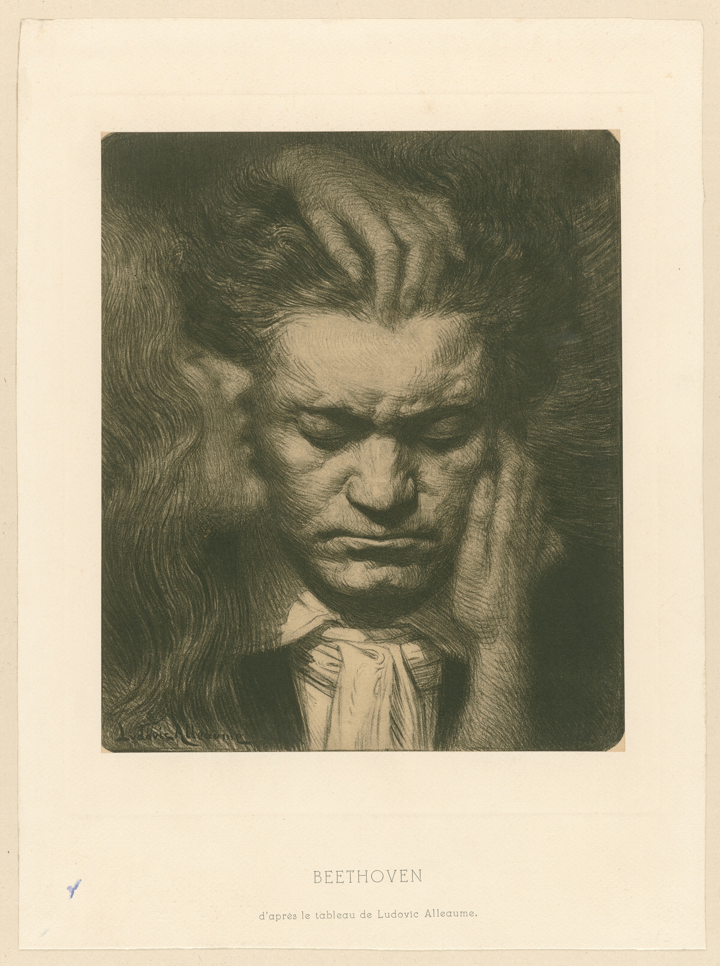 Ludwig van Beethoven, umarmt von einer weiblichen Gestalt, vielleicht einer Muse - Reproduktion einer Lithographie nach einem Gemälde von Ludovic Alleaume, Paris, um 1928