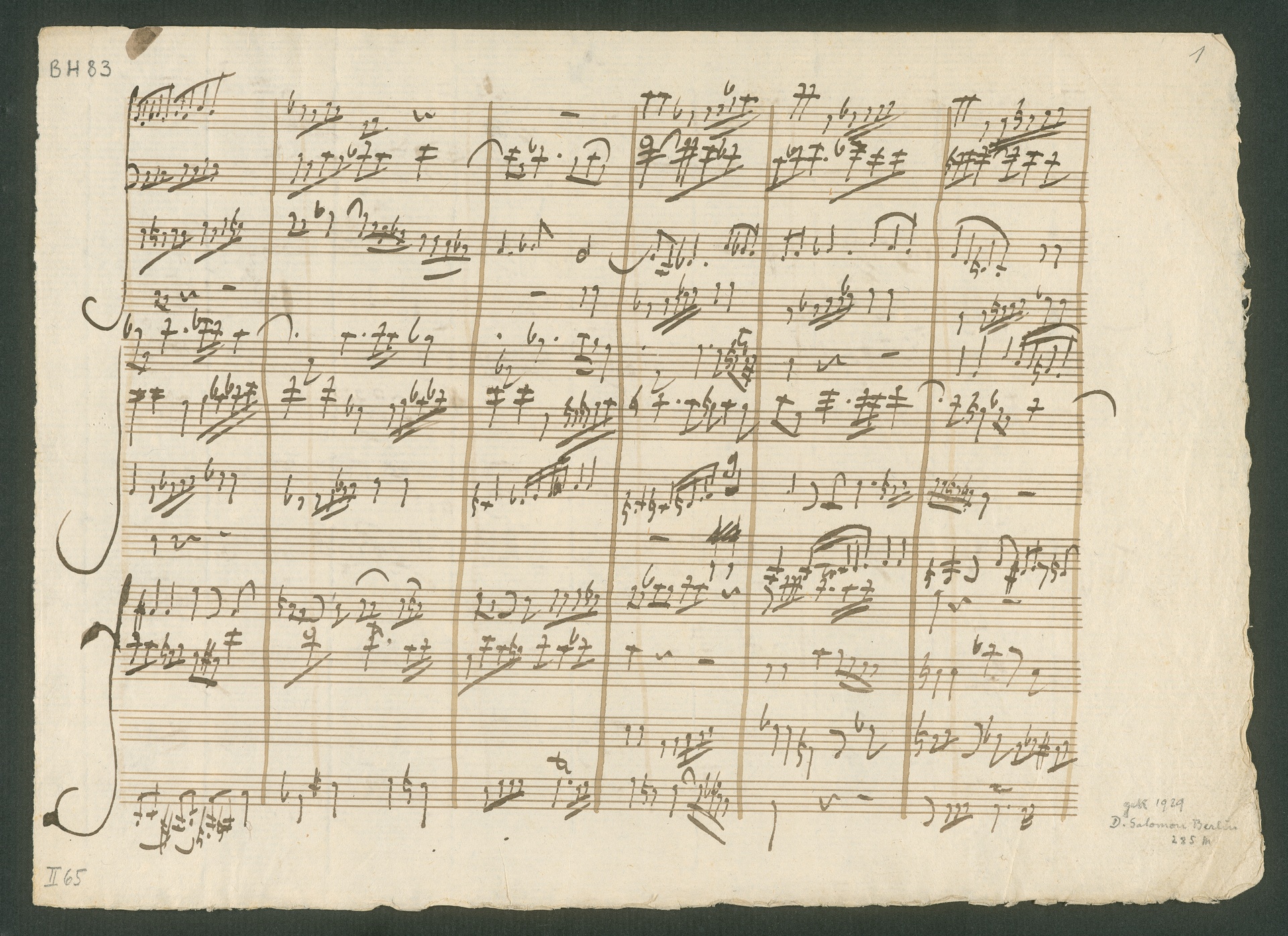 Von Beethovens Begegnung mit Wolfgang Amadeus Mozart gibt es Legenden, sie ist jedoch nicht definitiv nachweisbar. Wenn überhaupt, dann ist Beethoven nur einmal, 1787, als junger Mann, mit Mozart zusammengetroffen. Diese erste Wienreise musste er jedoch wegen der schweren Krankheit seiner Mutter (in deren Folge sie starb) nach kurzer Zeit abbrechen. Als Beethoven 1792 zum zweiten Mal nach Wien kam (und dort blieb), lebte Mozart schon nicht mehr. Beethoven verehrte und bewunderte Mozart sehr und studierte dessen Werke. Wohl um die Kompositionsweise und Satztechnik besser verstehen zu können, schrieb er sich einige Kompositionen Mozarts ab, wie z.B. die Fuge KV 426 für zwei Klaviere. Beethoven kopierte sie der besseren Übersicht wegen in Partitur. Säuberlich untereinander geschrieben lässt sich der Notentext einfach besser studieren. (J.R.)