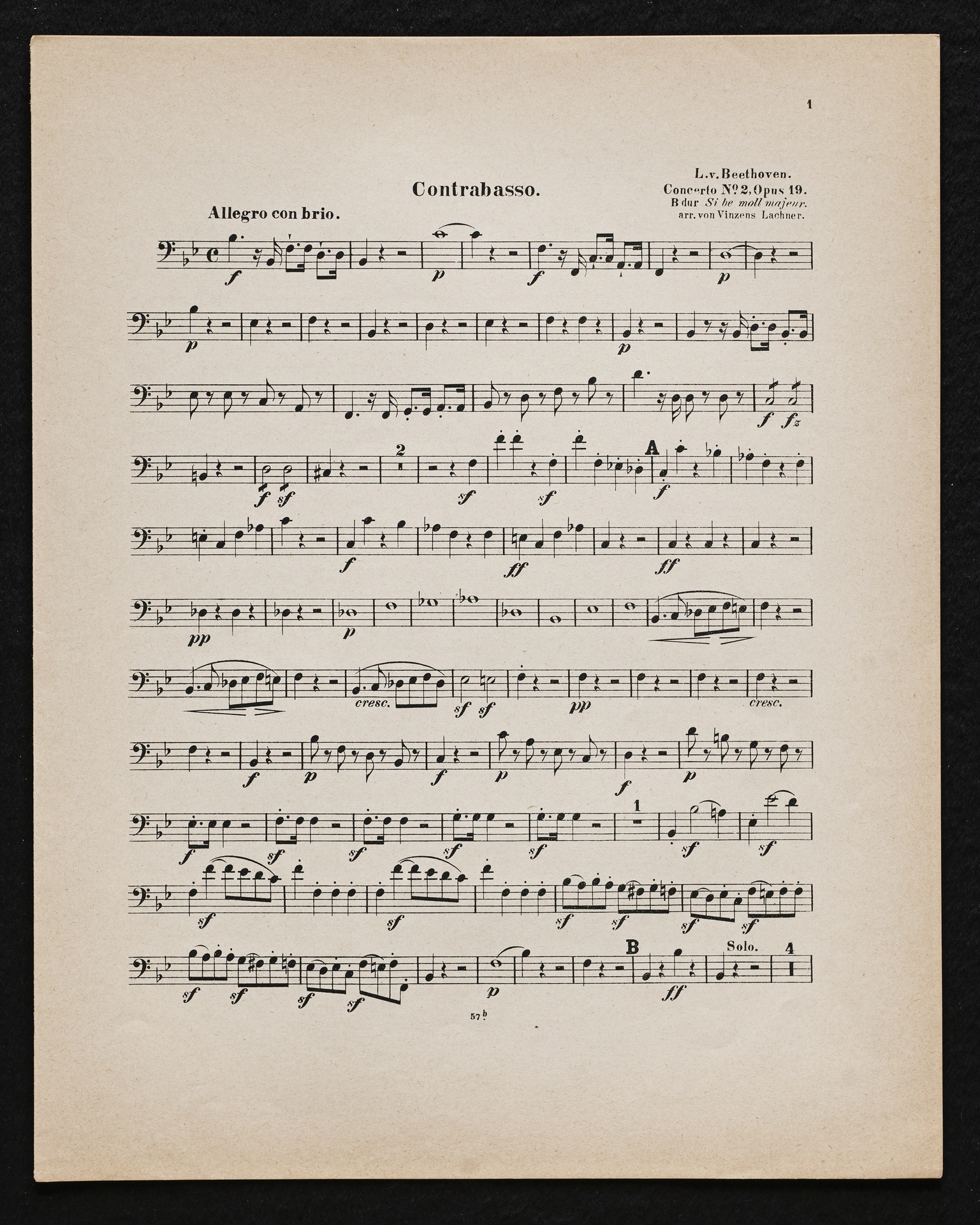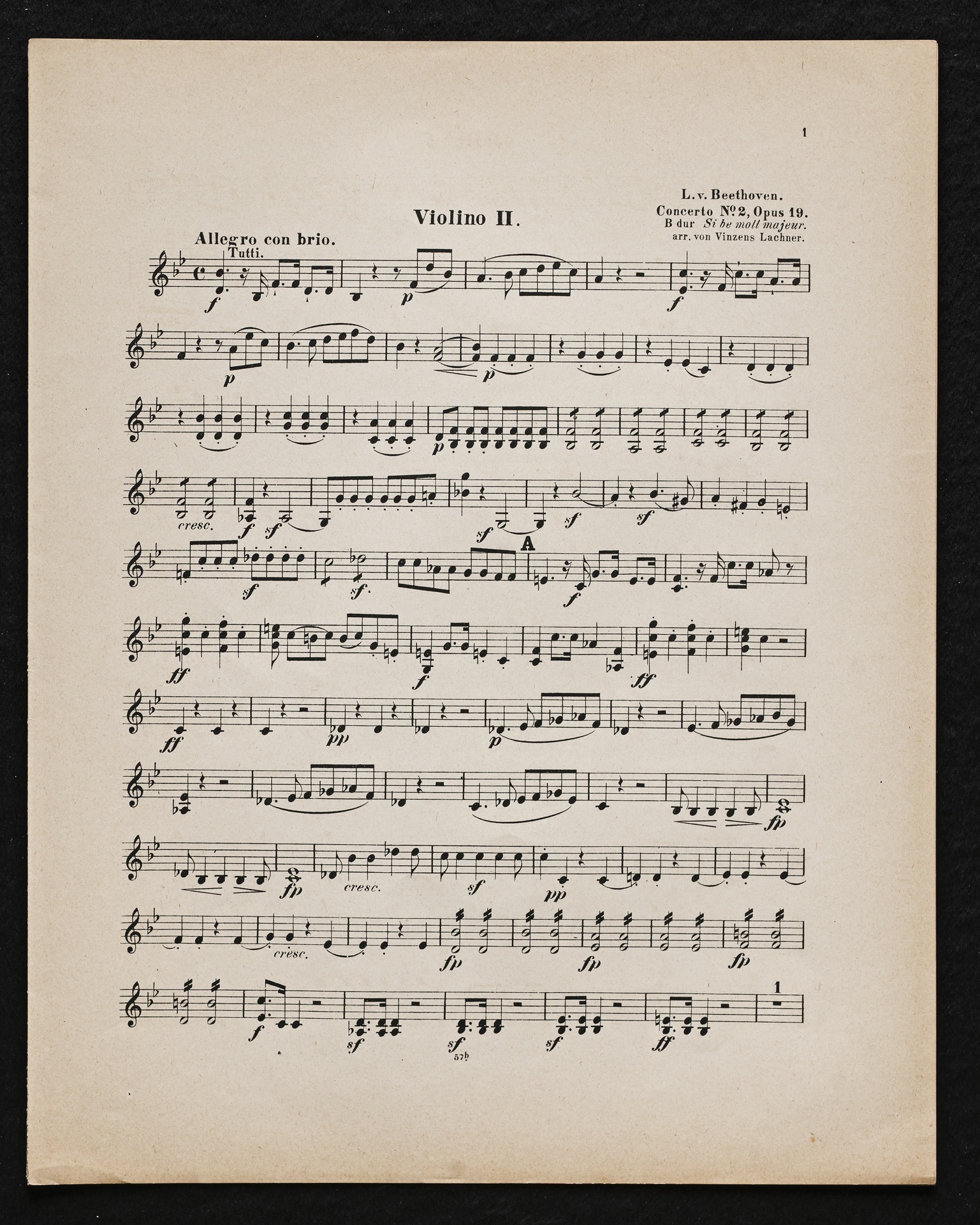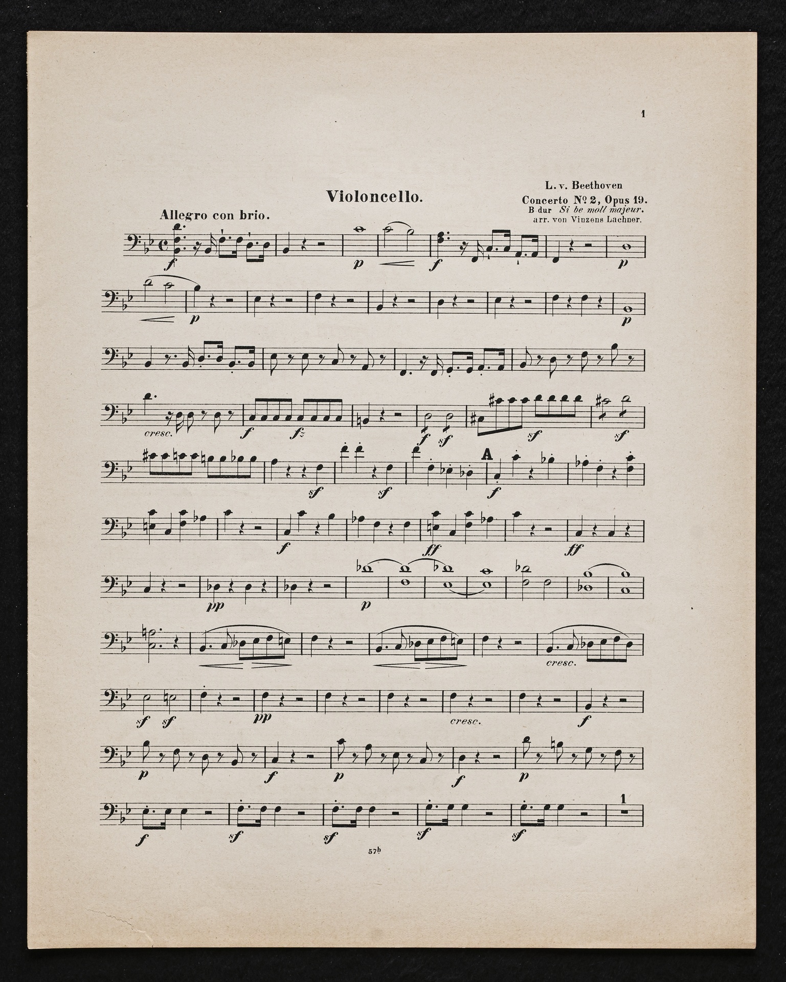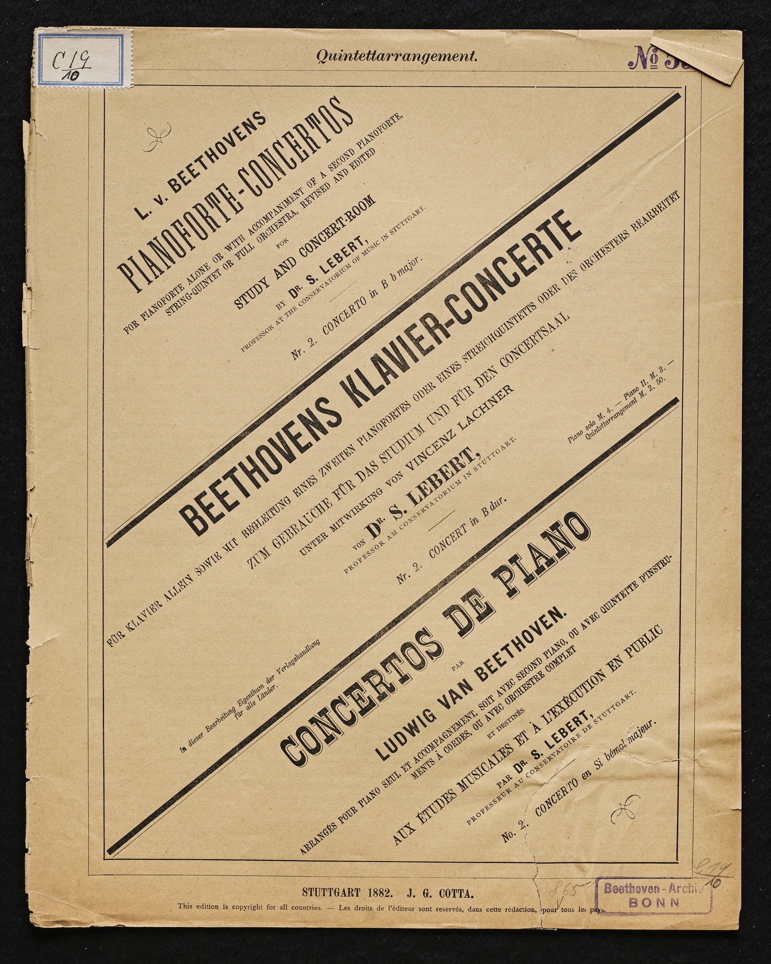 Ludwig van Beethoven, Konzert für Klavier und Orchester Nr. 2 (B-Dur) op. 19, Bearbeitung für Klavier, 2 Violinen, Viola, Violoncello und Kontrabass von Sigmund Lebert und Vincenz Lachner, Streicherstimmen, Cotta, 47