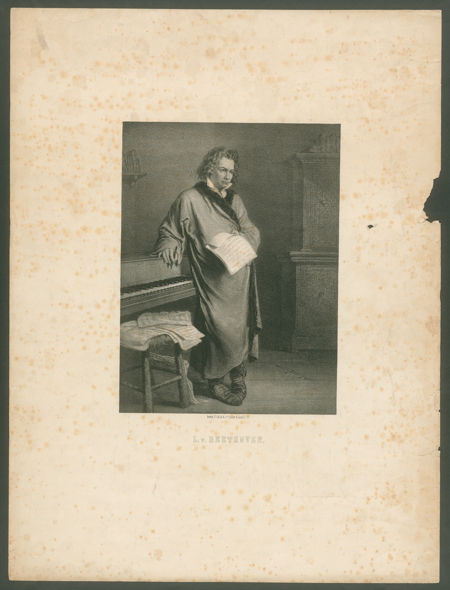 Beethoven beim Komponieren am Klavier stehend - Lithographie von Franz Hecht nach einem Gemälde von Edouard Jean Conrad Hamman, Berlin, 2. Hälfte 19. Jahrhundert