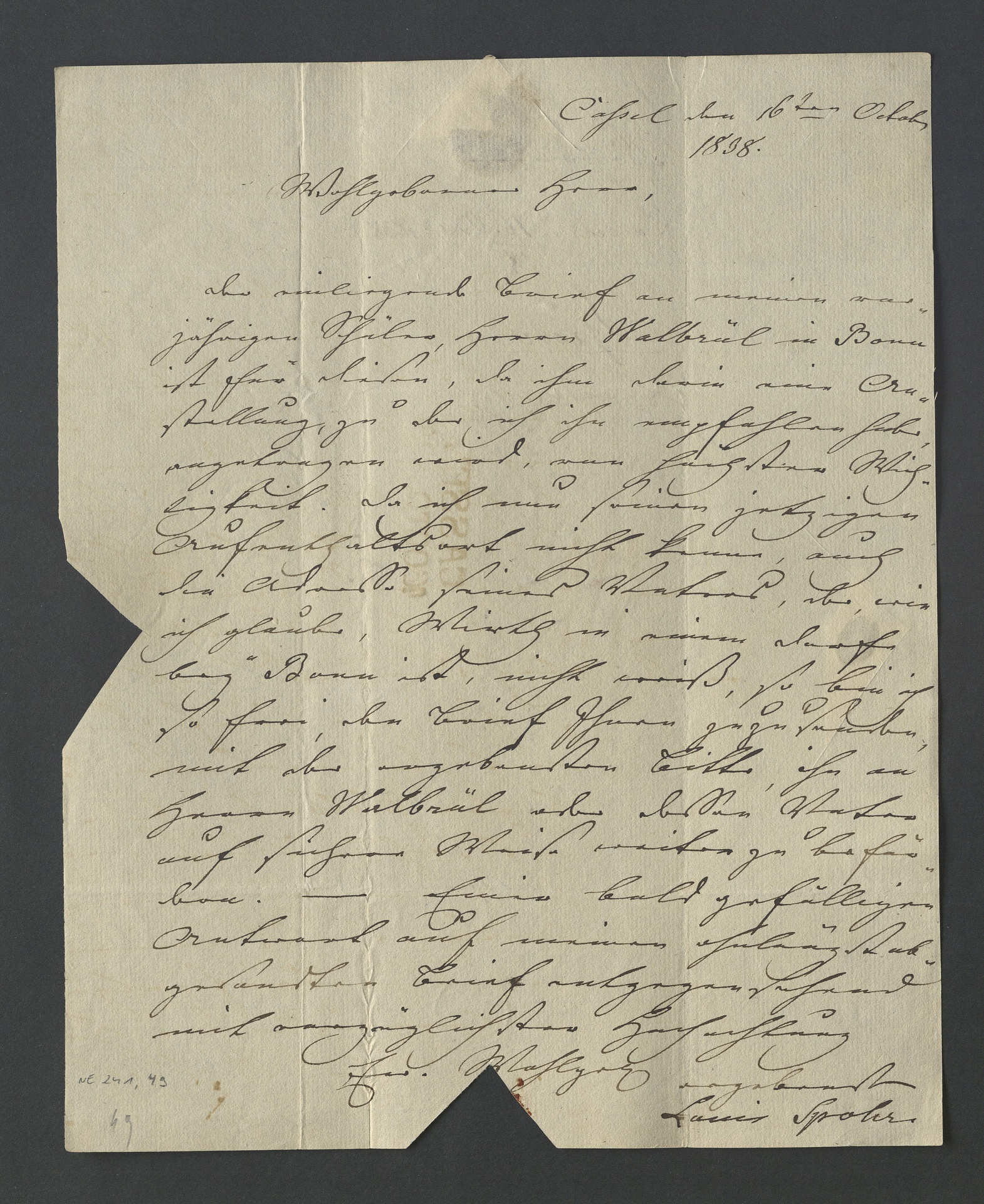 Text: "Wohlgeborner Herr, Der einliegende Brief an meinen vorjährigen Schüler, Herrn Walbrül in Bonn ist für diesen, da ihm darin eine Anstellung, zu der ich ihn empfohlen habe, angetragen wird, von höchster Wichtigkeit. Da ich nun seinen Aufenthaltsort nicht kenne, auch die Adresse seines Vaters, der, wie ich glaube, Wirth in einem Dorfe bey Bonn ist, nicht weiß, so bin ich so frei, den Brief Ihnen zu zu senden, mit der ergebensten Bitte, ihn an Herrn Walbrül oder dessen Vater auf sichere Weise weiter zu befördern. - Einer bald gefälligen Antwort auf meinen ohnlängst abgesendeten Brief entgegensehend mit vorzüglicher Hochachtung Ew. Wohlgeb. ergebenster Louis Spohr". Karl Traugott Goldbach, Spohr-Briefe: <http://bit.ly/1SrKJon>
