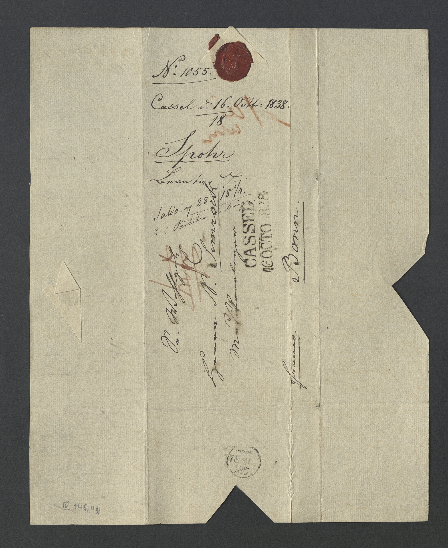 Spohr bittet den Verlag um Weiterbeförderung eines wichtigen Schreibens an einen Herrn Waldbrül in Bonn, dessen Adresse er nicht kennt.