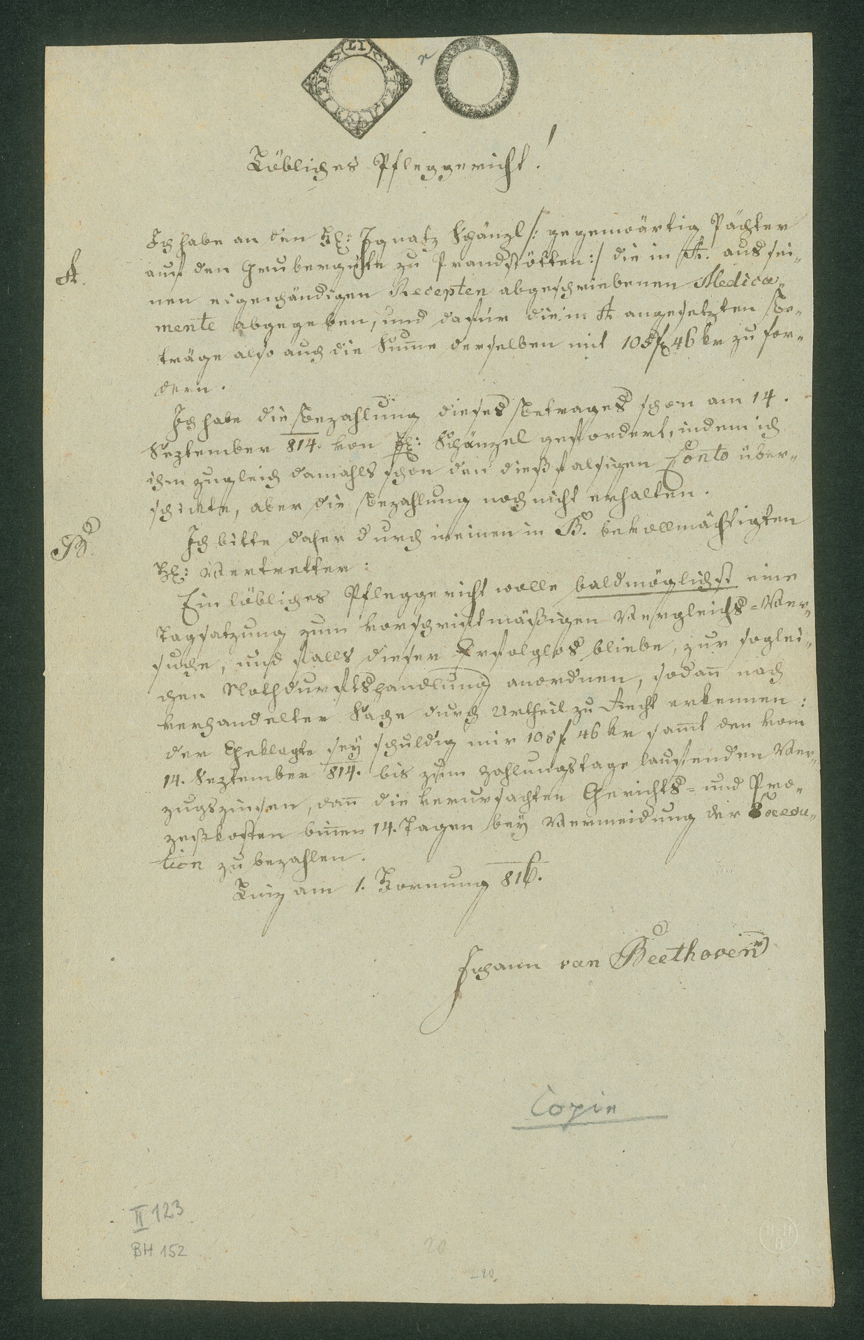 Der Apotheker Johann van Beethoven, Beethovens Bruder, fordert das Pflegegericht auf, Schulden für Medikamente einzutreiben, die er schon zwei Jahre zuvor hergestellt und geliefert hatte. Einem Herrn von Schantzl hatte Johann am 16. Januar 1816 ebenfalls eine Rechnung für Medikamente ausgestellt, siehe BH 151. (J.R.)