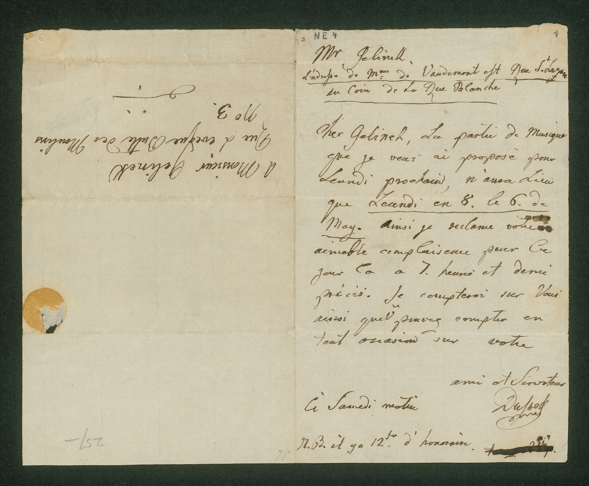 Dussek teilt Gelinek mit, eine gemeinsam geplante "partie de musique" müsse von kommenden Montag auf Montag, den 6. Mai verschoben werden. Er bittet Gelinek, spätesten um halb sieben da zu sein (das Konzert soll um acht Uhr beginnen).