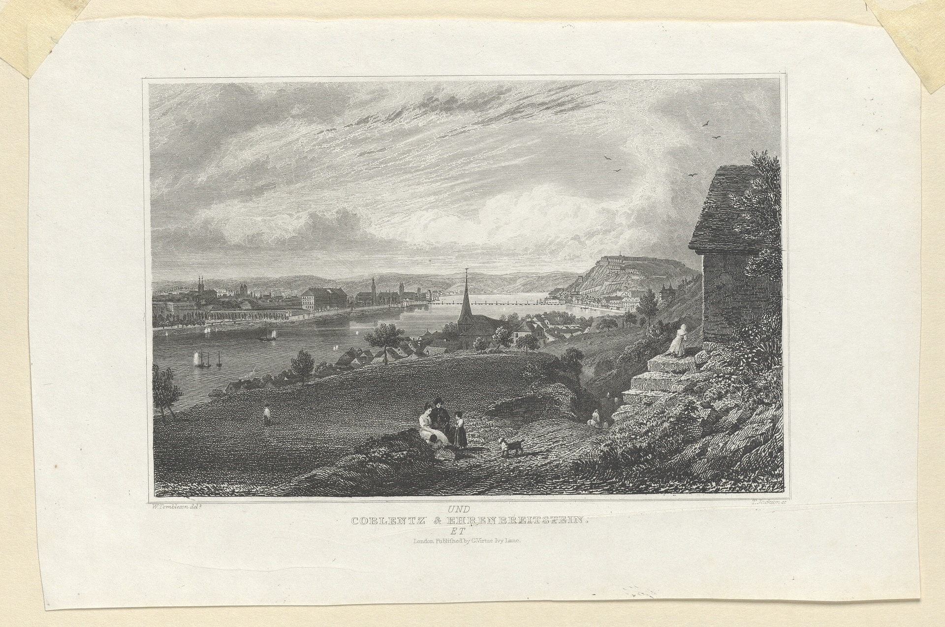 Blick auf die Stadt Koblenz und die Festung Ehrenbreitstein, 1. Drittel 19. Jahrhundert - Stahlstich von T. Jackson nach einer Zeichnung von William Tombleson