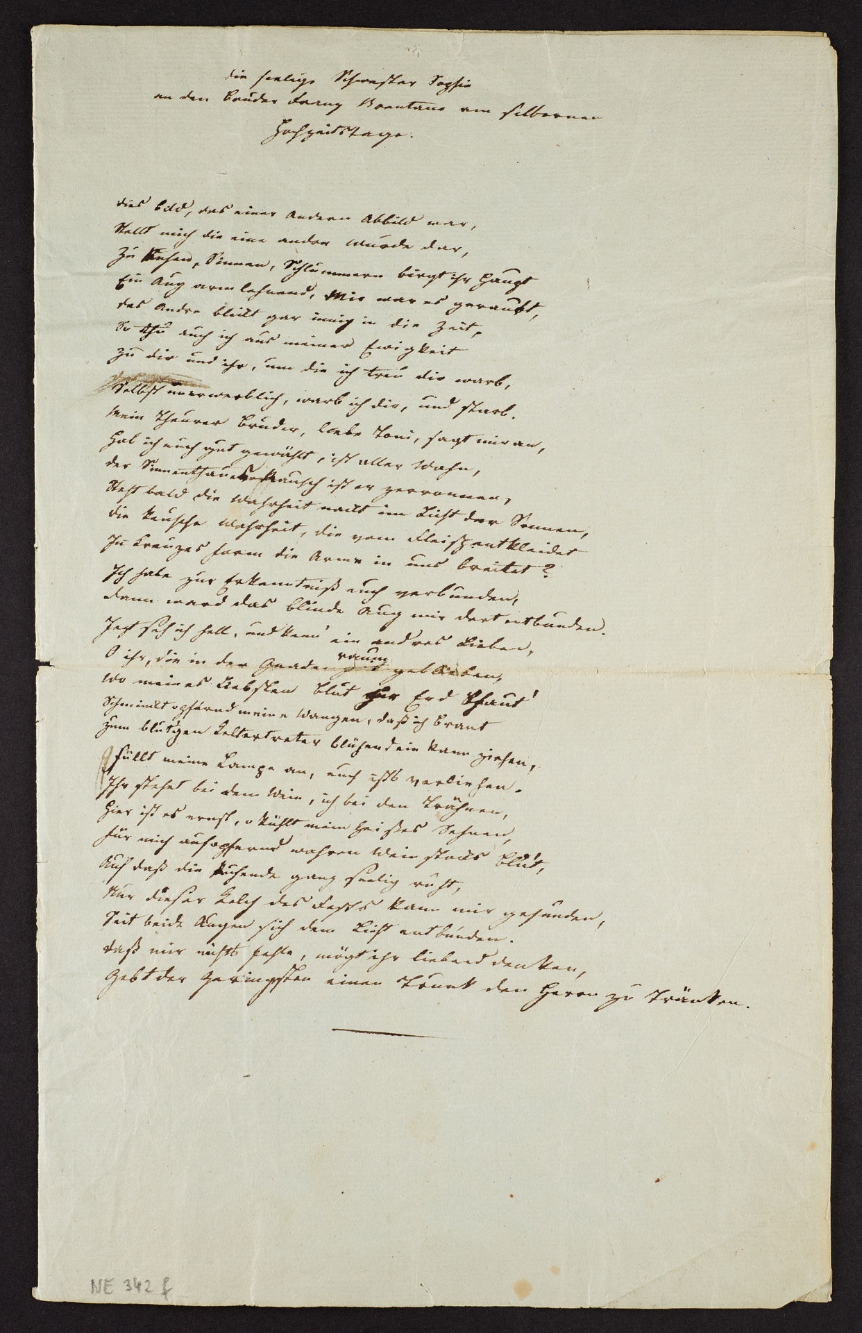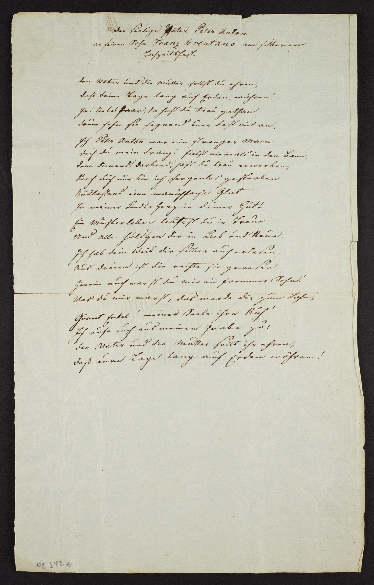 Text NE 342 e: "der seelige Vater Peter Anton / an seinen Sohn Franz Brentano am silbernen / Hochzeitsfest. / den Vater und die Mutter sollst du ehren, / daß deine Tage lang auf Erden währen! / Ja! liebes Paar, da[s] hast du treu gethan / drum sehn sie segnend euer Fest mit an. / Ich Peter Anton war ein strenger Mann / doch du mein Franz! fielst niemals in den Bann, / denn dienend, darbend, hast du treu erworben, / durch dich nur bin ich sorgenlos gestorben / Rücklassend eine manichfache Glut / In meiner Länder Herz in deiner Hut! / Ein Musterleben lebtest du in Treue / Und alle huldigen dir in Lieb und Reue. / Ich hab dein Weib dir selber auserlesen, / Aus dreien ist die rechte sie gewesen. / Hierin auch warst du mir ein frommer Sohn! / Was du mir warst, das werde dir zum Lohn! / Gönnt Enkel! meiner Seele ihre Ruh' / Ich rufe euch aus meinem Grabe zu: / den Vater und die Mutter sollt ihr ehren, / daß eure Tage lang auf Erden währen!"