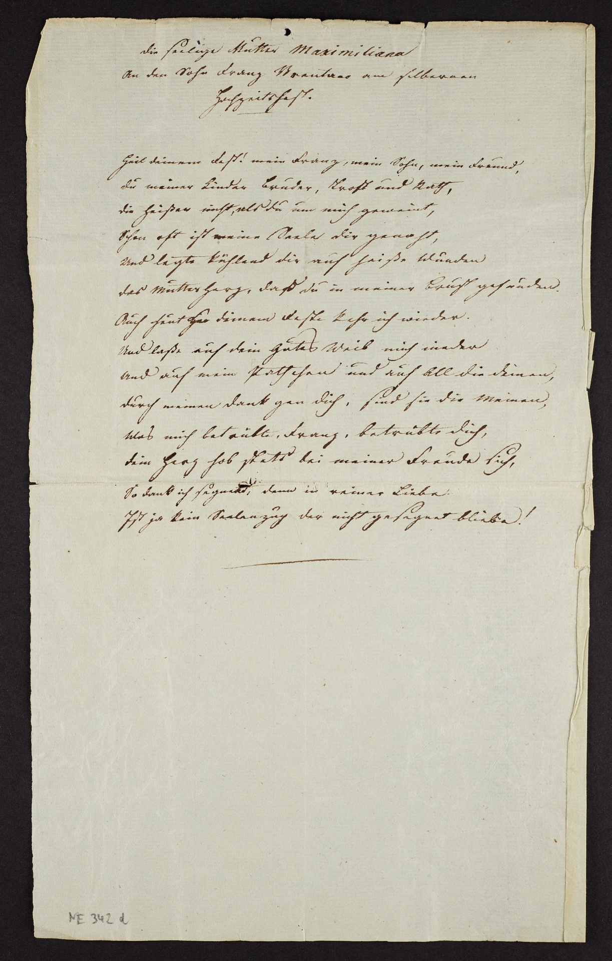 Text NE 342 d: "Die seelige Mutter Maximiliana / an den Sohn Franz Brentano am silbernen / Hochzeitsfest. / Heil deinem Fest! mein Franz, mein Sohn, mein Freund. / Du meiner Lieder Bruder Trost und Halt, / die heißer nicht, als du um mich geweint, / Schon oft ist meine seele dir genaht, / Und legte kühlend dir auf heiße Wunden / das Mutterherz, das du in meiner Brust gefunden. / Auch heut zu deinem Feste kehr ich wieder. / Und lasse auf dein gutes Weib mich nieder / Und auf mein Patchen und auf All die deinen, / durch meinen Dank gen dich, sind sie die Meinen, / was mich betrübte, Franz, / betrübte dich, / dein Herz hob stets bei meiner Freude sich, / So dank ich segnend denn in reiner Liebe. / Tust ja kein Seelenzug der nicht gesegnet bliebe!"