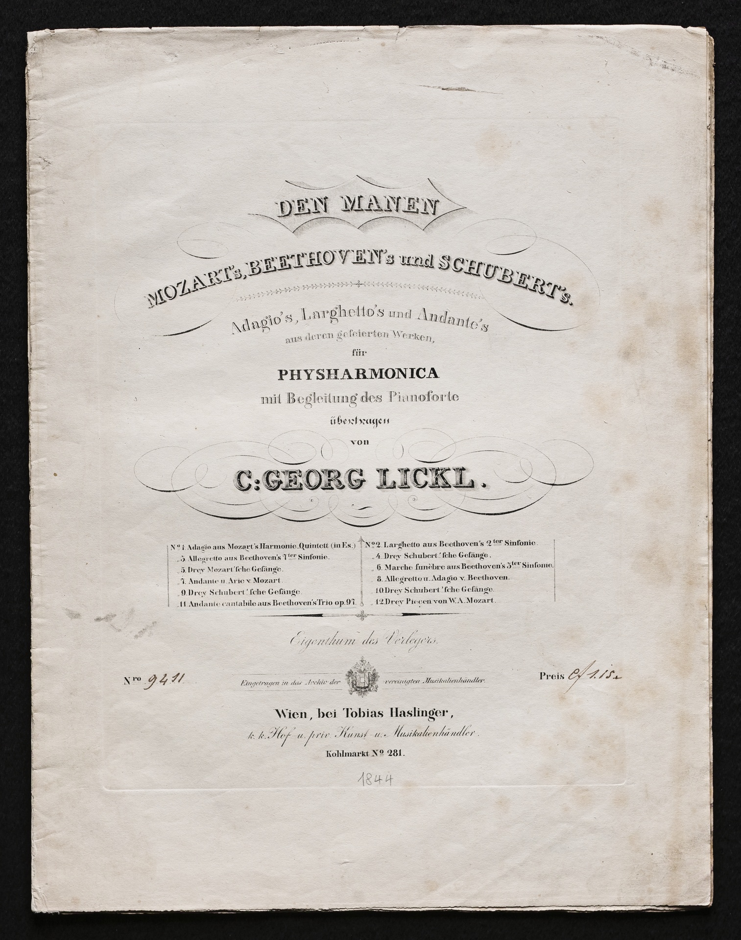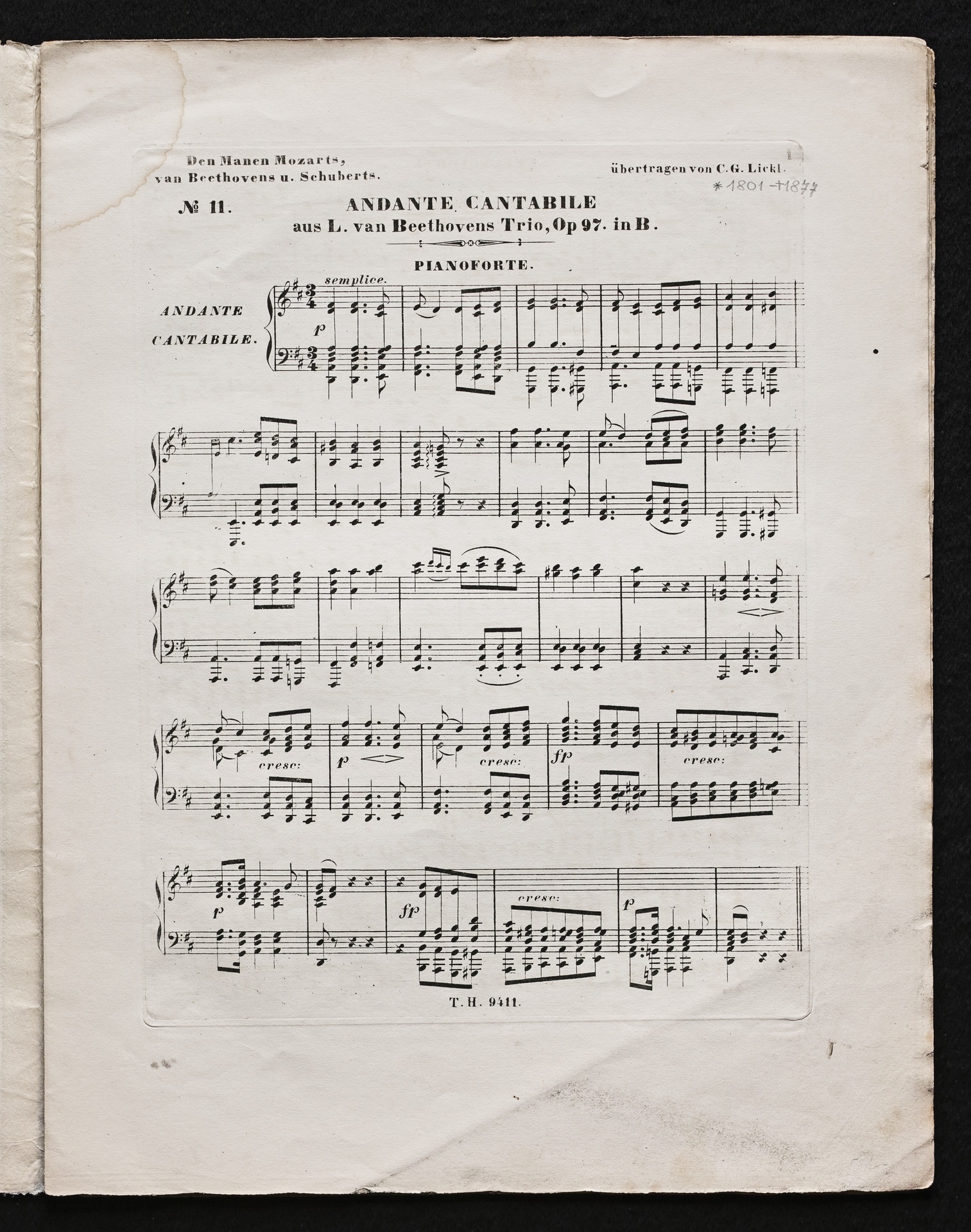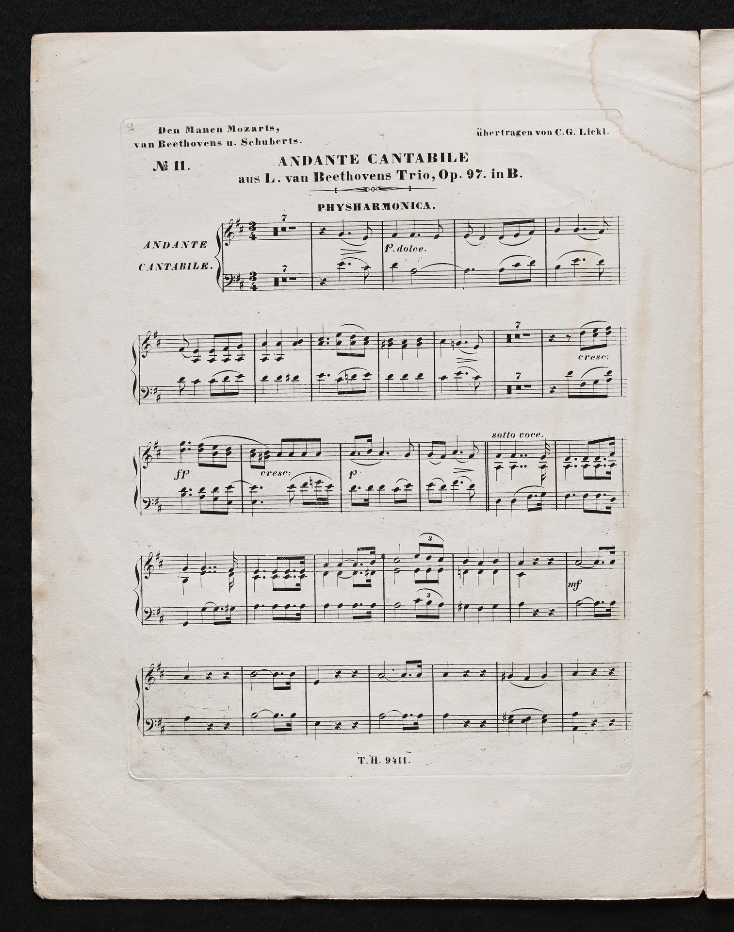 Ludwig van Beethoven, Trio für Klavier, Violine, Violoncello (B-Dur) op. 97, Bearbeitung für Klavier und Physharmonika von Carl Georg Lickl, Stimmen, Haslinger, 9411