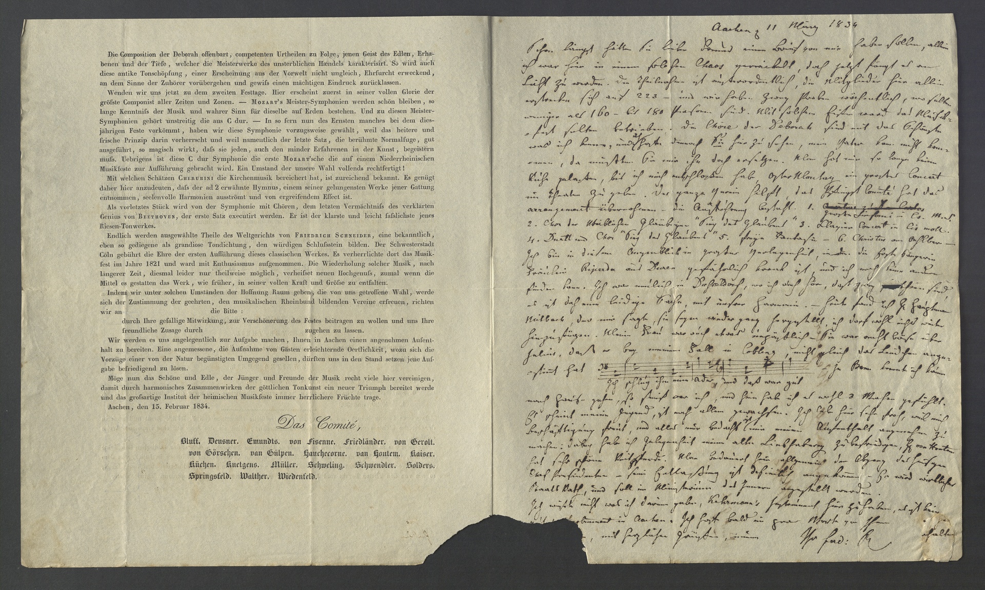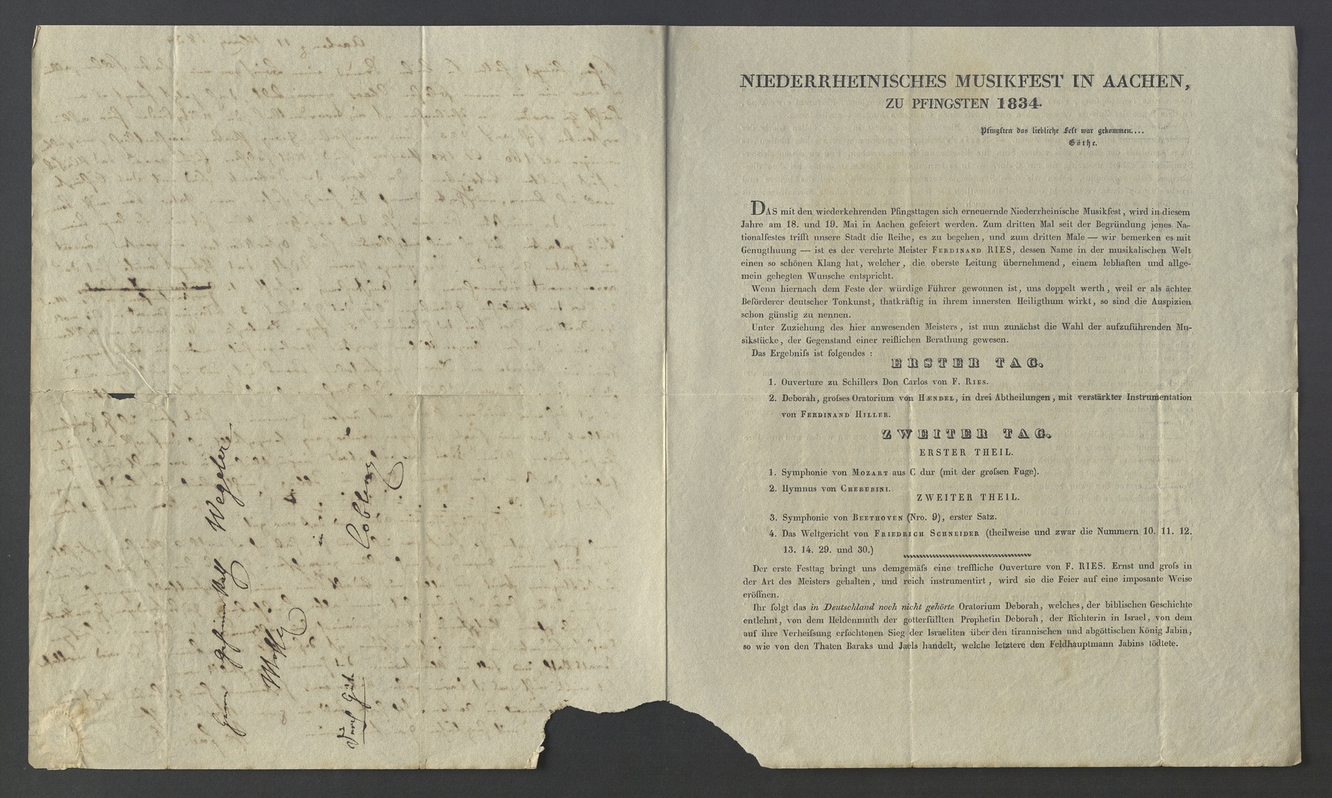 Ferdinand Ries, Brief an Franz Gerhard Wegeler in Koblenz, Aachen, 11. März 1834, geschrieben auf einer Ankündigung für das Niederrheinische Musikfest in Aachen zu Pfingsten 1834, Autograph