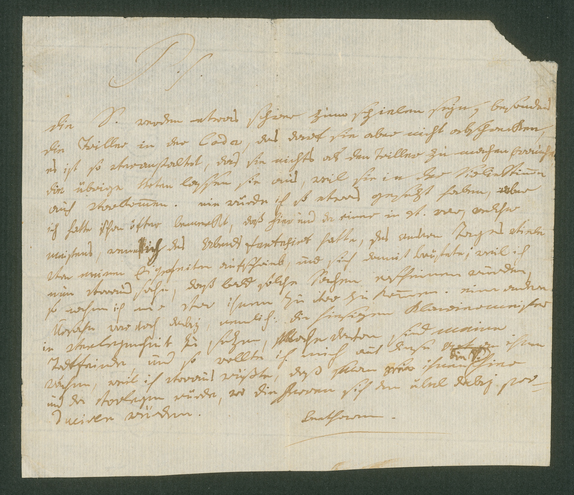 Das Postskriptum betrifft die Ausführung der Klavierstimme der ihr gewidmeten Variationen. Beethoven, der in Wien zuerst als Pianist Aufsehen erregte, beabsichtigte damit, "die hiesigen Klawiermeister in verlegenheit" zu bringen. An seinen "Todtfeinden" wolle er sich auf diese Weise rächen. Auch wollte er dadurch jenen Konkurrenten zuvorkommen, die "Eigenheiten" in seinen Improvisationen aufschrieben und als ihre eigene Erfindungen ausgaben. Beethoven gibt Eleonore eine Spielanweisung, für den Fall, dass die Triller in der Coda zu schwer für sie seien. (J.R.)