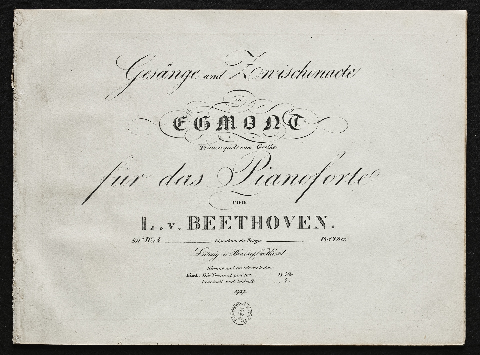Ludwig van Beethoven, Musik zu Johann Wolfgang von Goethes Trauerspiel "Egmont" op. 84, 1-9, Gesänge und Zwischenakte, Klavierauszug, Breitkopf und Härtel, 5787