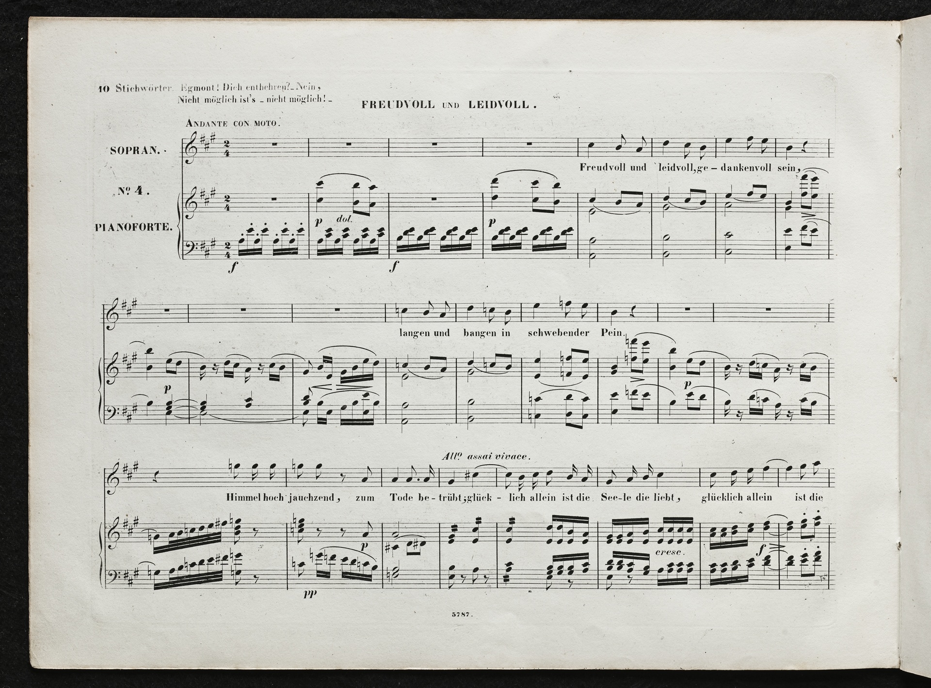 Ludwig van BeethovenJohann Wolfgang von Goethe, Musik zu Johann Wolfgang von Goethes Trauerspiel "Egmont" op. 84, 1-9, Gesänge und Zwischenakte, Klavierauszug, Breitkopf und Härtel, 5787