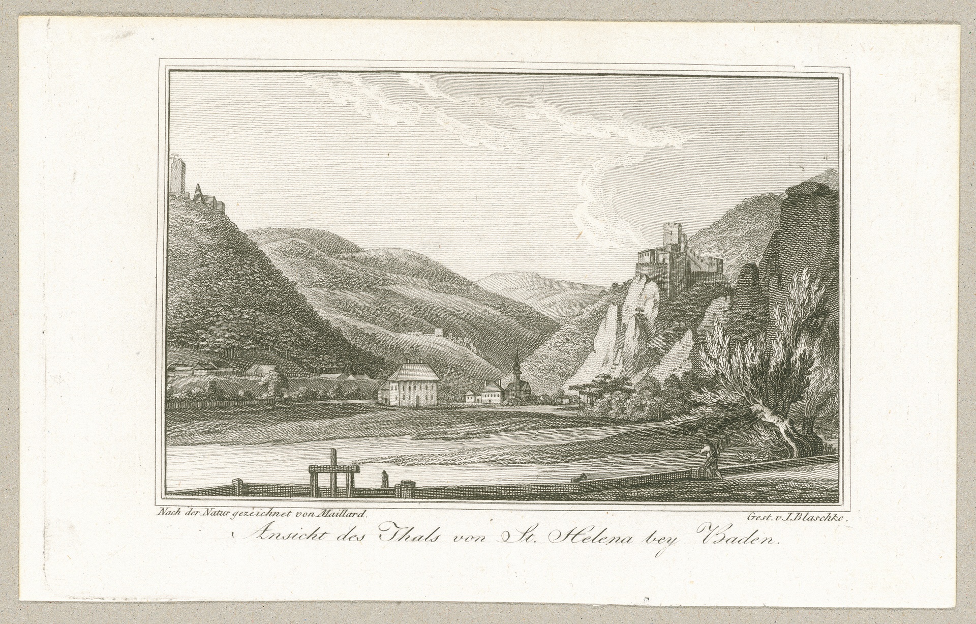 Das Helenental bei Baden mit Blick auf die Burgen "Rauhenstein" und "Rauheneck", um 1805 - Stich von János Blaschke nach einer Zeichnung von Ludwig Maillard, erschienen bei Doll, Wien, 1806