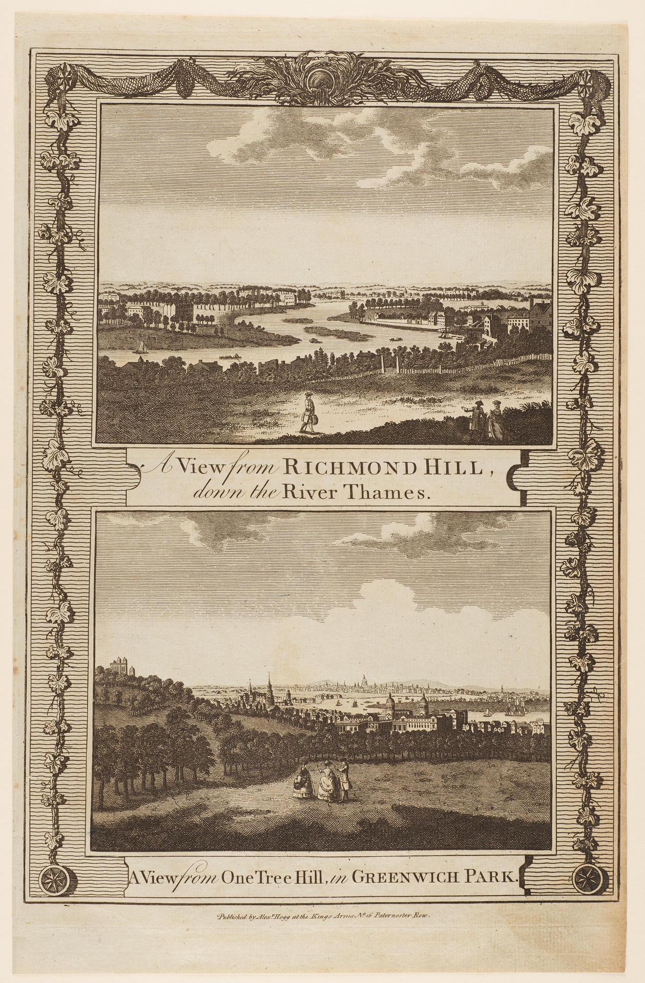 Zwei Ansichten von London und Umgebung, Blick vom Richmond Hill und Blick vom Greenich Park - Anonymer Stich, veröffentlicht von Alexander Hogg, London, 1784