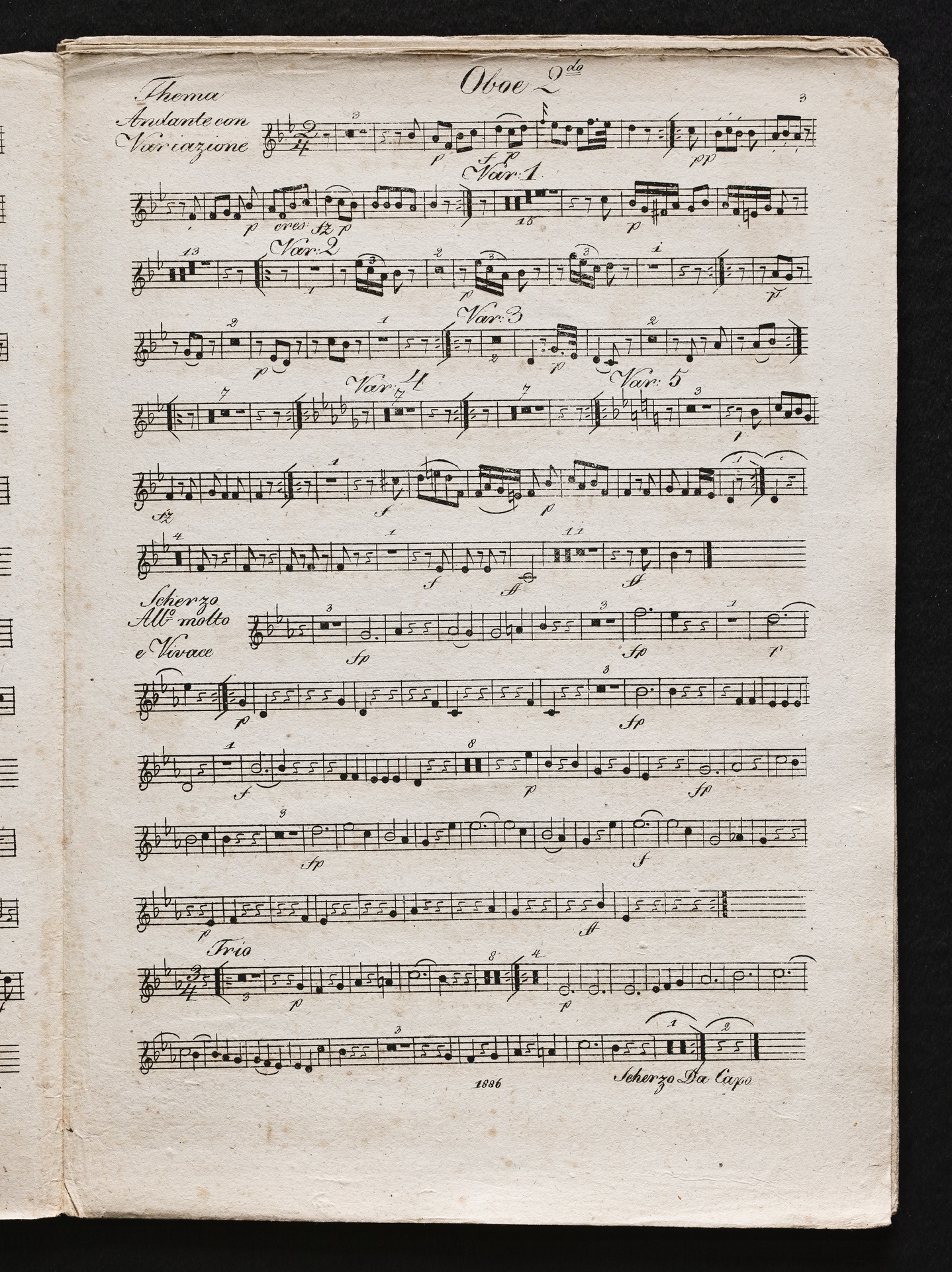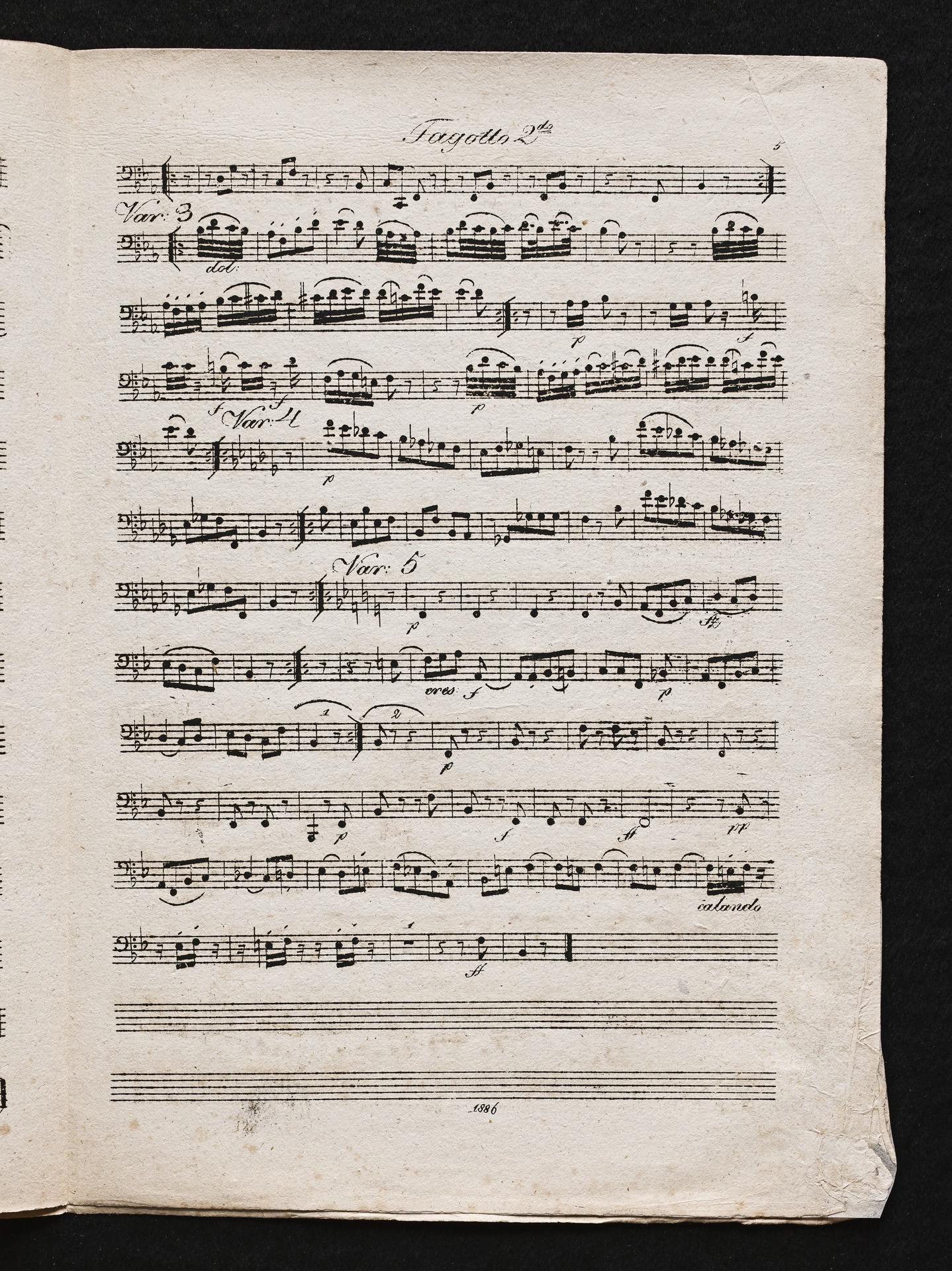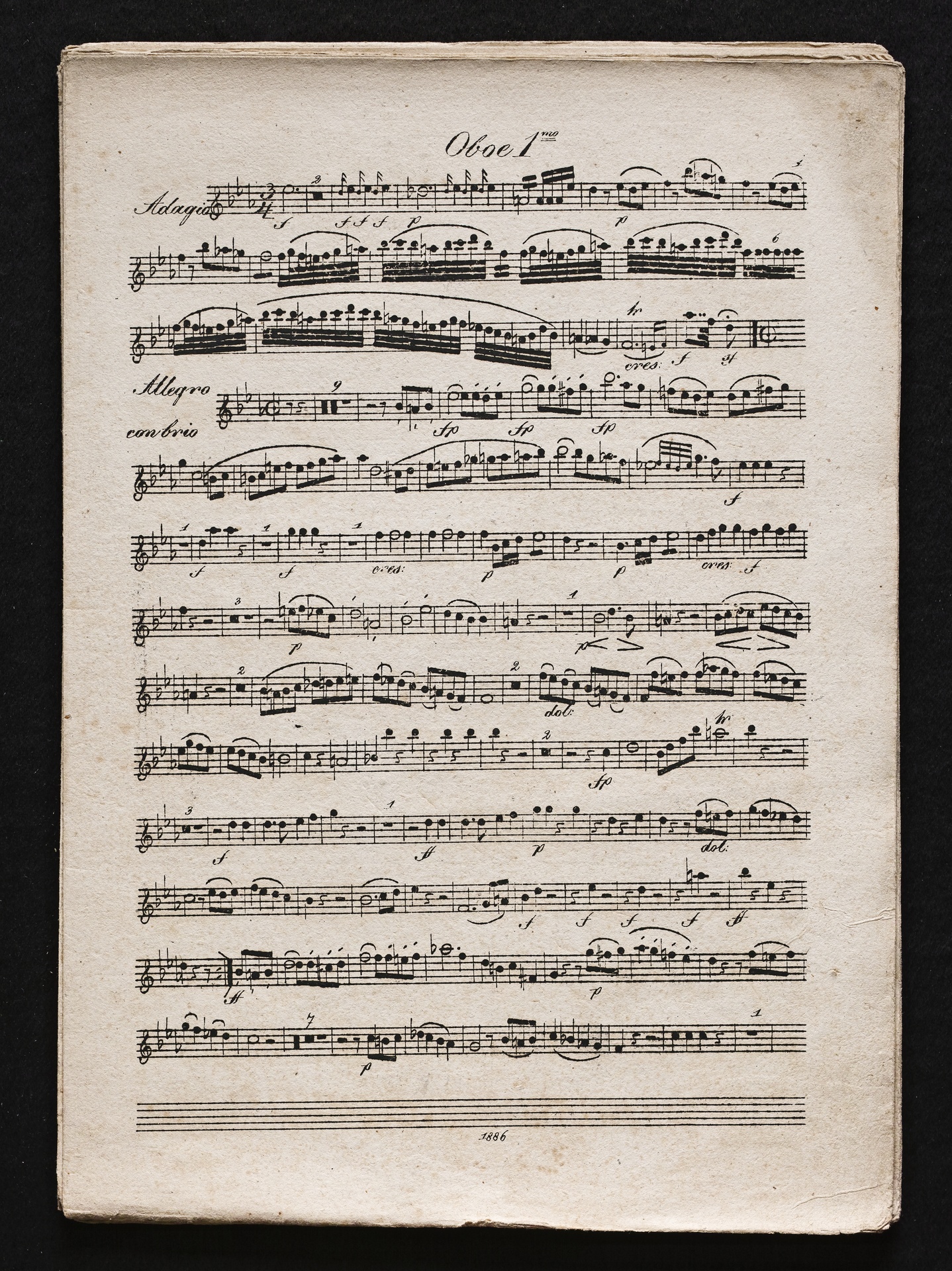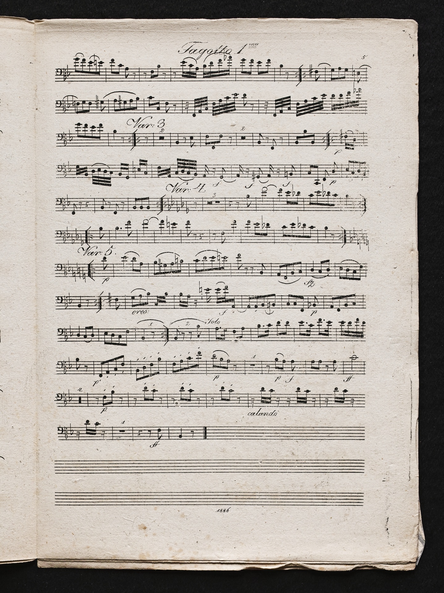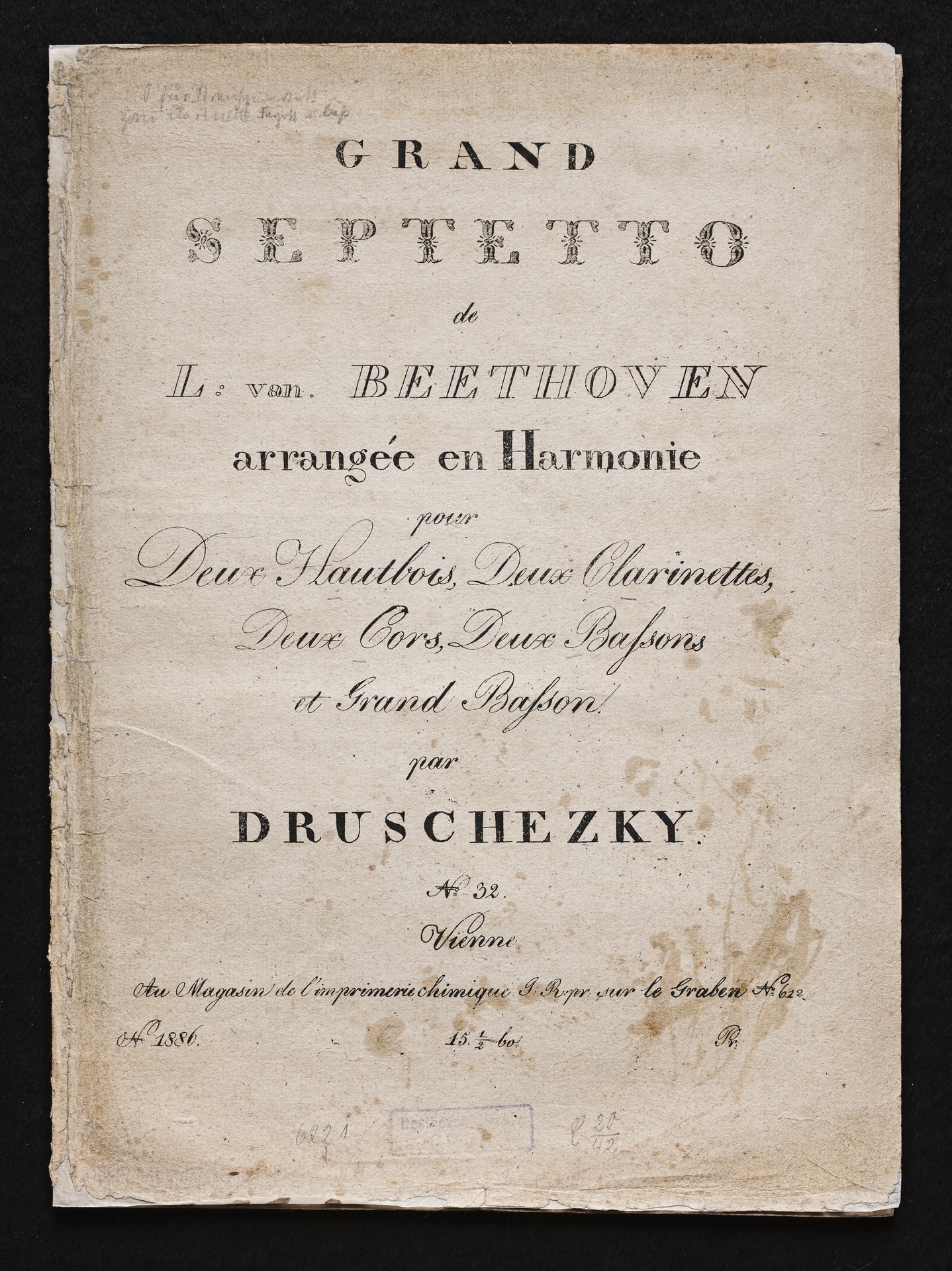 Ludwig van Beethoven, Septett für Violine, Viola, Klarinette, Horn, Fagott, Violoncello, Kontrabass (Es-Dur) op. 20, Bearbeitung für 2 Oboen, 2 Klarinetten, 2 Hörner, 2 Fagotte und Kontrafagott von Georg Druschetzky, Stimmen, Chemische Druckerei, 1886