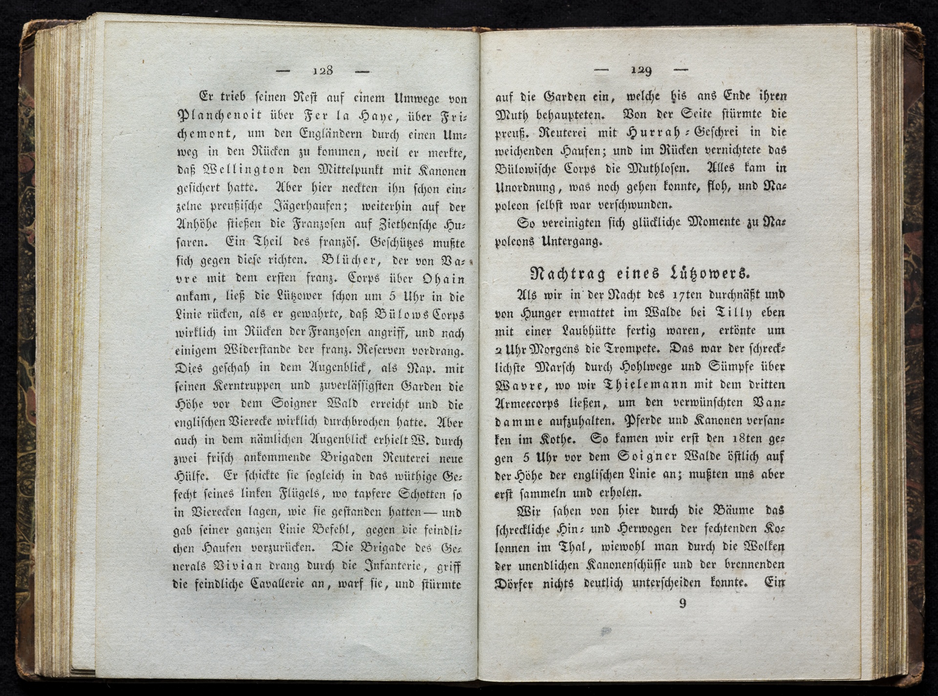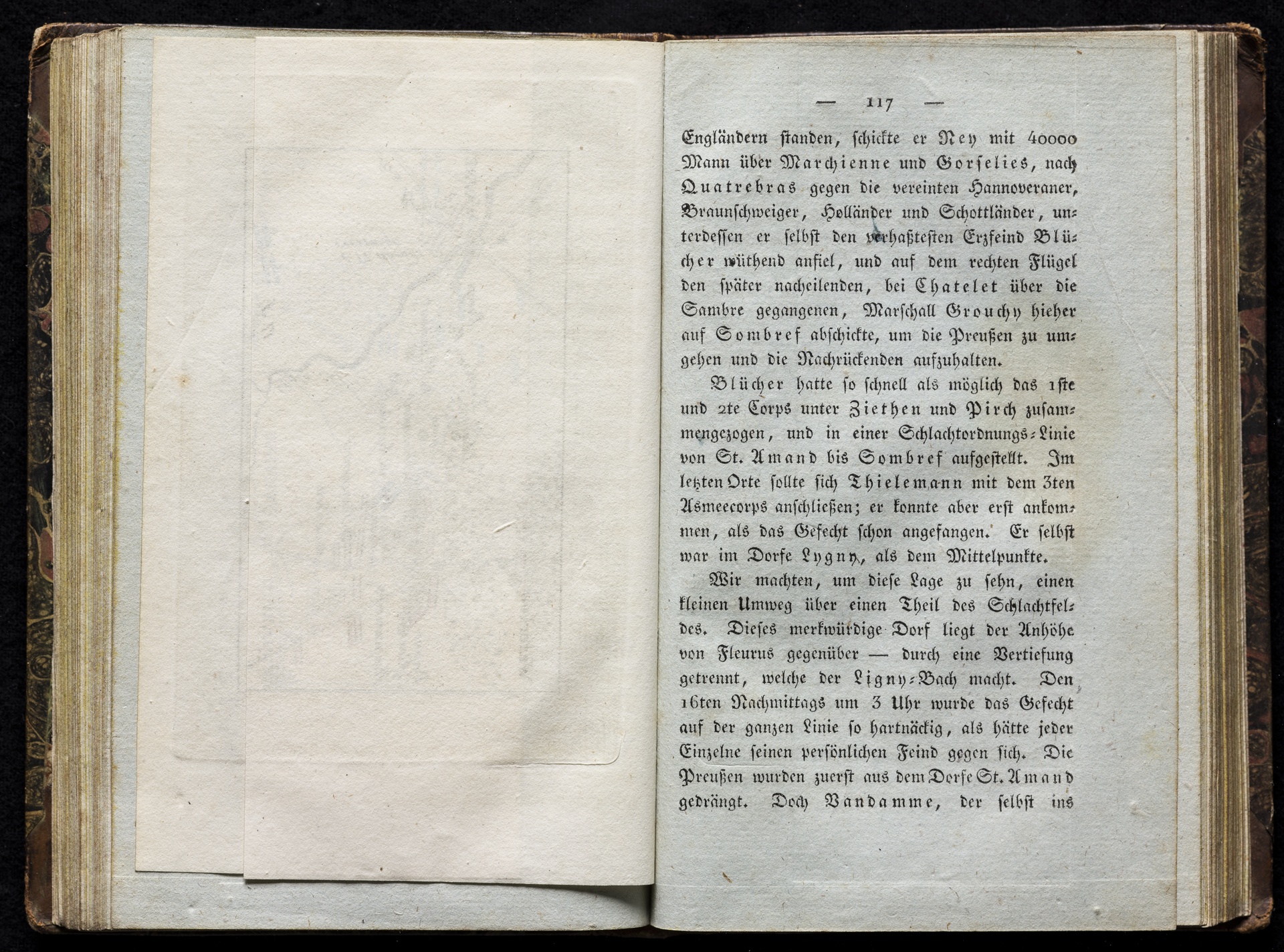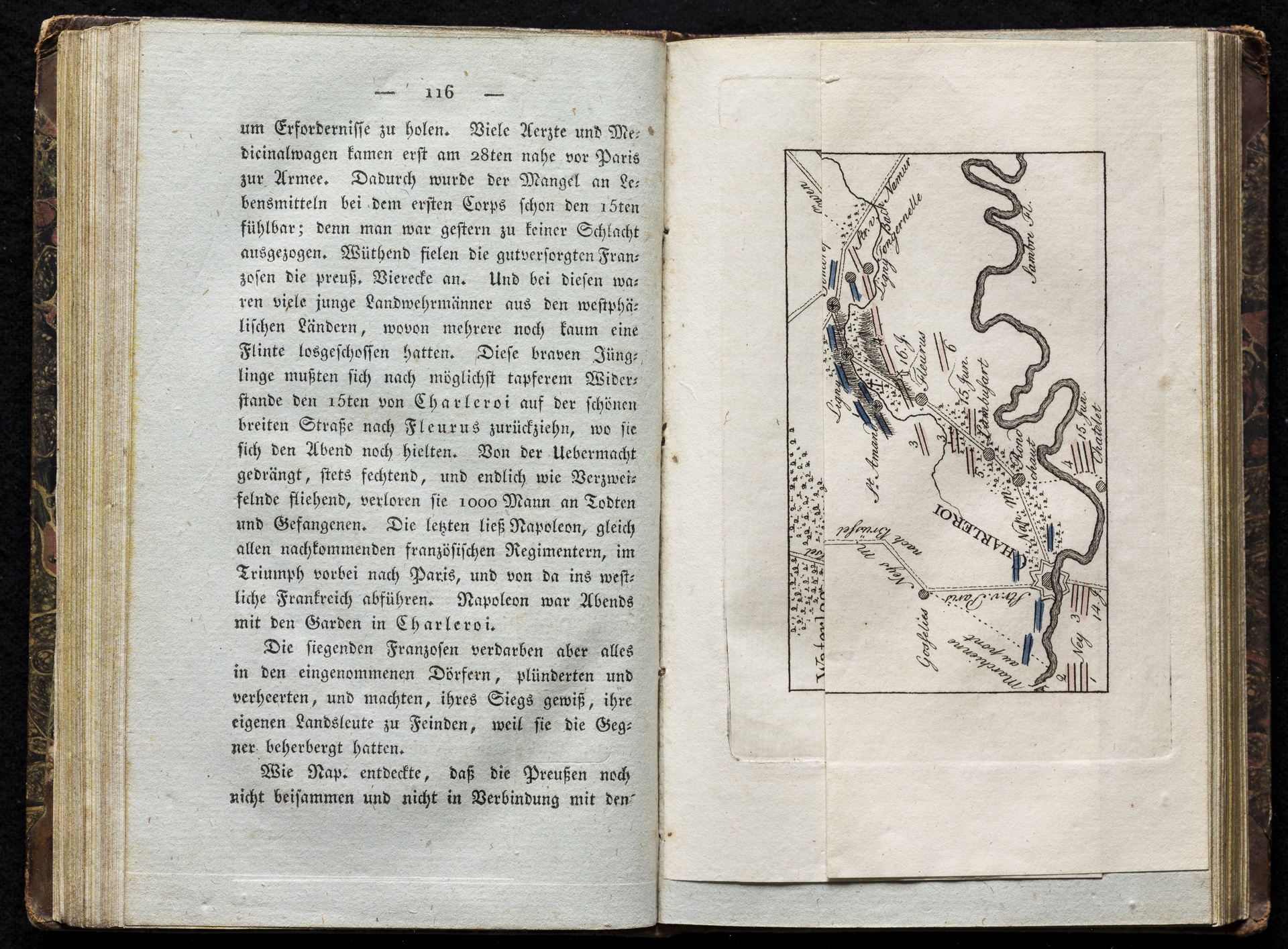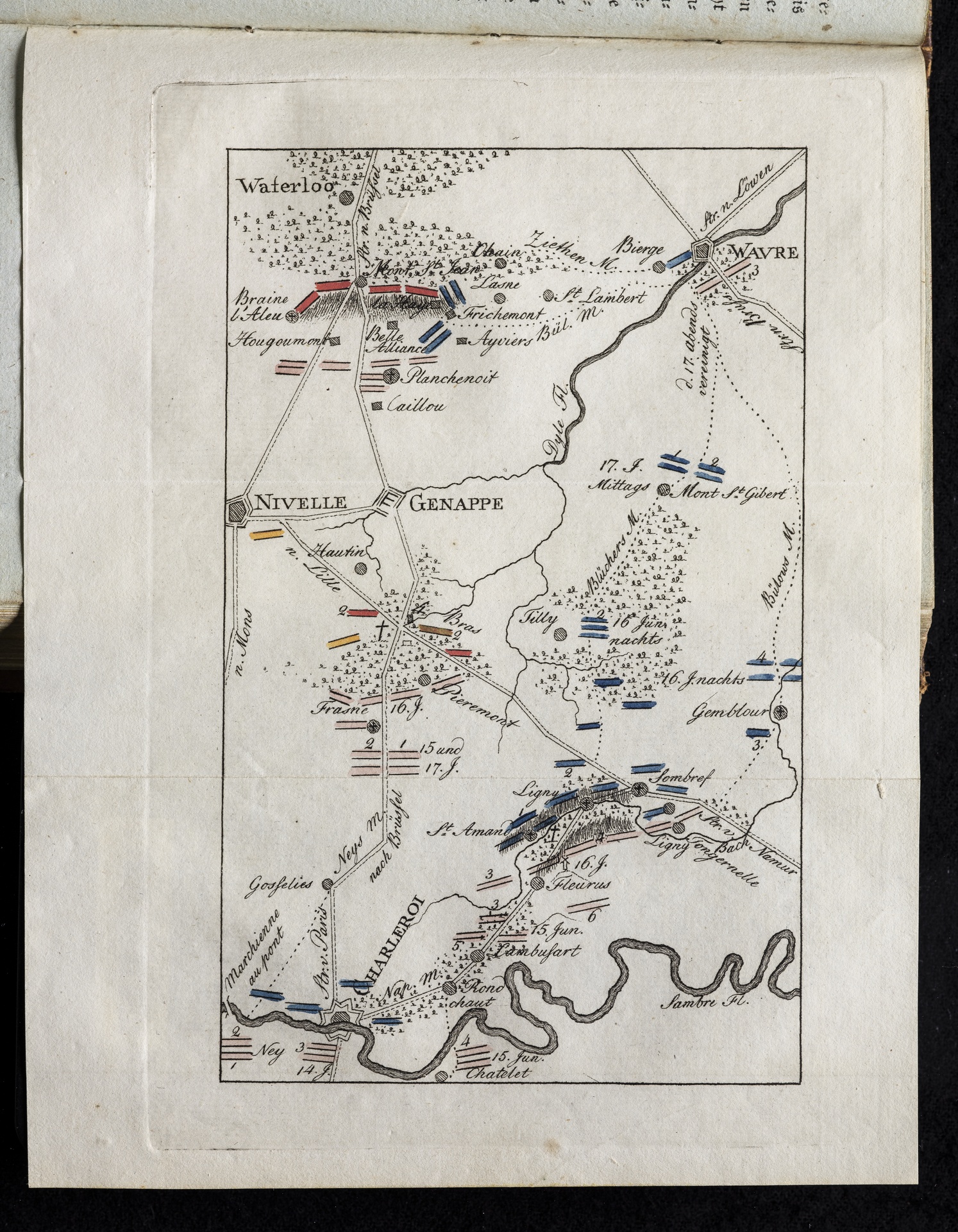 Karte der Gegend von Waterloo mit der Verteilung der Armeen, Juni 1815 - anonymer kolorierter Stich, erschienen bei Johann Georg Heyse, Bremen, 1816