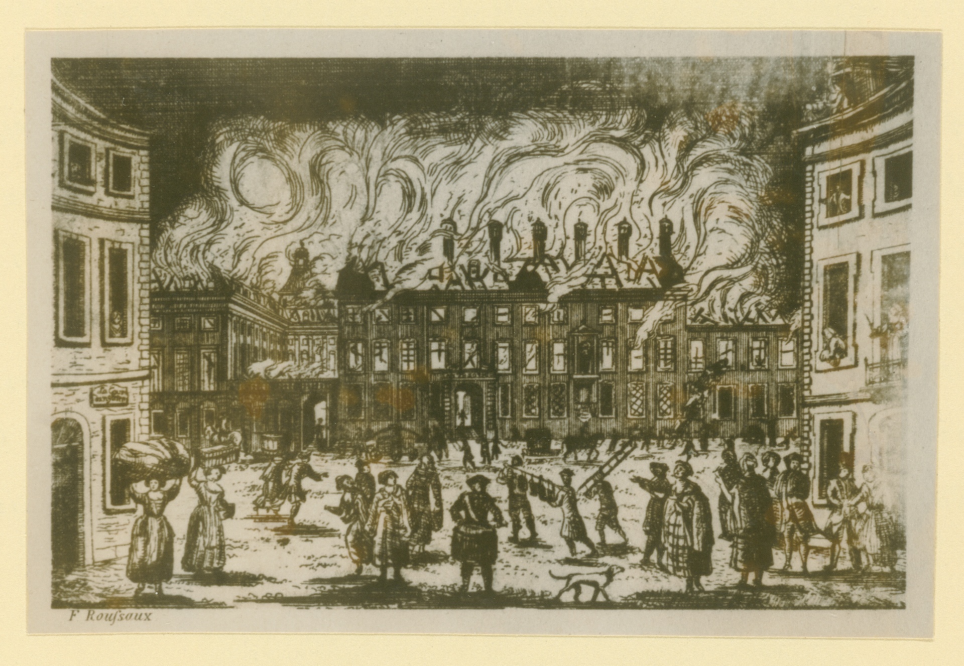 Der Brand des Bonner Residenzschlosses, 1777 - Fotografie einer Radierung von Franz Rousseau, wohl nach einer eigenen Zeichnung