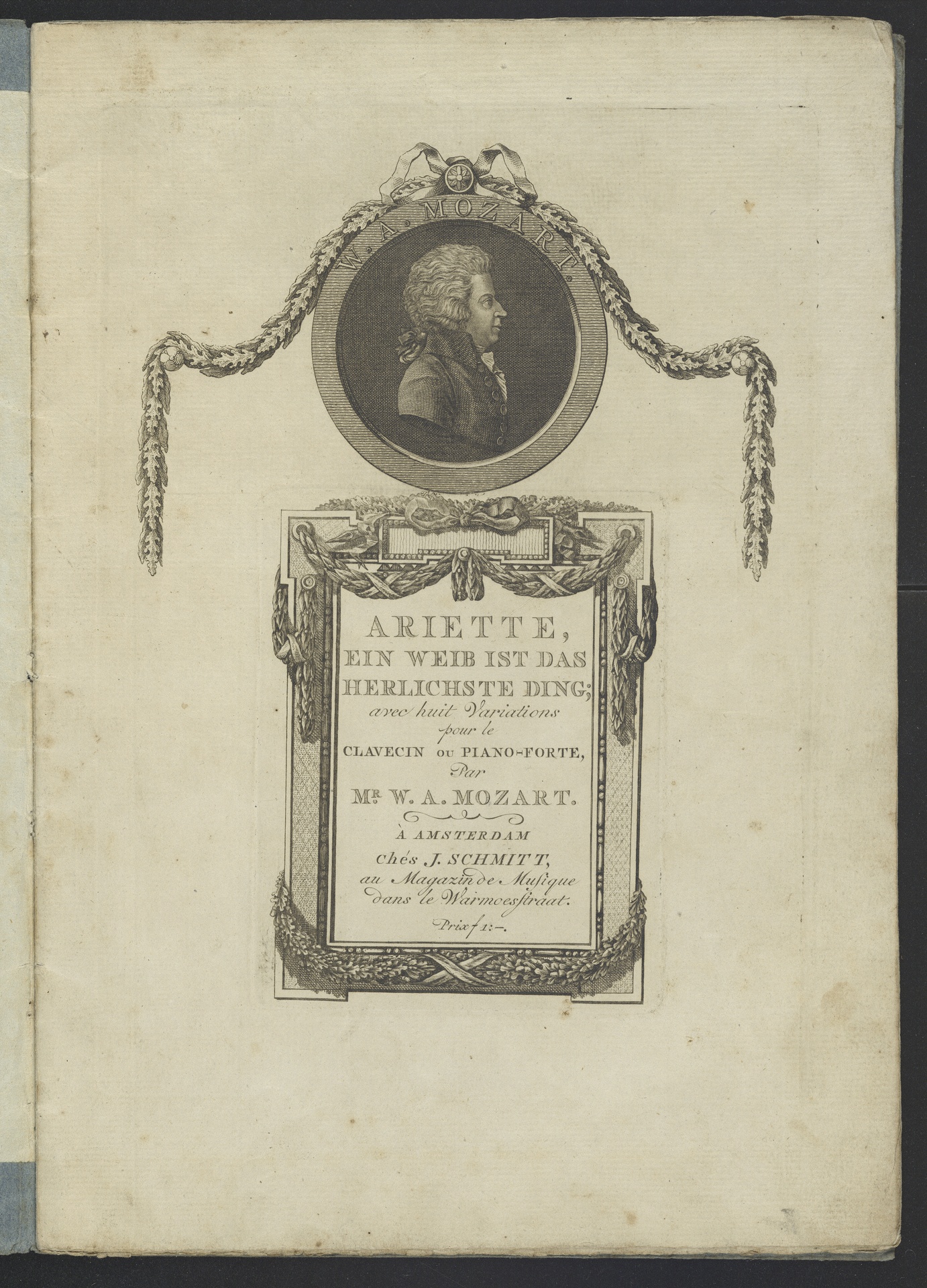 Wolfgang Amadeus Mozart (1756-1791) - Stich nach einem Stich von Johann Georg Mansfeld aus dem Jahr 1789 nach einem Relief von Leonhard Posch von 1788/1789, Titelvignette, erschienen bei Schmitt, Amsterdam, um 1795
