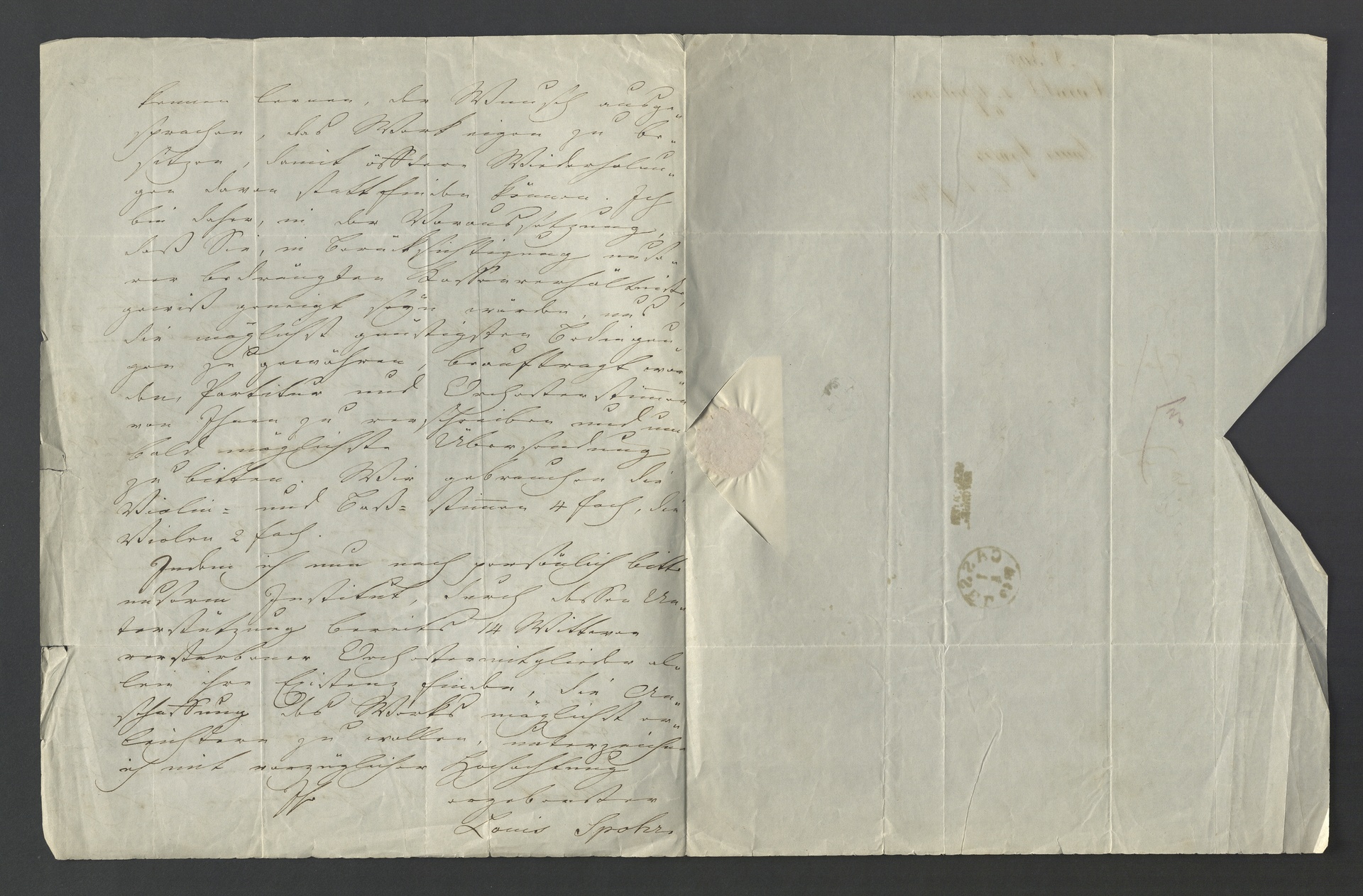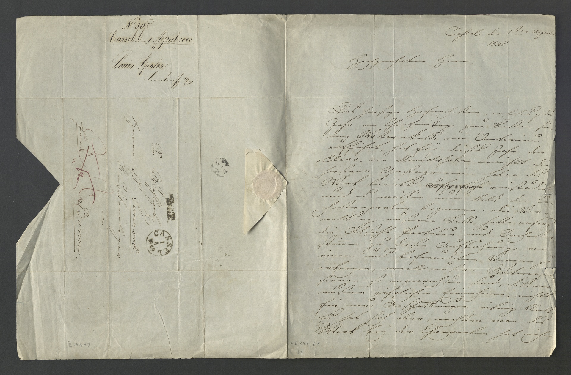 Text: "Hochgeehrter Herr, Das hiesige Hoforchester, welches jedes Jahr am Charfreitage zum besten seiner Witwenkasse ein Oratorium aufführt, hat für dieses Jahr den "Elias" von Mendelssohn erwählt. Die hiesigen Gesangvereine haben das Werk bereits einstudirt und es müssen nun bald die Orchesterproben beginnen. Die Verwaltung unserer Kasse hatte anfangs die Absicht, Partitur und Orchesterstimmen zu dieser Aufführung von einem uns befreundeten Verein zu erborgen, weil unsere Witwenpensionen so angewachsen sind, daß von unsern jährlichen Einnahmen nichts für neue Anschaffungen übrig bleibt. Es hat sich aber, nachdem man das Werk bey den Chorproben hat näher kennen lernen, der Wunsch ausgesprochen, das Werk eigen zu besitzen, damit öfftere Wiederholungen davon stattfinden können. Ich bin daher, in der Voraussetzung, daß Sie, in Berücksichtigung unserer bedrängten Kassenverhältnisse, gewiß geneigt seyn würden, uns die möglichst günstigsten Bedingungen zu gewähren, beauftragt worden, Partitur und Orchesterstimmen von Ihnen zu verschreiben und um bald möglichste Übersendung zu bitten. Wir gebrauchen die Violin- und Baß-stimmen 4fach und die Violen 2fach. Indem ich nun noch persönlich bitte, unserm Institut, durch dessen Unterstützung bereits 14 Wittwen verstorbener Orchestermitglieder allein ihre Existenz finden, die Anschaffung des Werks möglichst erleichtern zu wollen, unterzeichne ich mit vorzüglicher Hochachtung Ihr ergebenster Louis Spoh". Karl Traugott Goldbach, Spohr-Briefe: <http://bit.ly/1UsUXDj>
