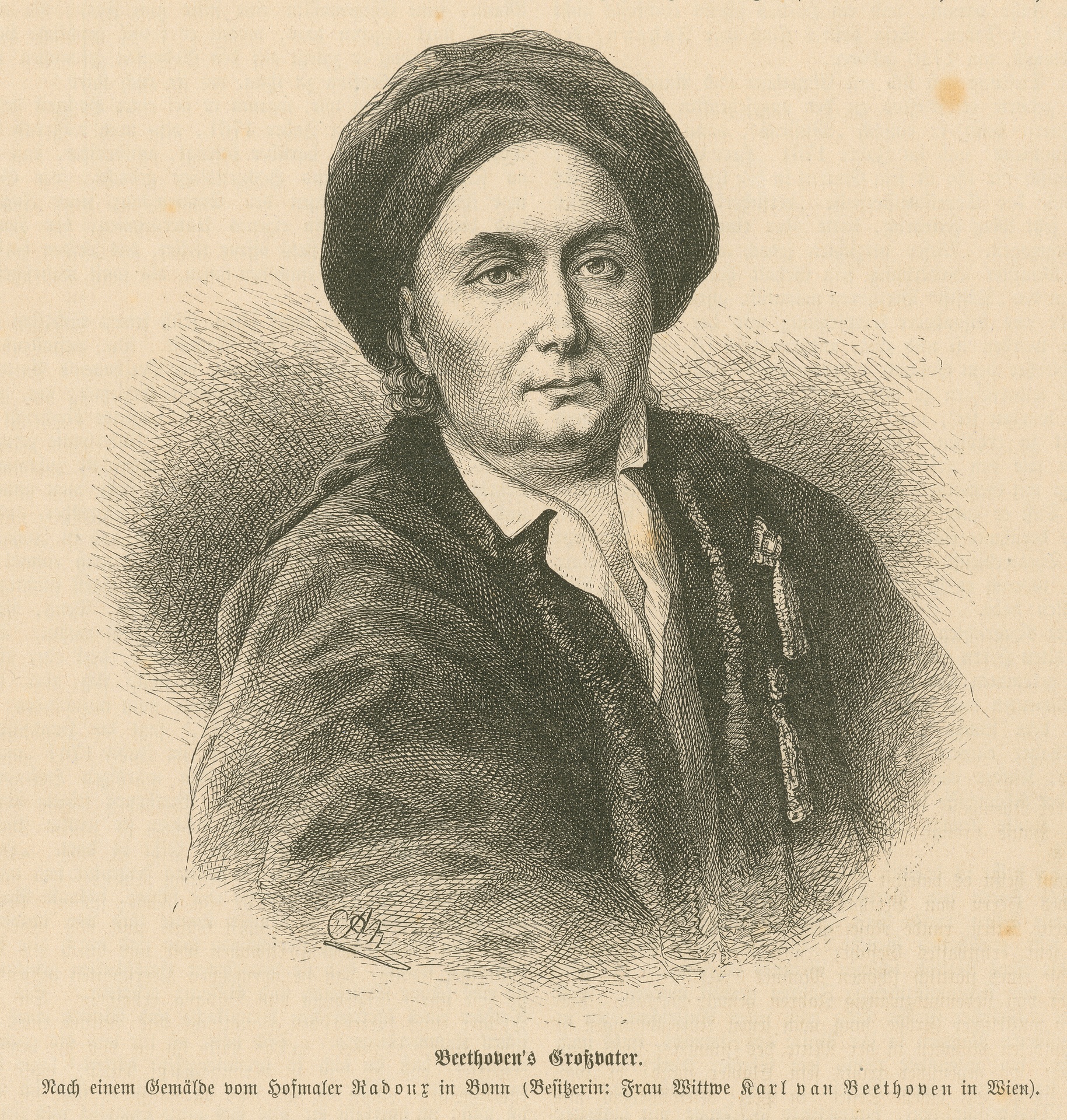 Im Dezember 1770 wurde Ludwig van Beethoven d.Ä. einer der beiden Taufpaten seines Enkels Ludwig. Bereits drei Jahre später starb er. Beethoven liebte und verehrte seinen Großvater Zeit seines Lebens. Auch an seinem Portrait, das von einem der Bonner Hofmaler gemalt wurde, hing er sehr. So ließ er sich das Bild im Jahr 1801 von Bonn nach Wien schicken und führte es von nun an bei allen seinen Umzügen mit sich. (S.B.)