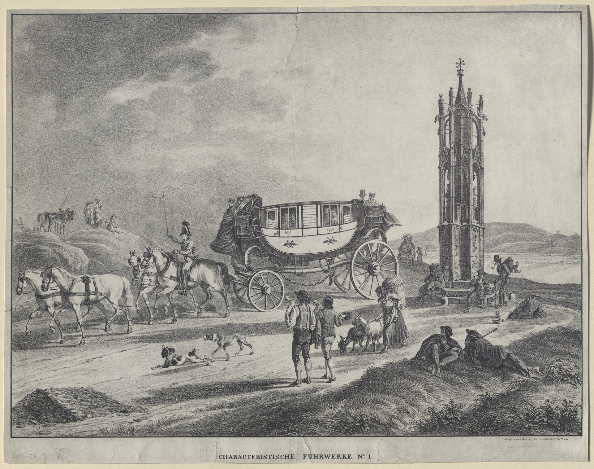 Vierspännige, mit Reisenden besetzte Postkutsche unterwegs nach Wien - Lithographie von Joseph Trentsensky, vermutlich nach einer eigenen Zeichnung, Wien, um 1827