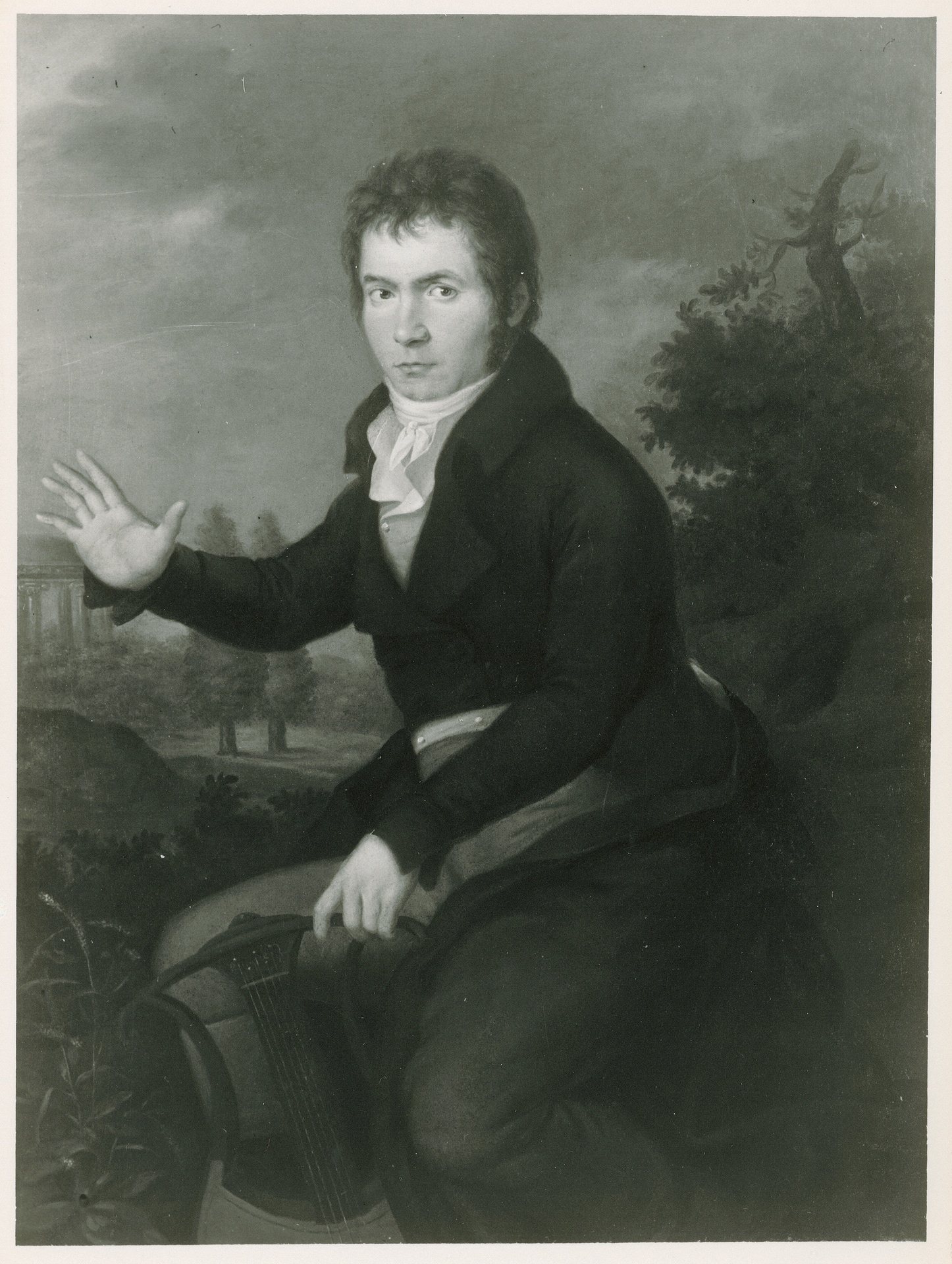 Als einziges unter den authentischen Beethoven-Bildnissen zeigt dieses Gemälde den Komponisten in ganzer Figur. Beethoven sitzt in einer idyllischen Landschaft, in der im Hintergrund ein antiker Tempel zu sehen ist. In der linken Hand hält er die Leier, das Attribut des Musengottes Apoll, die Rechte ist in einer fast beschwörenden Geste dem Betrachter entgegengestreckt.