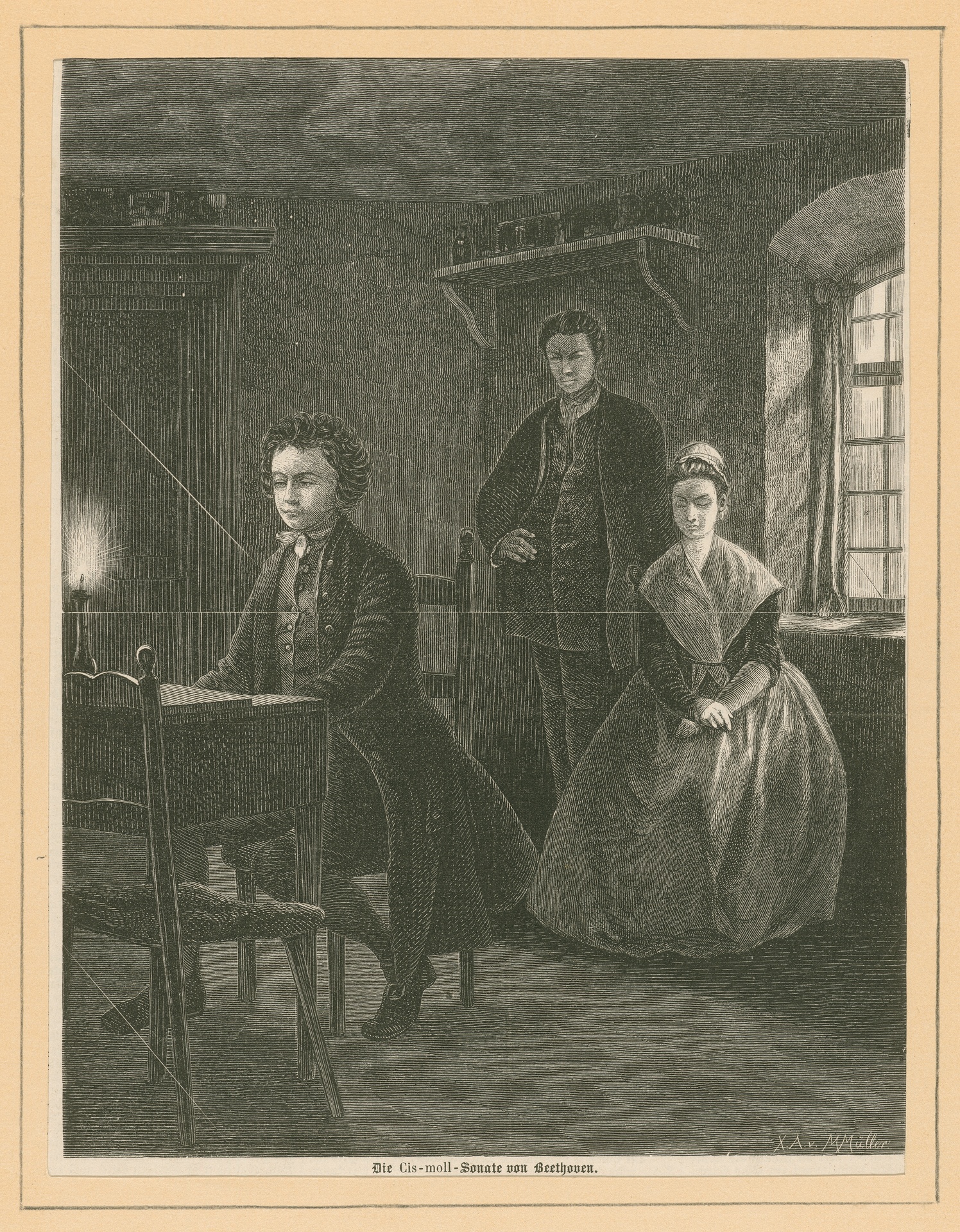 "Die cis-Moll-Sonate von Beethoven" oder "Beethoven und die Blinde" - Holzstich von M. Müller