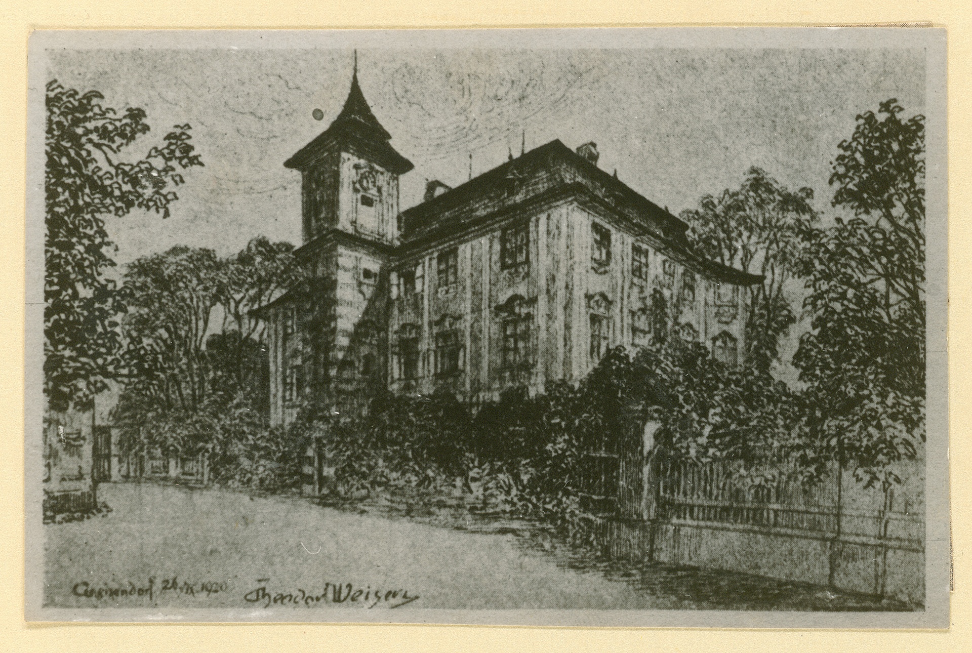 Gneixendorf, Schloss Gneixendorf (Wasserhof), Wohnung von Nikolaus Johann van Beethoven - Radierung von Theodor Weiser nach einer eigenen Zeichnung, anonyme Fotografie, um 1920?