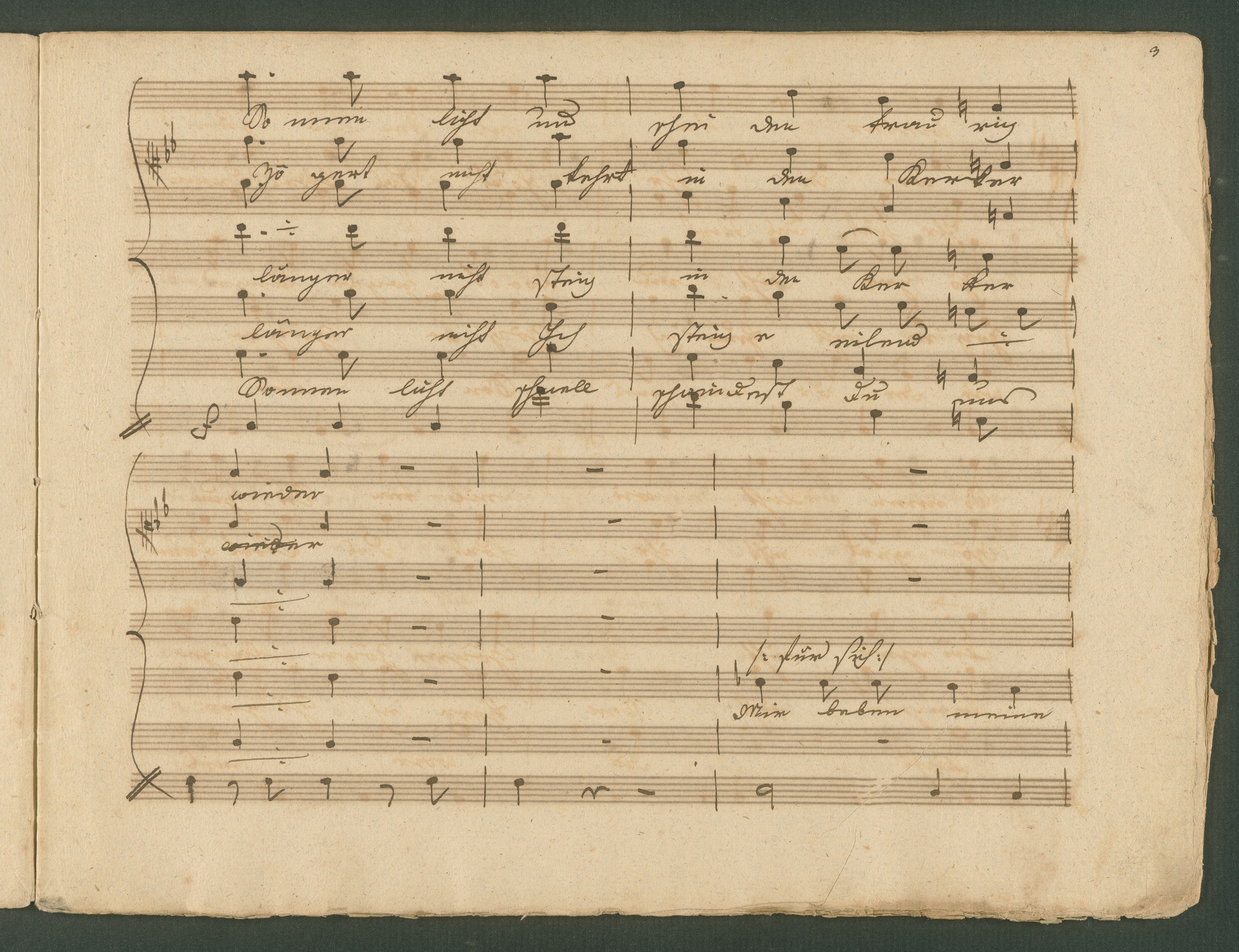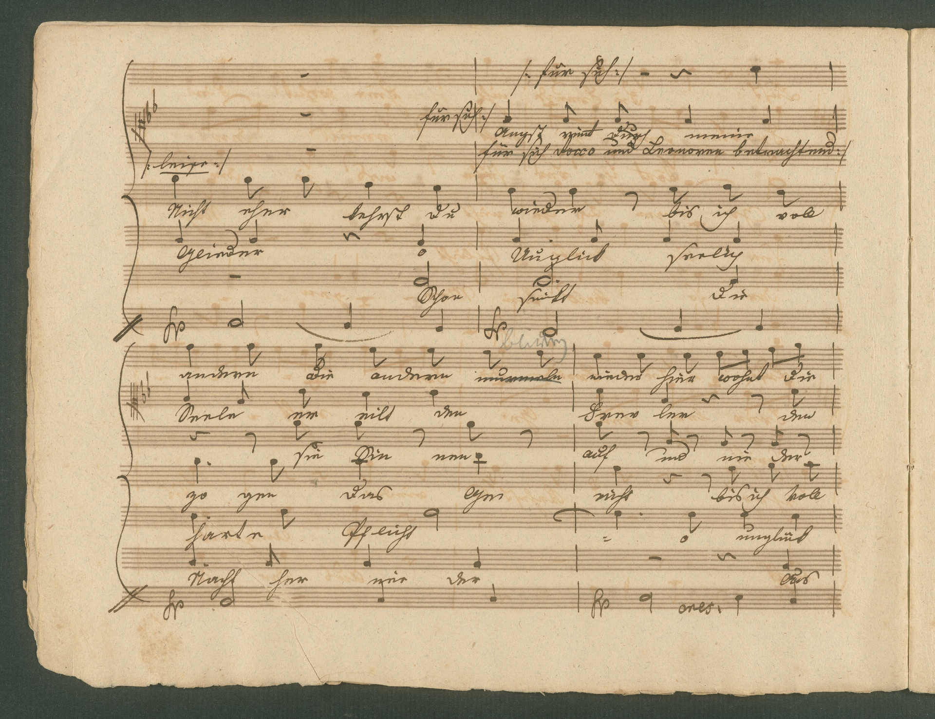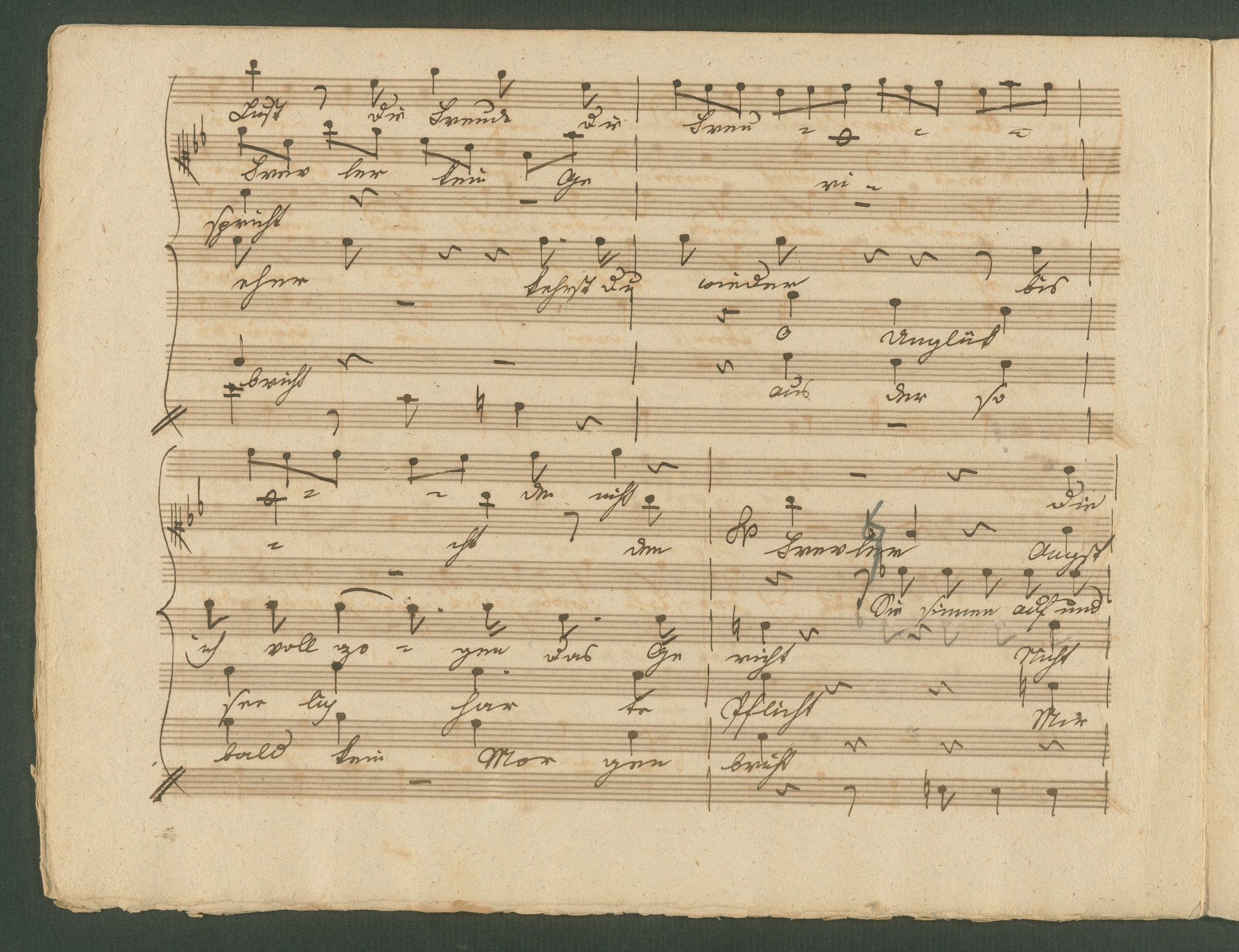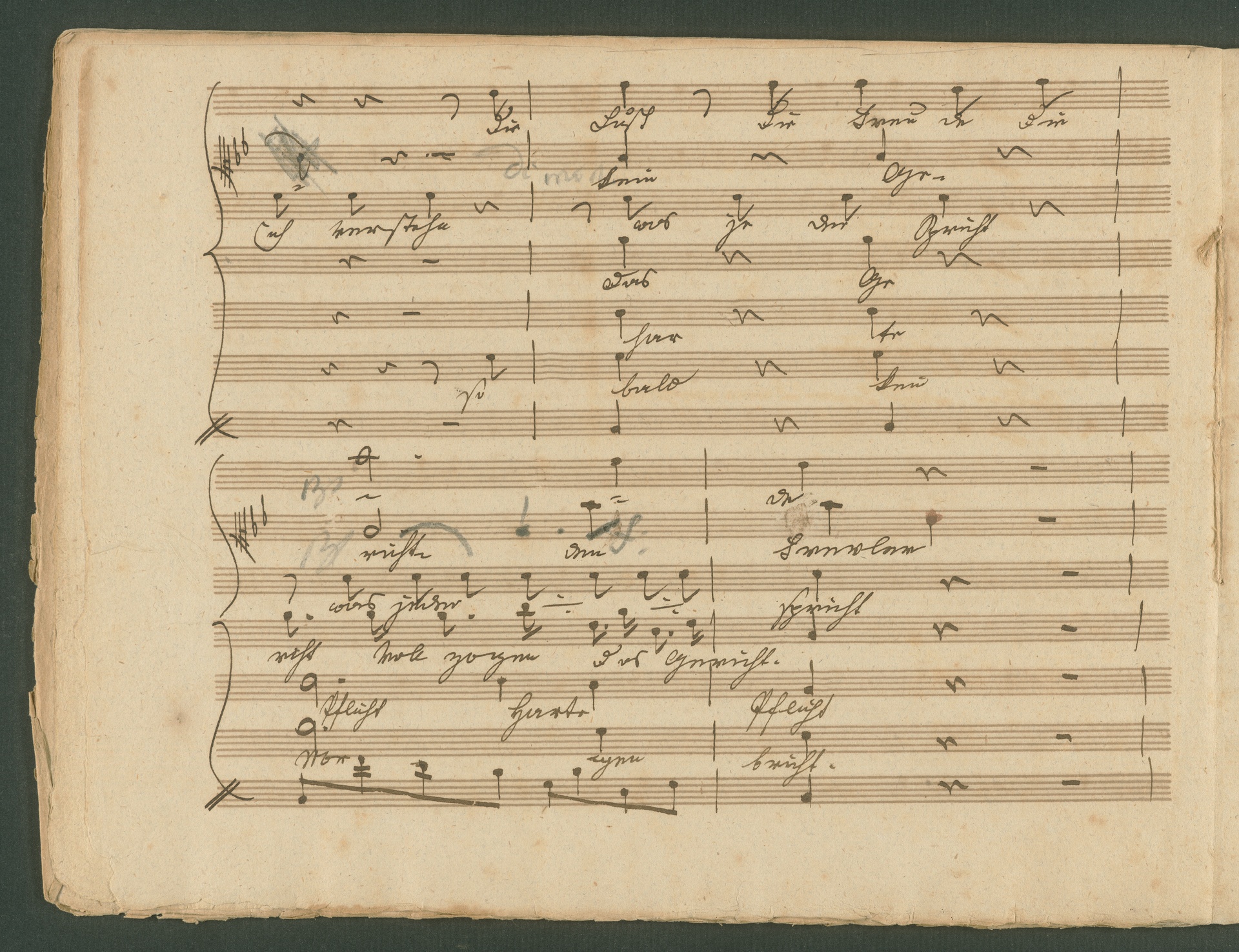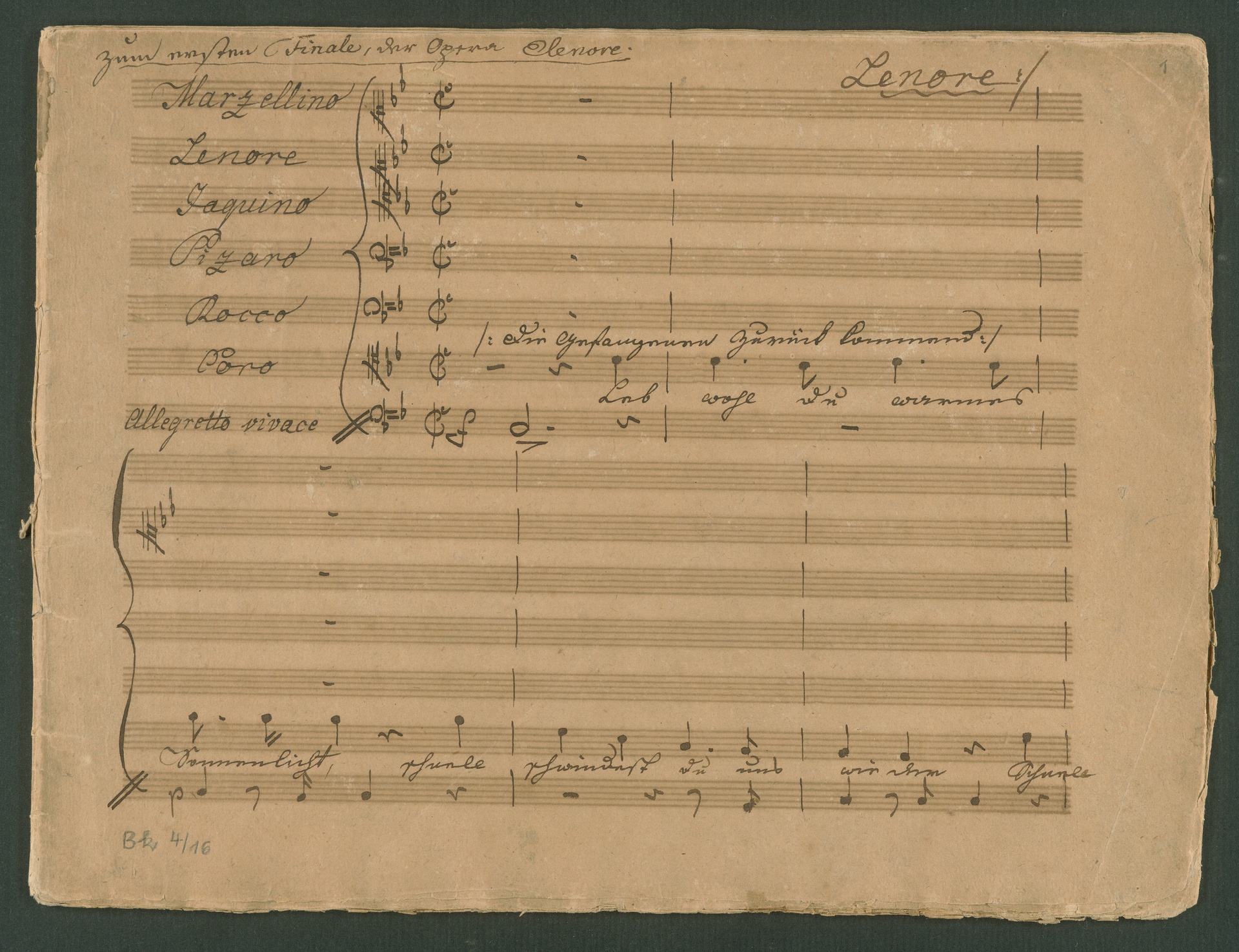 1805 fand die Uraufführung von Beethovens einziger Oper "Fidelio" statt. Für eine zweite Aufführung 1806 überarbeitete er diese. 1814 sollte eine weitere Aufführung erfolgen, die den Komponisten erneut zu einer Revision veranlasste. Diese letzte Überarbeitung gelang endlich, sie wurde schon 1814 viele Male aufgeführt und berühmt. Die Umarbeitungen nahmen viel Zeit und Mühe in Anspruch. Beethoven feilte bis ins kleinste Detail immer wieder an seinem Werk und war oft mit dem Ergebnis immer noch nicht zufrieden. "übrigens ist die ganze Sache mit der oper die Mühsamste von der Welt, denn ich bin mit dem meisten unzufrieden - und - Es ist beynahe kein Stück - woran nicht hier und da meiner jezigen unzufriedenheit nicht einige Zufriedenheit hätte anflicken müssen", schreibt er Ende März/Anfang April 1814 an den Librettisten der dritten Fassung, Friedrich Treitschke (BGA 709. Beethoven an Georg Friedrich Treitschke, Wien, vor dem 5. April 1814). Hier sehen wir eines der korrigierten Stücke: das Finale zum ersten Akt in einer Partitur für Singstimmen. Die Abschrift wurde von Beethoven überprüft, seine Korrekturen schrieb er in Bleistift. (J.R.)