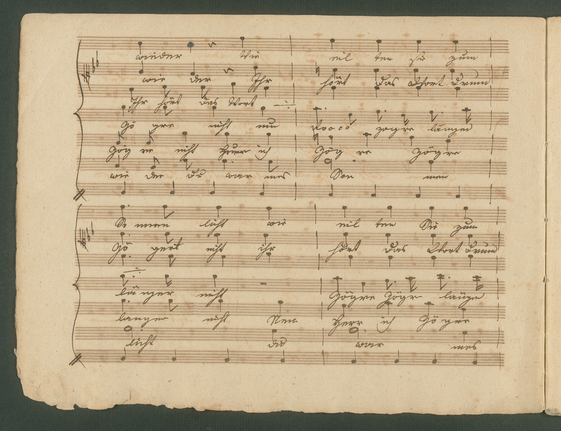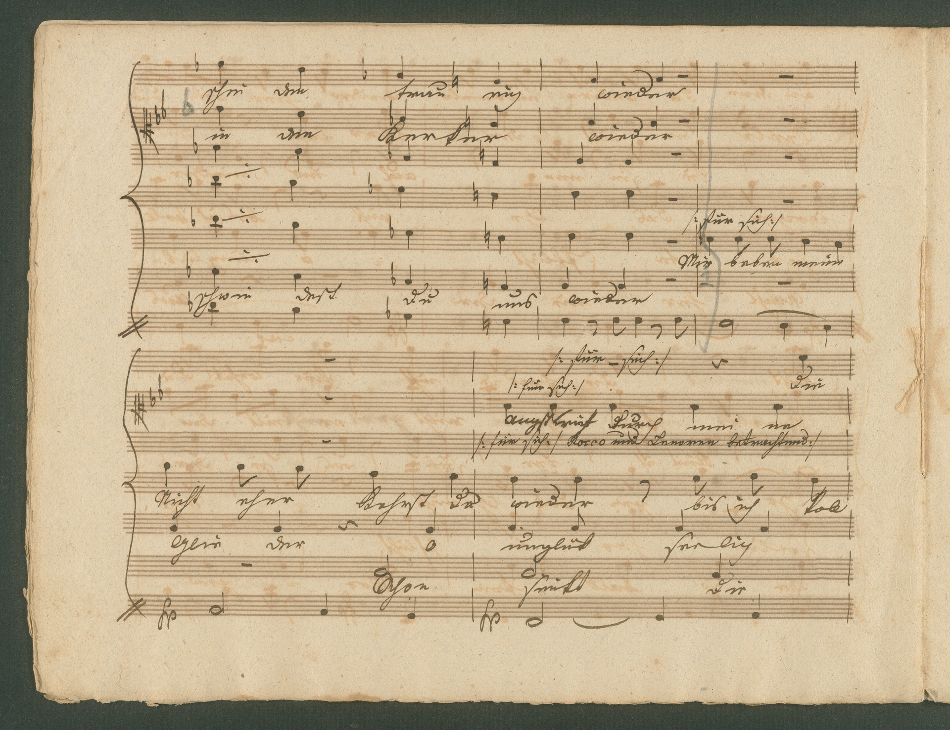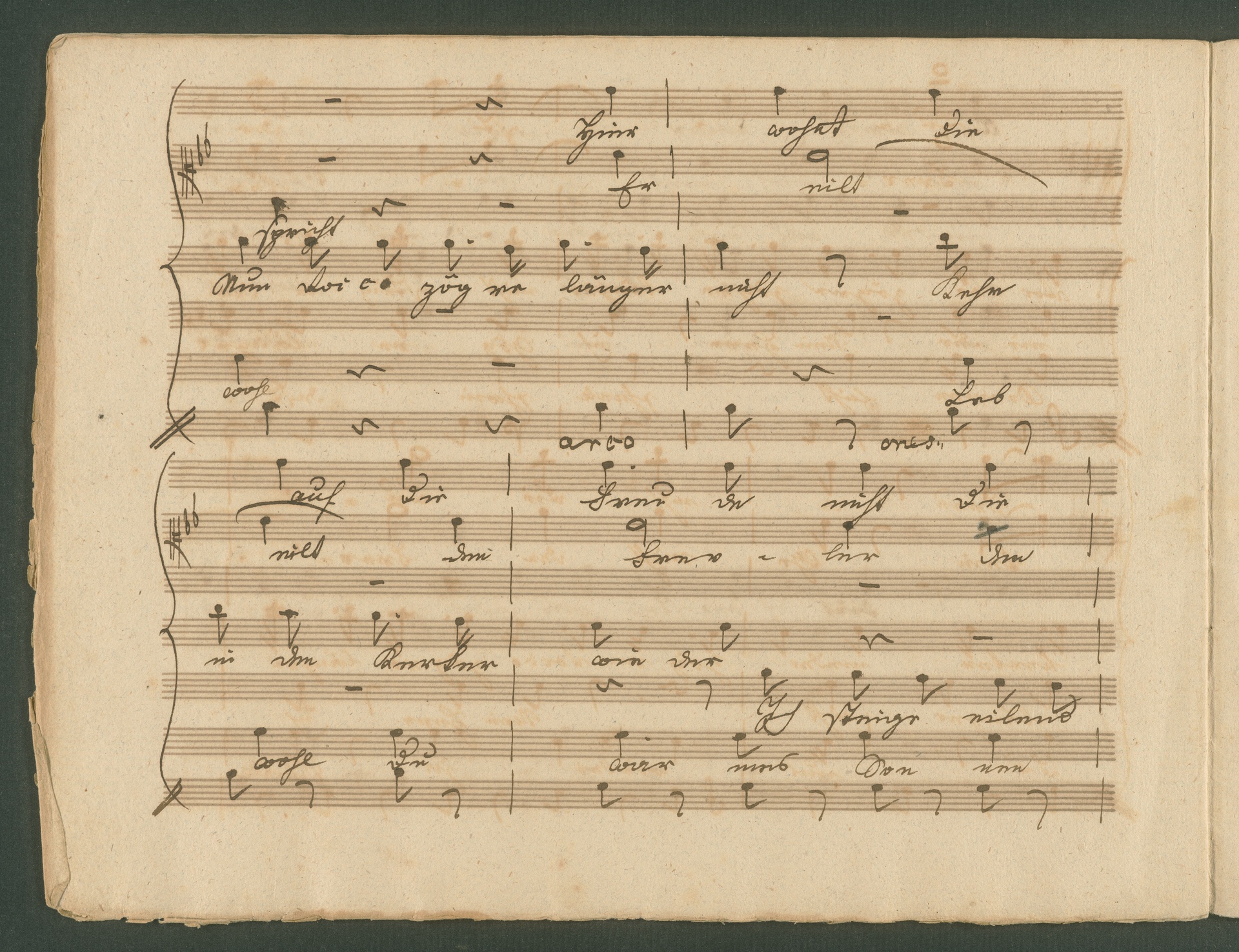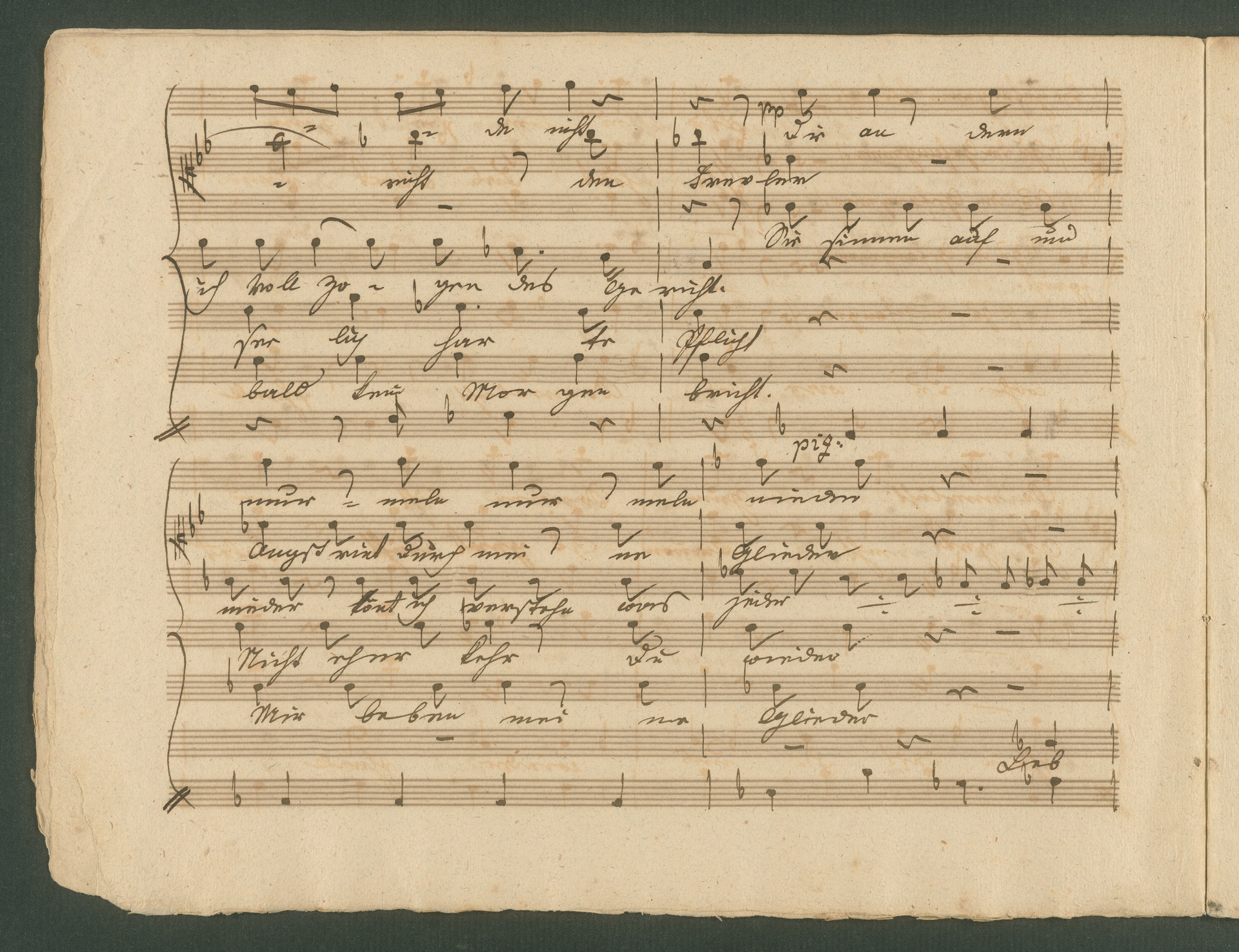 1805 fand die Uraufführung von Beethovens einziger Oper "Fidelio" statt. Für eine zweite Aufführung 1806 überarbeitete er diese. 1814 sollte eine weitere Aufführung erfolgen, die den Komponisten erneut zu einer Revision veranlasste. Diese letzte Überarbeitung gelang endlich, sie wurde schon 1814 viele Male aufgeführt und berühmt. Die Umarbeitungen nahmen viel Zeit und Mühe in Anspruch. Beethoven feilte bis ins kleinste Detail immer wieder an seinem Werk und war oft mit dem Ergebnis immer noch nicht zufrieden. "übrigens ist die ganze Sache mit der oper die Mühsamste von der Welt, denn ich bin mit dem meisten unzufrieden - und - Es ist beynahe kein Stück - woran nicht hier und da meiner jezigen unzufriedenheit nicht einige Zufriedenheit hätte anflicken müssen", schreibt er Ende März/Anfang April 1814 an den Librettisten der dritten Fassung, Friedrich Treitschke (BGA 709. Beethoven an Georg Friedrich Treitschke, Wien, vor dem 5. April 1814). Hier sehen wir eines der korrigierten Stücke: das Finale zum ersten Akt in einer Partitur für Singstimmen. Die Abschrift wurde von Beethoven überprüft, seine Korrekturen schrieb er in Bleistift. (J.R.)