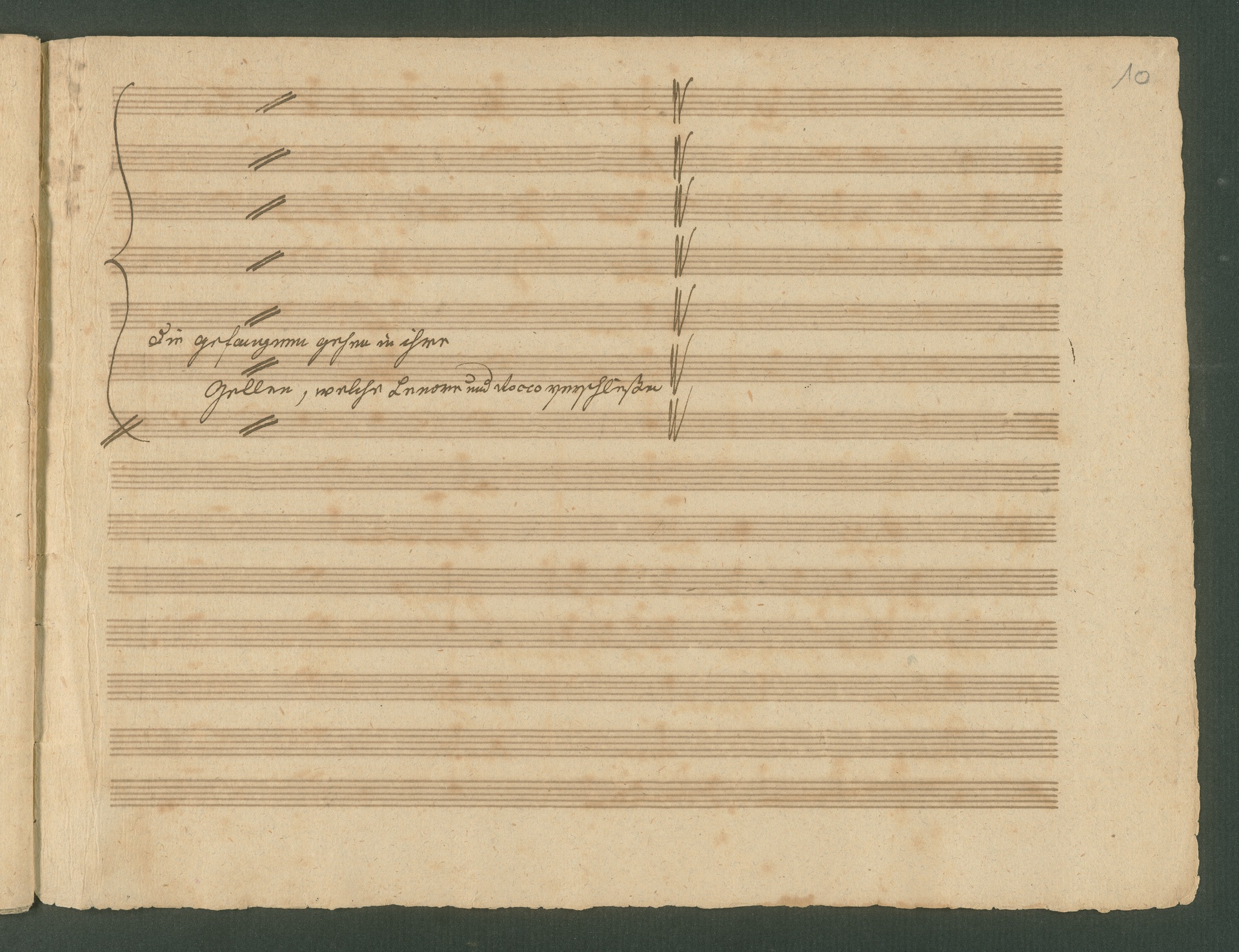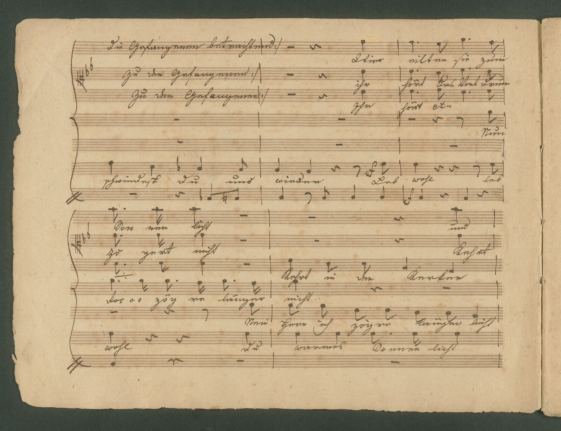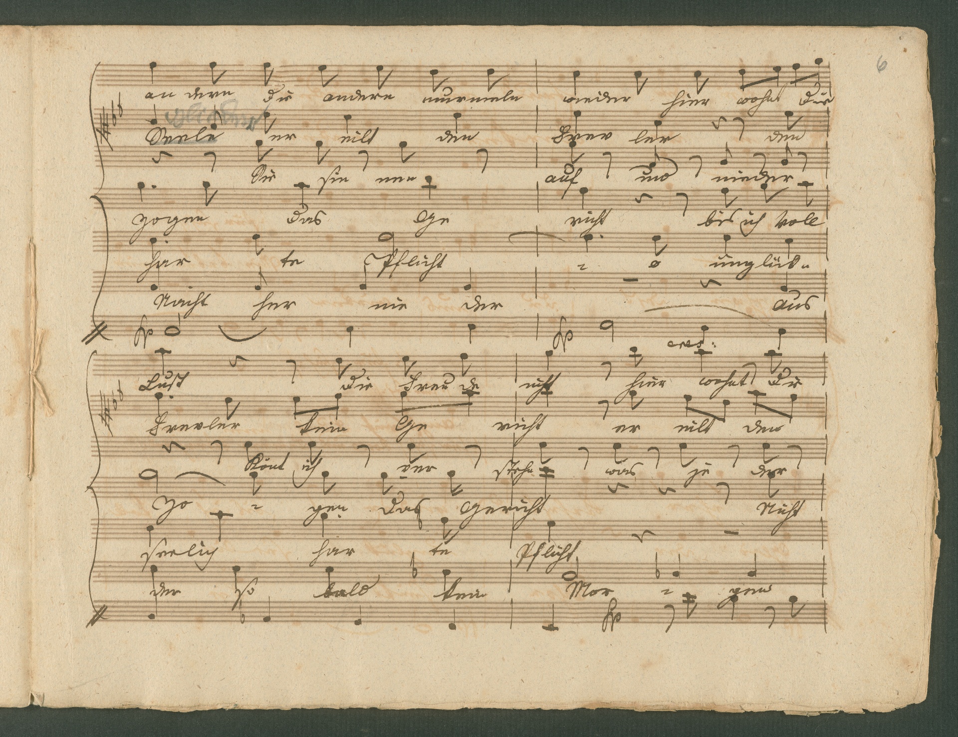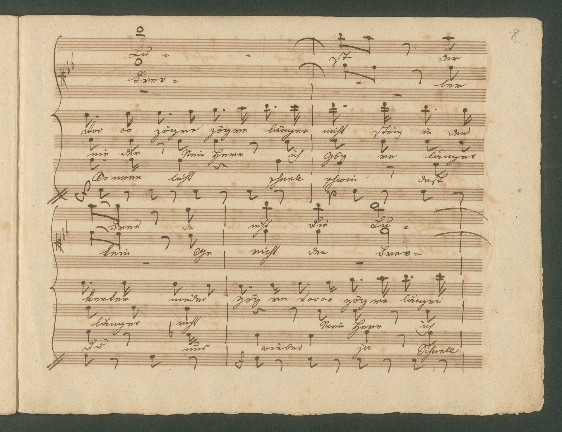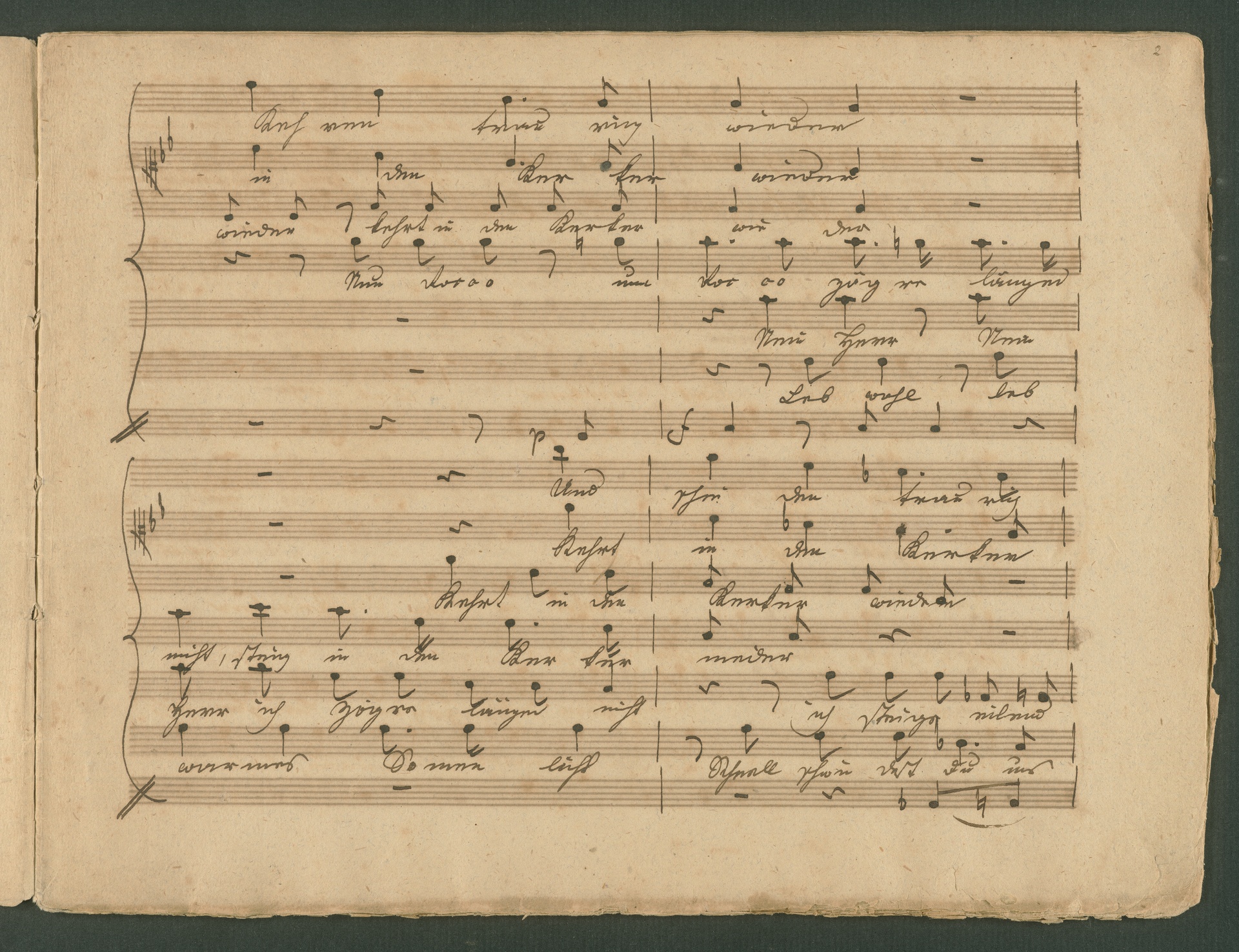 1805 fand die Uraufführung von Beethovens einziger Oper "Fidelio" statt. Für eine zweite Aufführung 1806 überarbeitete er diese. 1814 sollte eine weitere Aufführung erfolgen, die den Komponisten erneut zu einer Revision veranlasste. Diese letzte Überarbeitung gelang endlich, sie wurde schon 1814 viele Male aufgeführt und berühmt. Die Umarbeitungen nahmen viel Zeit und Mühe in Anspruch. Beethoven feilte bis ins kleinste Detail immer wieder an seinem Werk und war oft mit dem Ergebnis immer noch nicht zufrieden. "übrigens ist die ganze Sache mit der oper die Mühsamste von der Welt, denn ich bin mit dem meisten unzufrieden - und - Es ist beynahe kein Stück - woran nicht hier und da meiner jezigen unzufriedenheit nicht einige Zufriedenheit hätte anflicken müssen", schreibt er Ende März/Anfang April 1814 an den Librettisten der dritten Fassung, Friedrich Treitschke (BGA 709. Beethoven an Georg Friedrich Treitschke, Wien, vor dem 5. April 1814). Hier sehen wir eines der korrigierten Stücke: das Finale zum ersten Akt in einer Partitur für Singstimmen. Die Abschrift wurde von Beethoven überprüft, seine Korrekturen schrieb er in Bleistift. (J.R.)