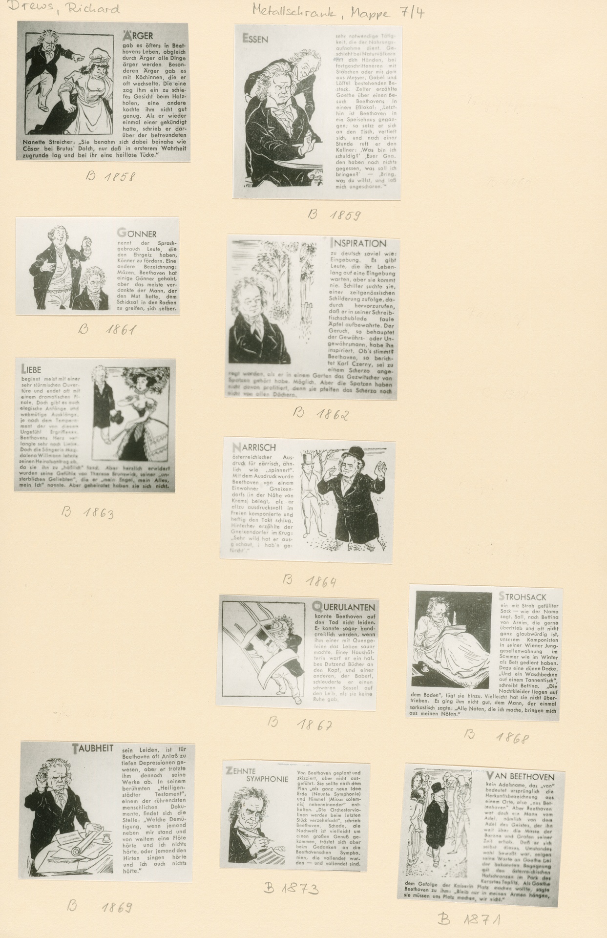 Ludwig van Beethoven, Karikatur aus "Alpha-Beethoven": "Liebe" - Zeichnung und Text von Richard Drews und Peter Reimann, von 1952, Fotografie von Luitgard Hartmann nach einem Reproduktionsdruck, München, um 1985