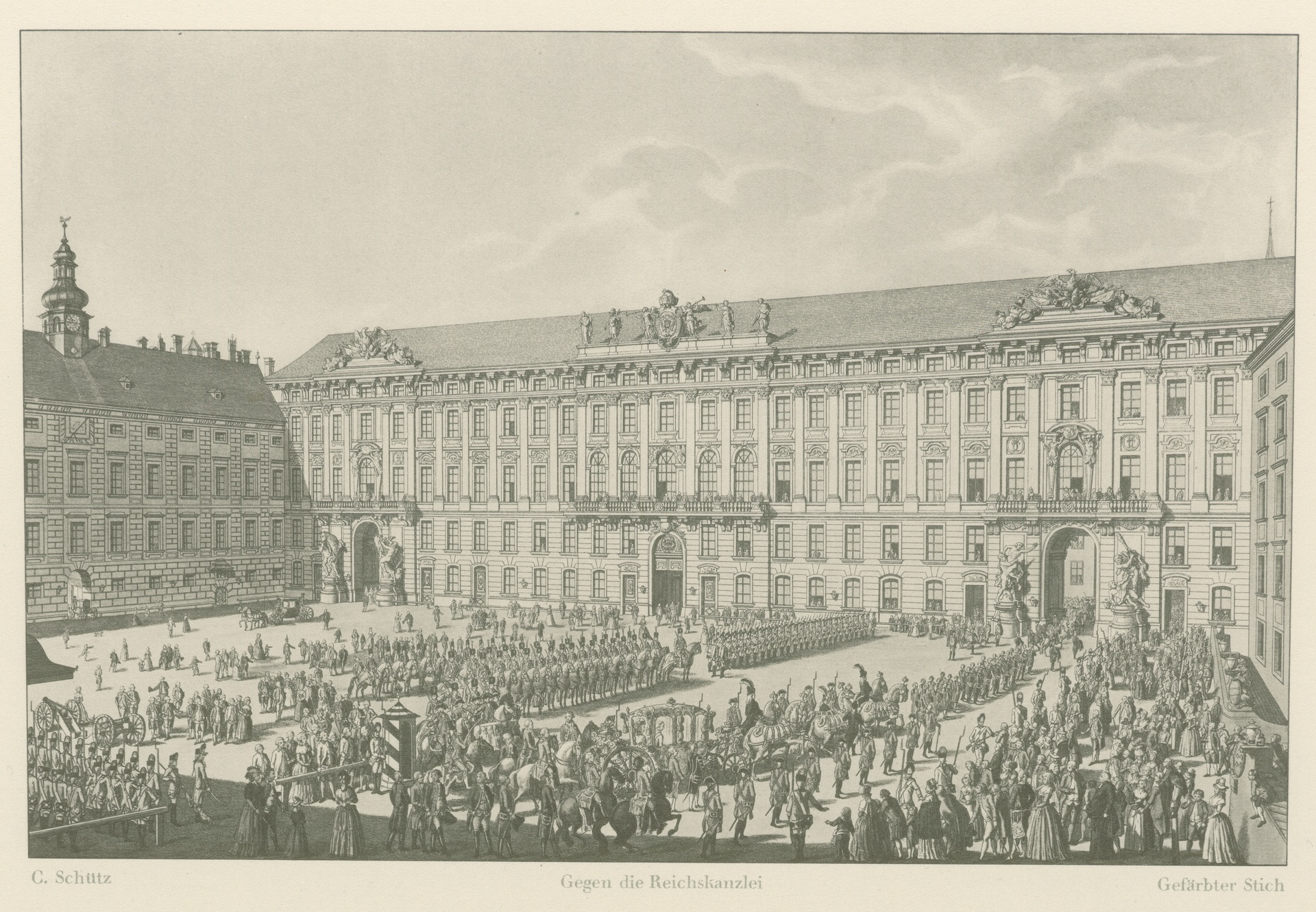 Der Innere Burgplatz in Wien in Richtung auf die Reichskanzlei, um 1780 - Reproduktion eines Stichs von Carl Schütz, Wien, 1929
