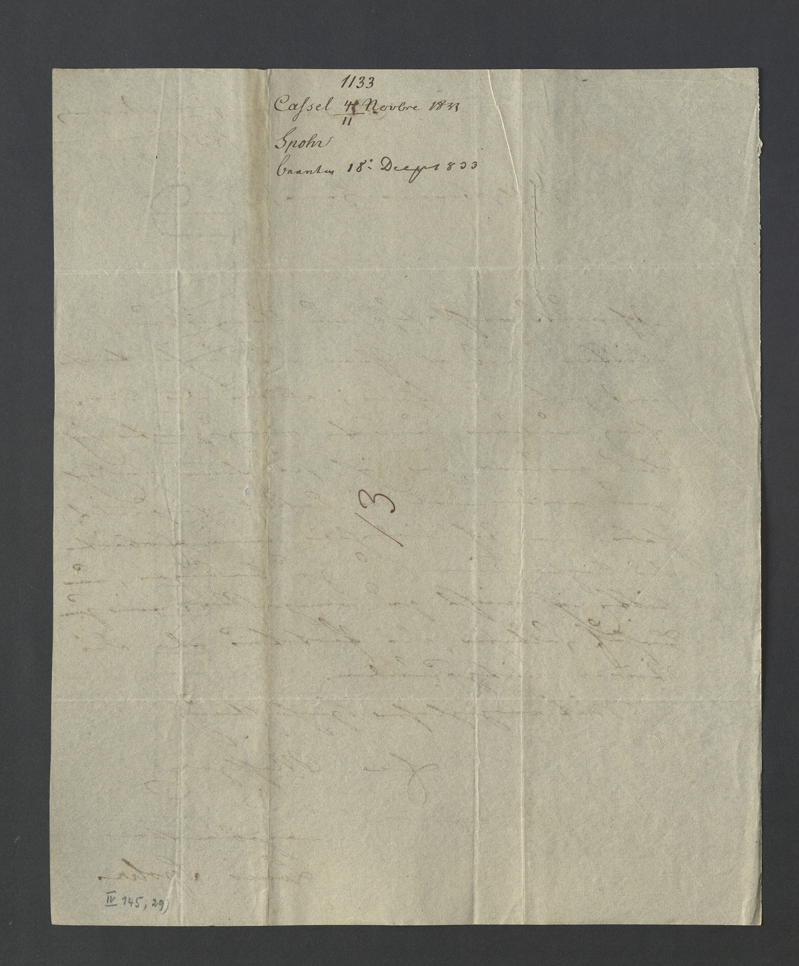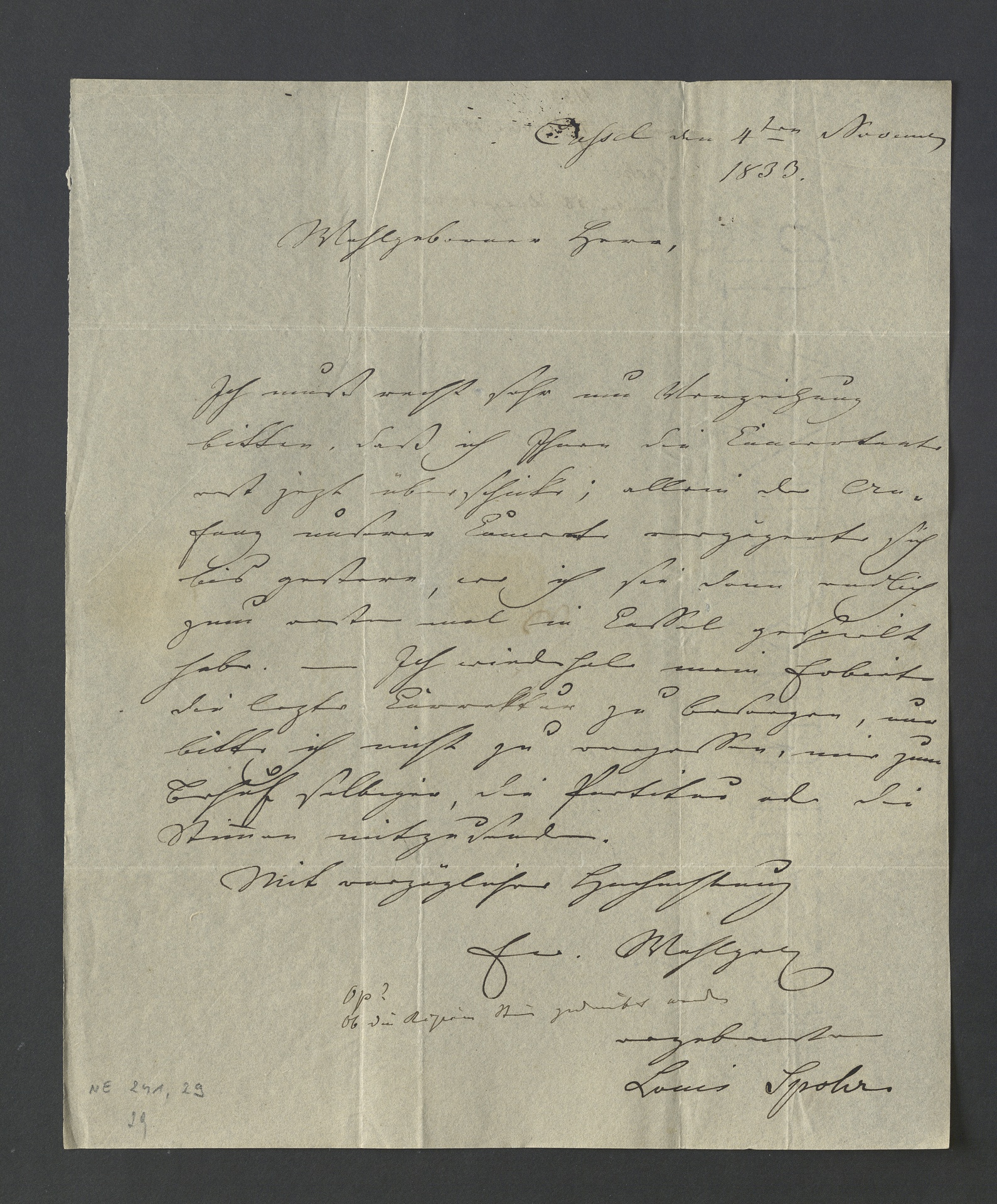 Text: "Wohlgeborner Herr, Ich muß recht sehr um Verzeihung bitten, daß ich Ihnen die Concertante erst jezt überschicke; allein der Anfang unserer Concerte verzögerte sich bis gestern, wo ich sie dann endlich zum ersten mal in Cassel gespielt habe. - Ich wiederhole mein Erbieten die lezte Correktur zu besorgen, nur bitte ich nicht zu vergessen, mir zum Behuf selbiger, die Partitur oder die Stimmen mitzusenden. Mit vorzüglicher Hochachtung Ew. Wohlgeb. ergebenster Louis Spohr". Karl Traugott Goldbach, Spohr-Briefe: <http://bit.ly/1OP9IiV>