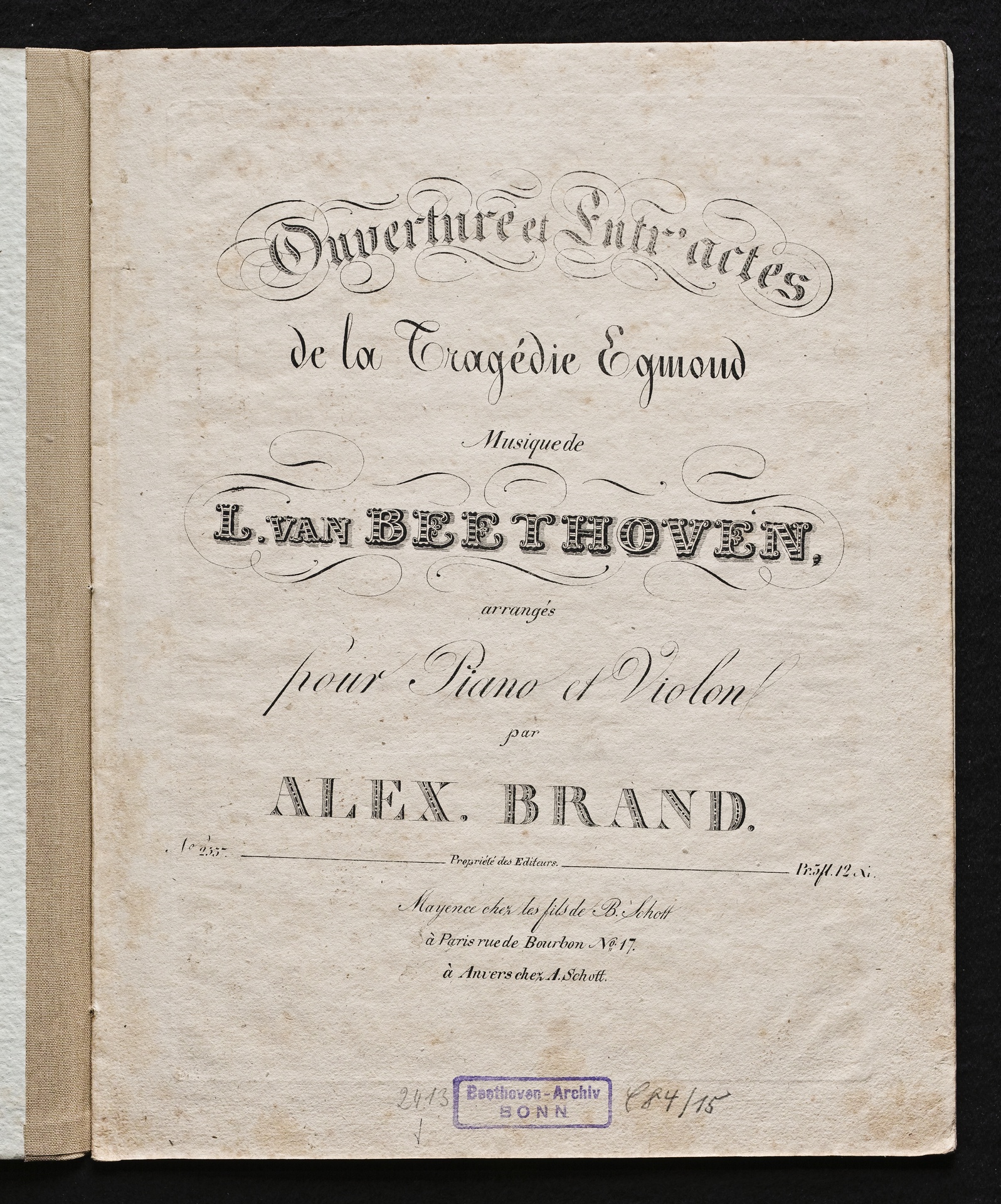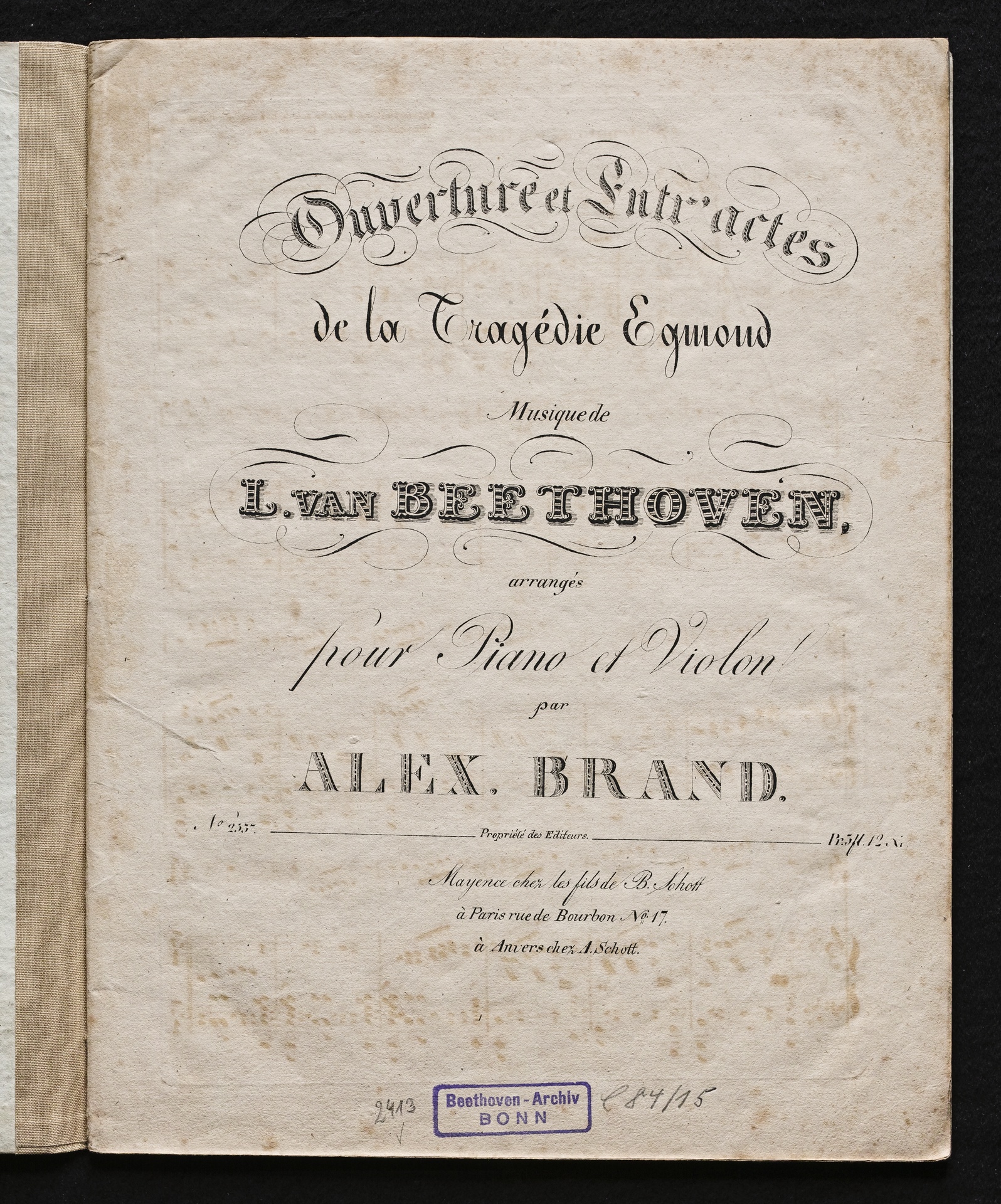 Ludwig van Beethoven, Musik zu Johann Wolfgang von Goethes Trauerspiel "Egmont" op. 84, Bearbeitung für Violine und Klavier von Alexander Brand, Klavierpartitur, Stimme, Schott, 2537